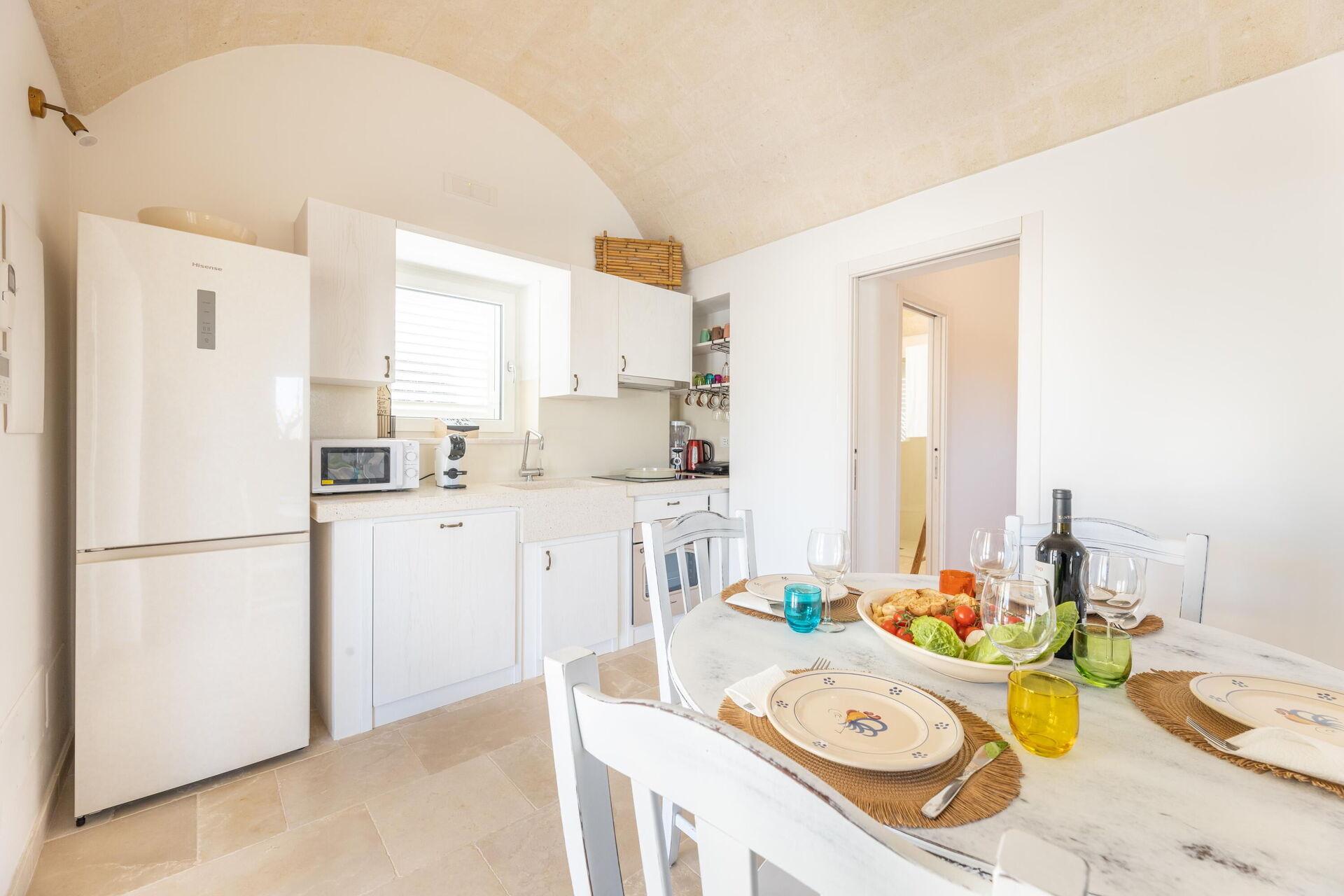 Begane grond: entree en keuken (vaatwasser, magnetron, vriezer en oven) en woonkamer met slaapbank voor twee personen (beschikbaar op aanvraag en tegen betaling); slaapkamer met tweepersoonsbed met eigen badkamer met douche; grote tweepersoonsslaapkamer uitgehouwen uit de trullo; badkamer met douche.