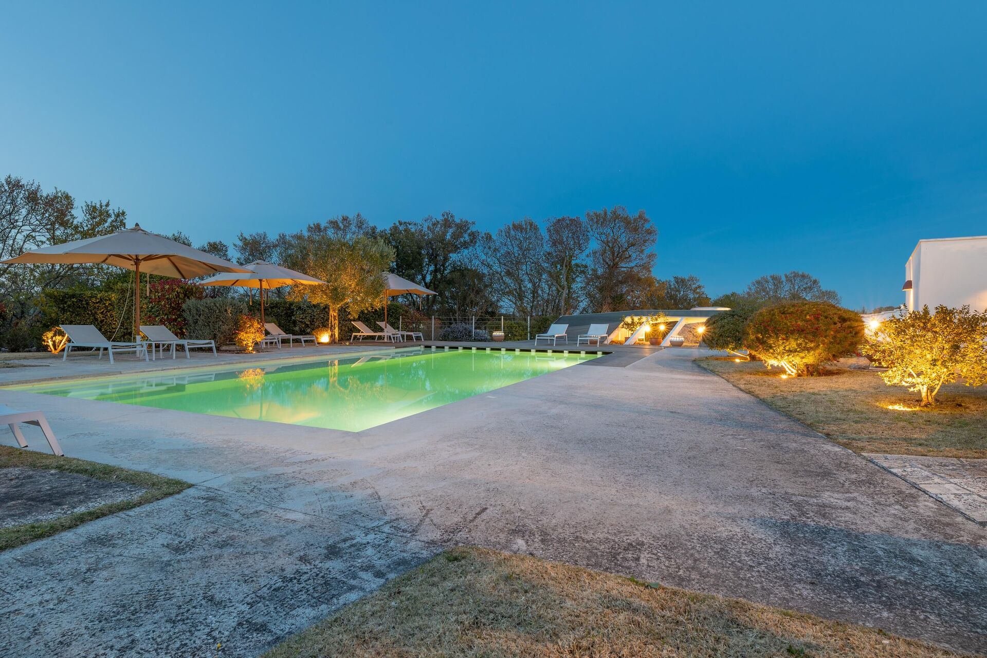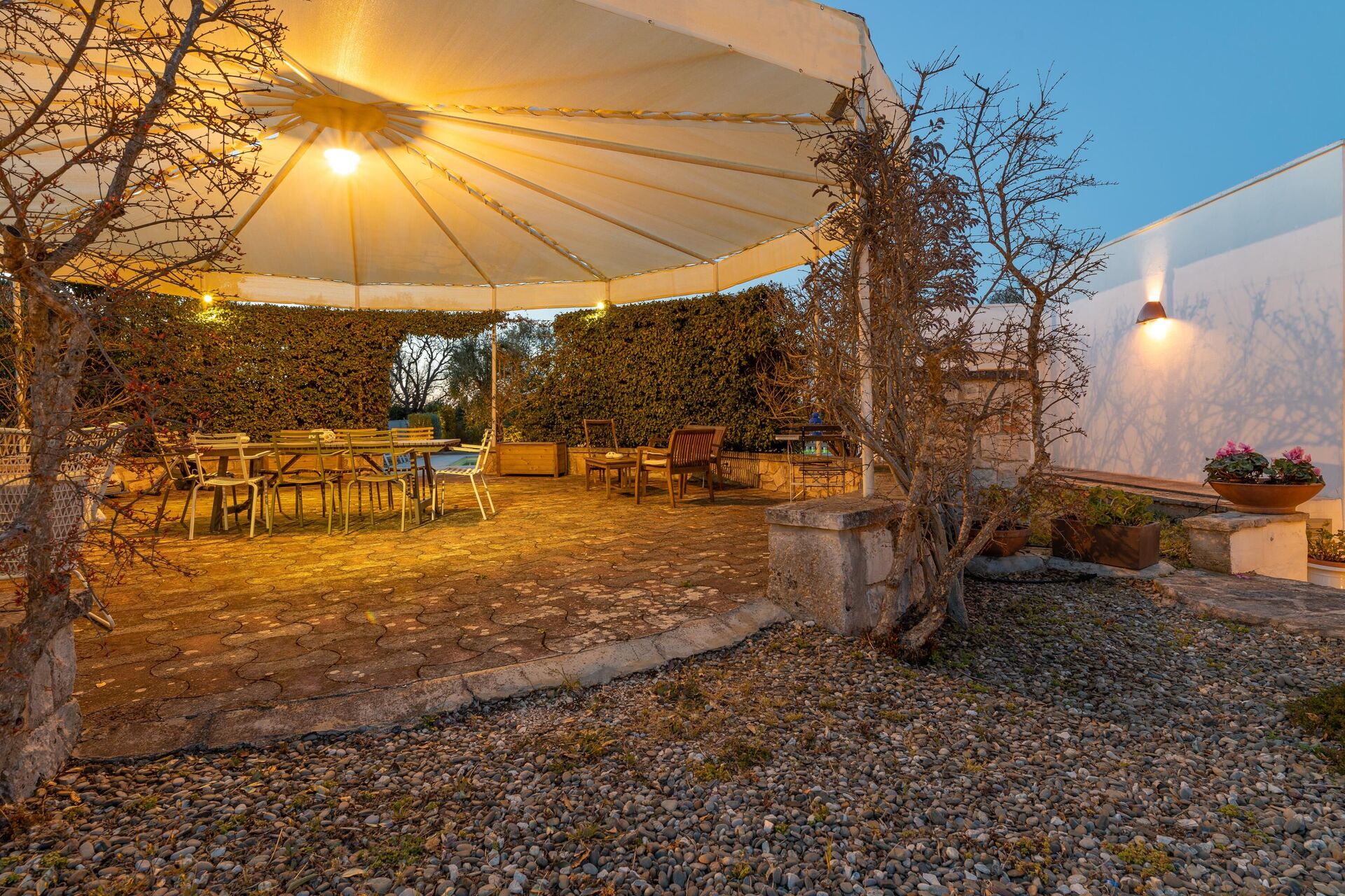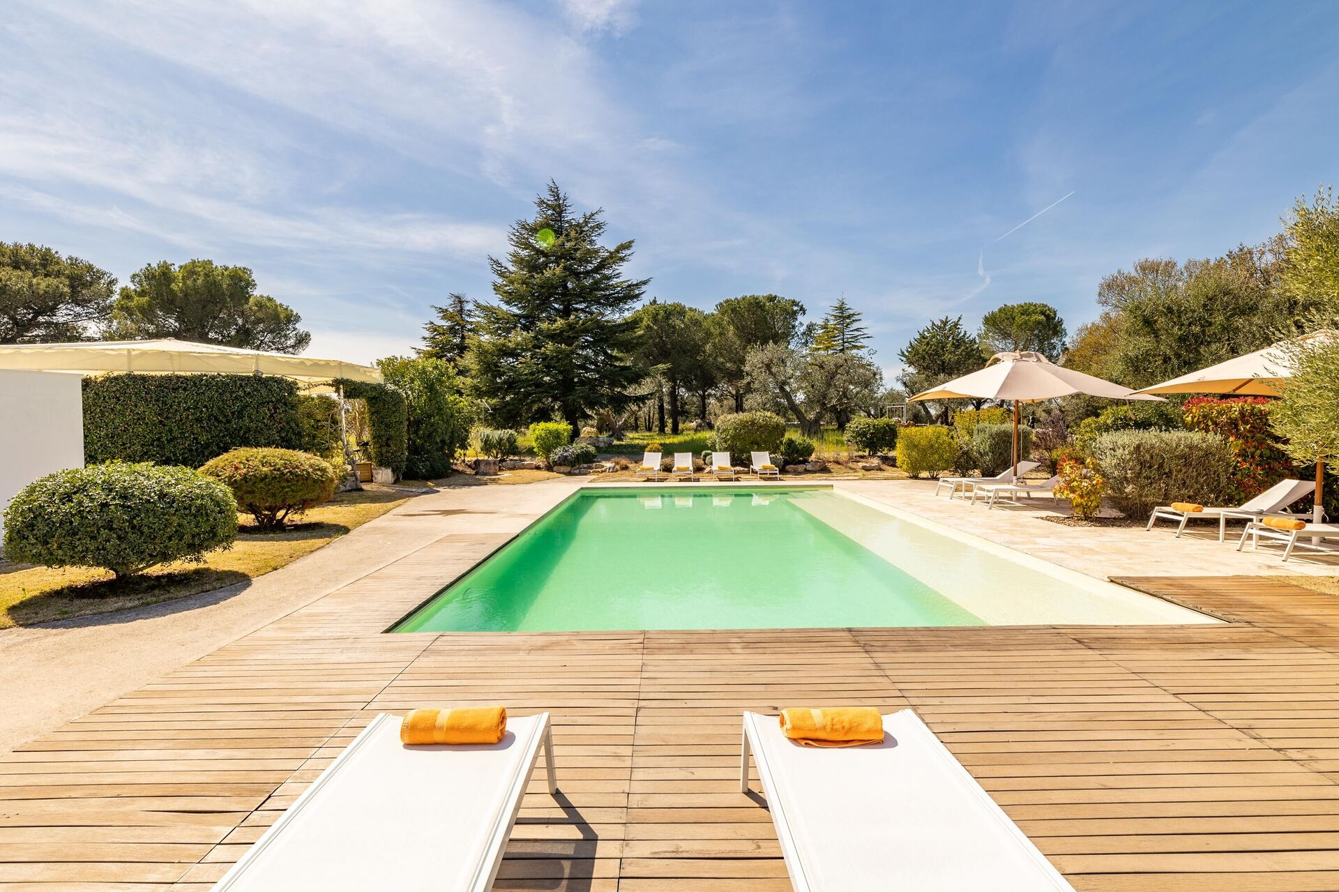Buiten is de unieke locatie omgeven door een grote tuin en ook een kleine kinderspeelplaats. Naast het privézwembad biedt het pand ruime gemeenschappelijke ruimtes om te genieten van de buitenlucht: er is een groot prieel met een eethoek; en een ultramoderne pergola met een heerlijke relaxruimte, een eethoek en een keuken met barbecue.