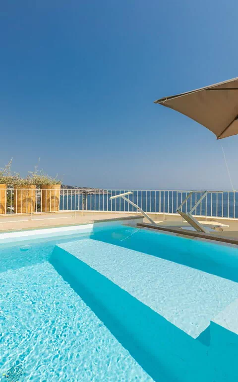 - schilderachtig terras met uitzicht op zee en privézwembad, op aanvraag verwarmbaar (inbegrepen in de prijs) in het voor- en najaar tot ongeveer 26°C (afmetingen 3 meter x 3 meter, diepte 1,3 meter)