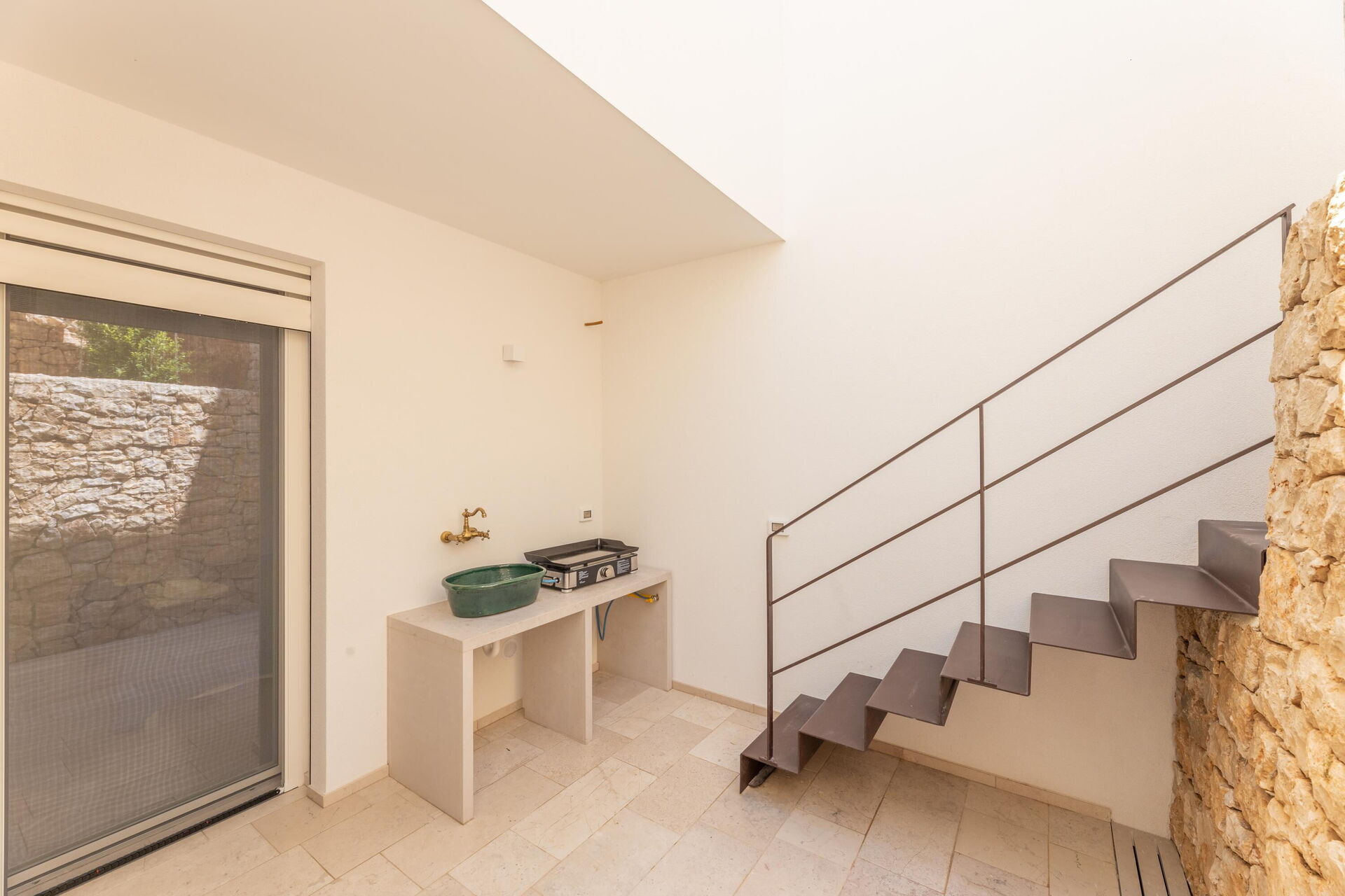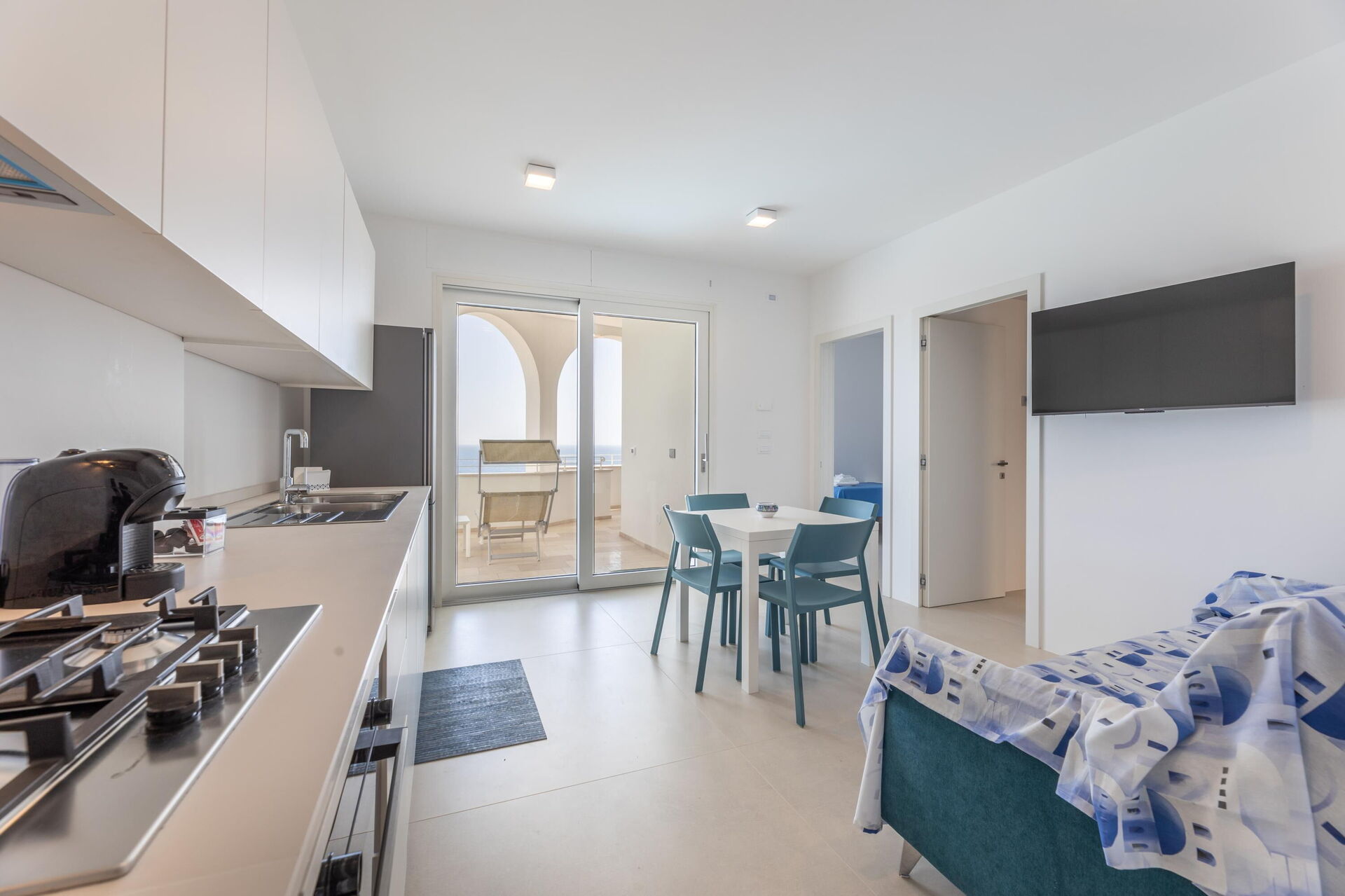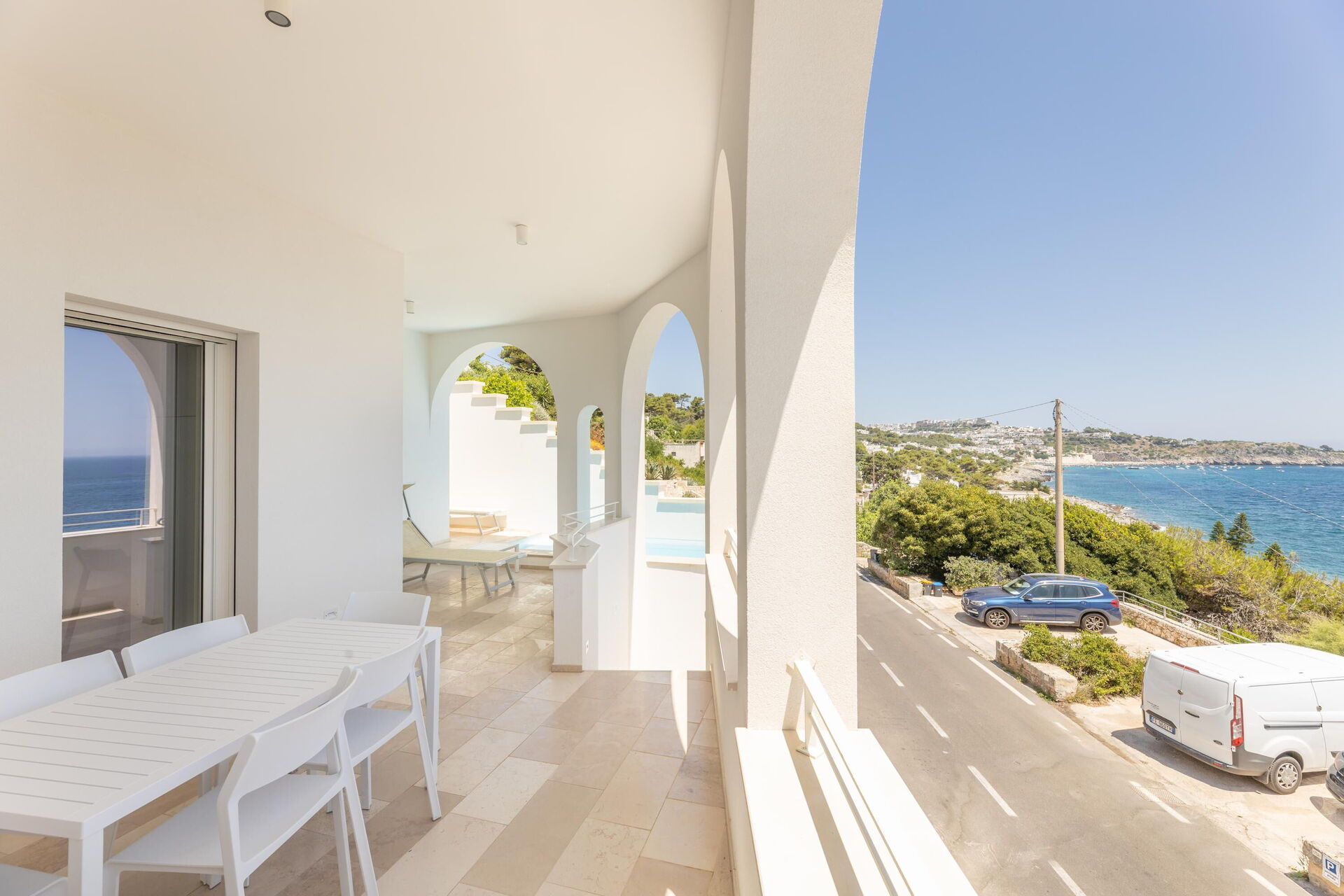 Het appartement beschikt over een schilderachtig overdekt terras met grote, open bogen en een tafel en stoelen om buiten te eten. Er is een privézwembad (verwarming in de lente en de herfst is bij de prijs inbegrepen) met een prachtig uitzicht op de blauwe zee van Apulië.