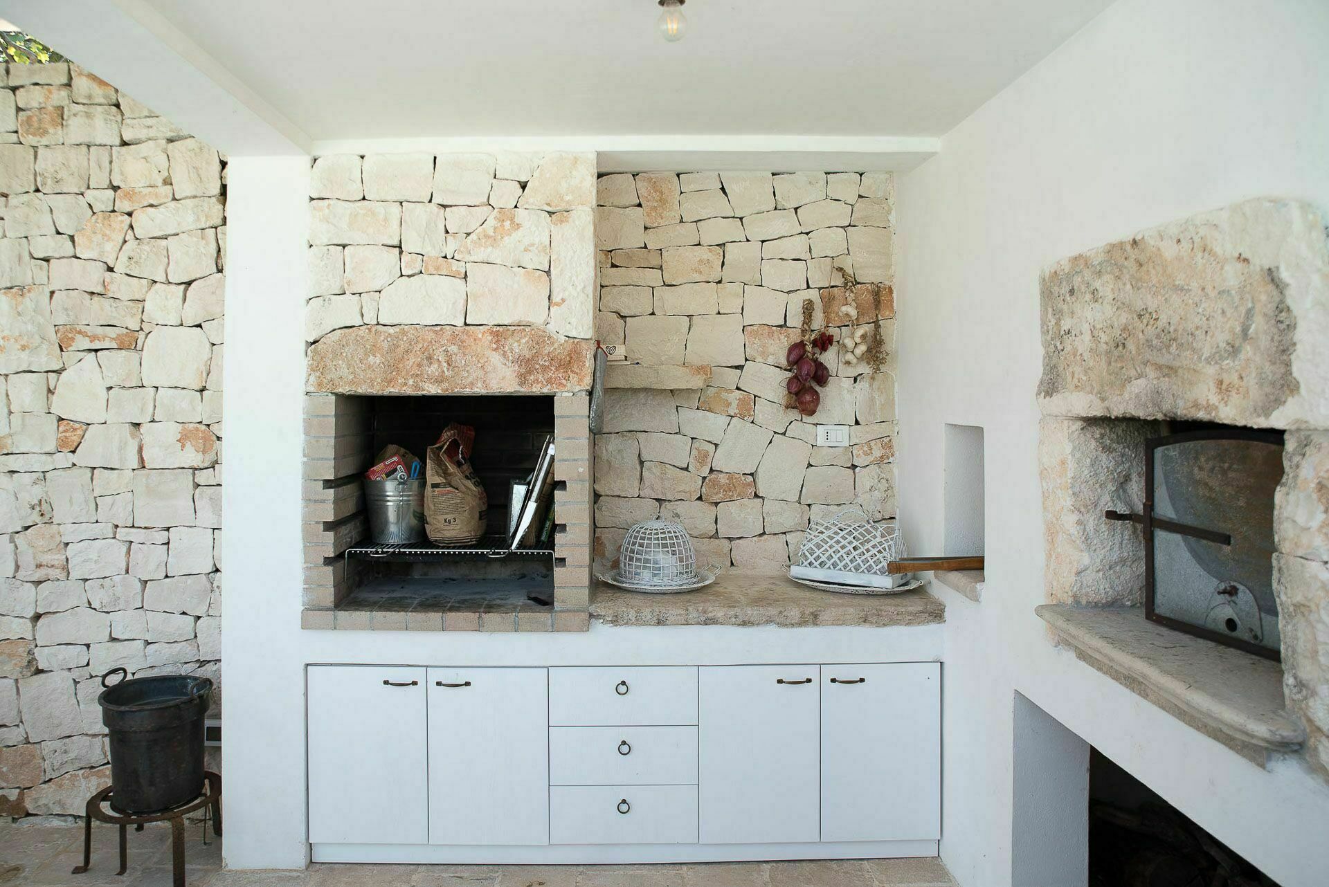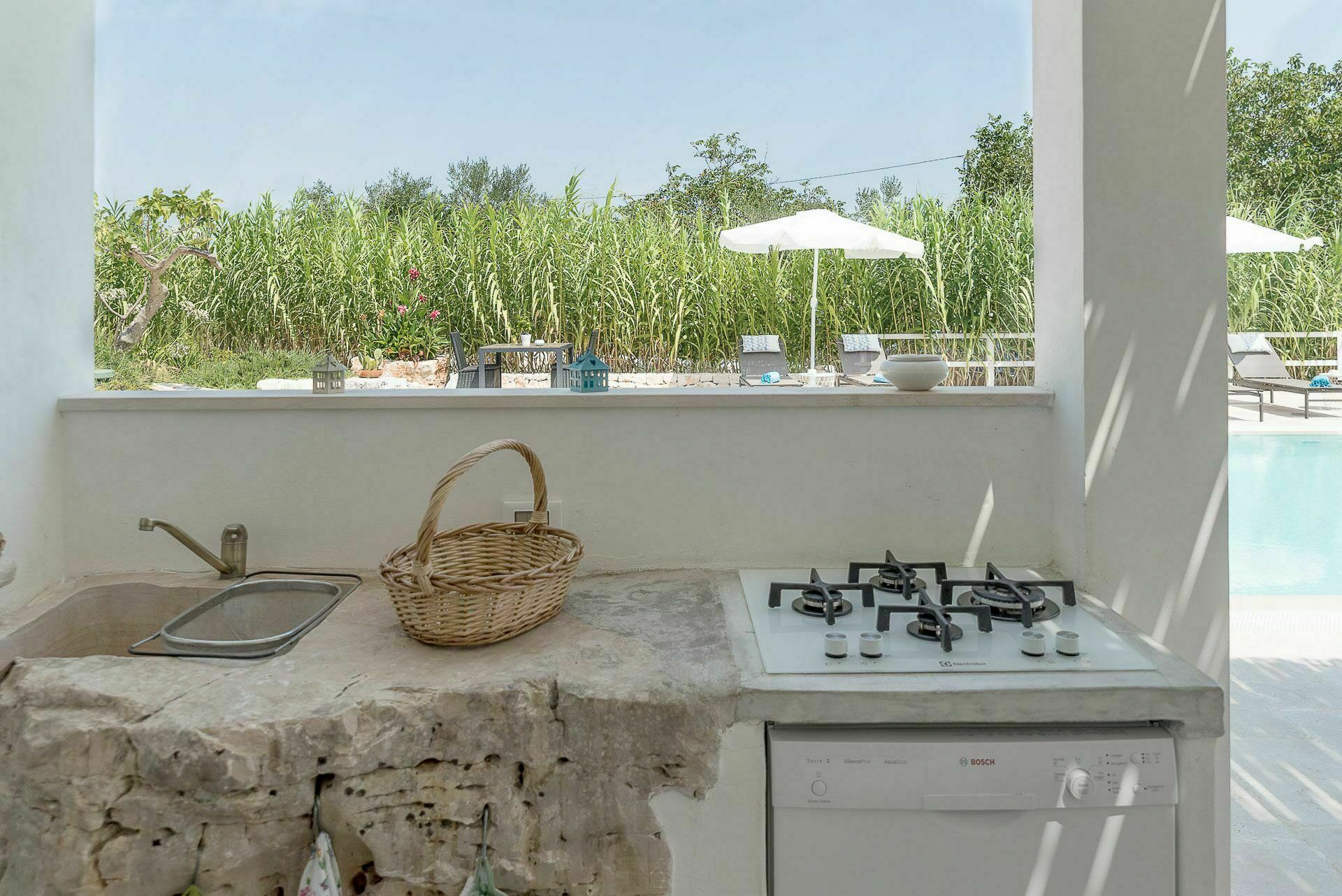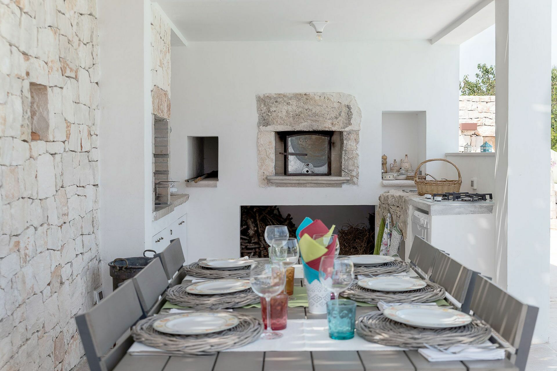 De trullo verhuur biedt ook een grote overdekte veranda bij het zwembad met een buitenkeuken met vaatwasser, houtoven, barbecue en eethoek, perfect om samen met vrienden en familie te koken. Bij de veranda bevindt zich een loungehoek met stenen zitjes. Bij “La Lamia” biedt een charmante pergola een buitenruimte met tafel en stoelen, zodat u kunt ontspannen en genieten van het ongelooflijke platteland van Salento.