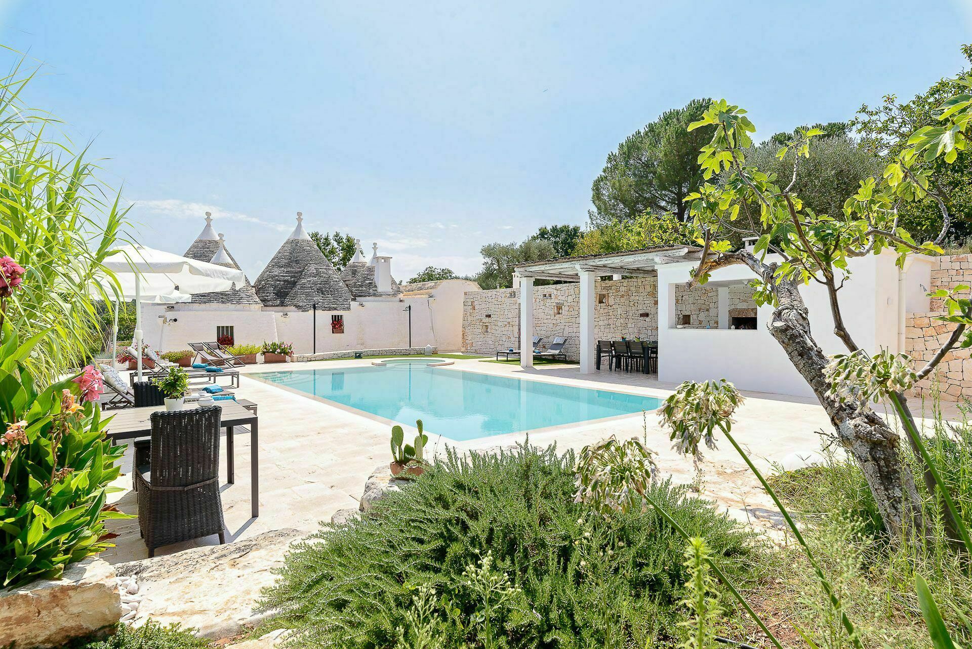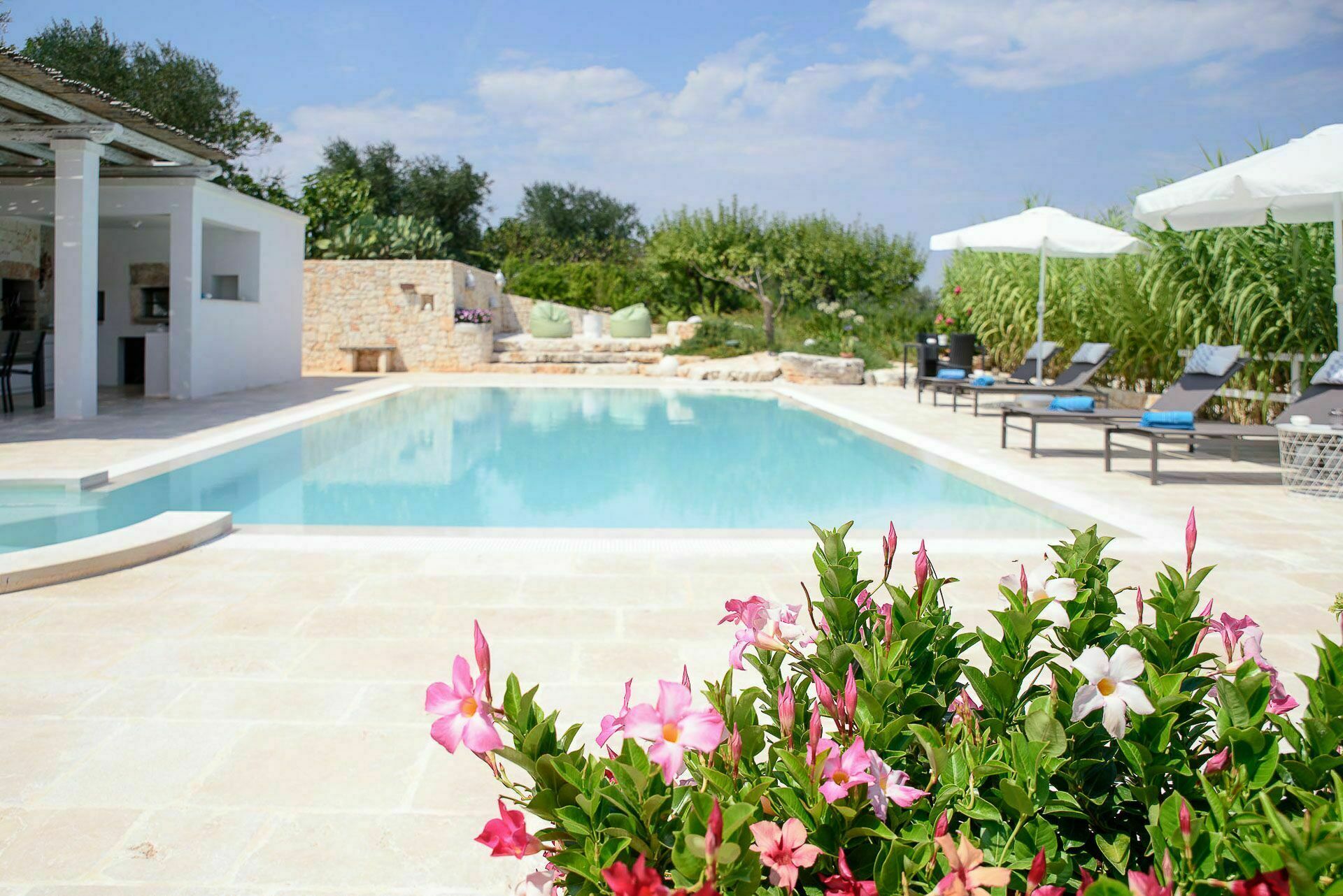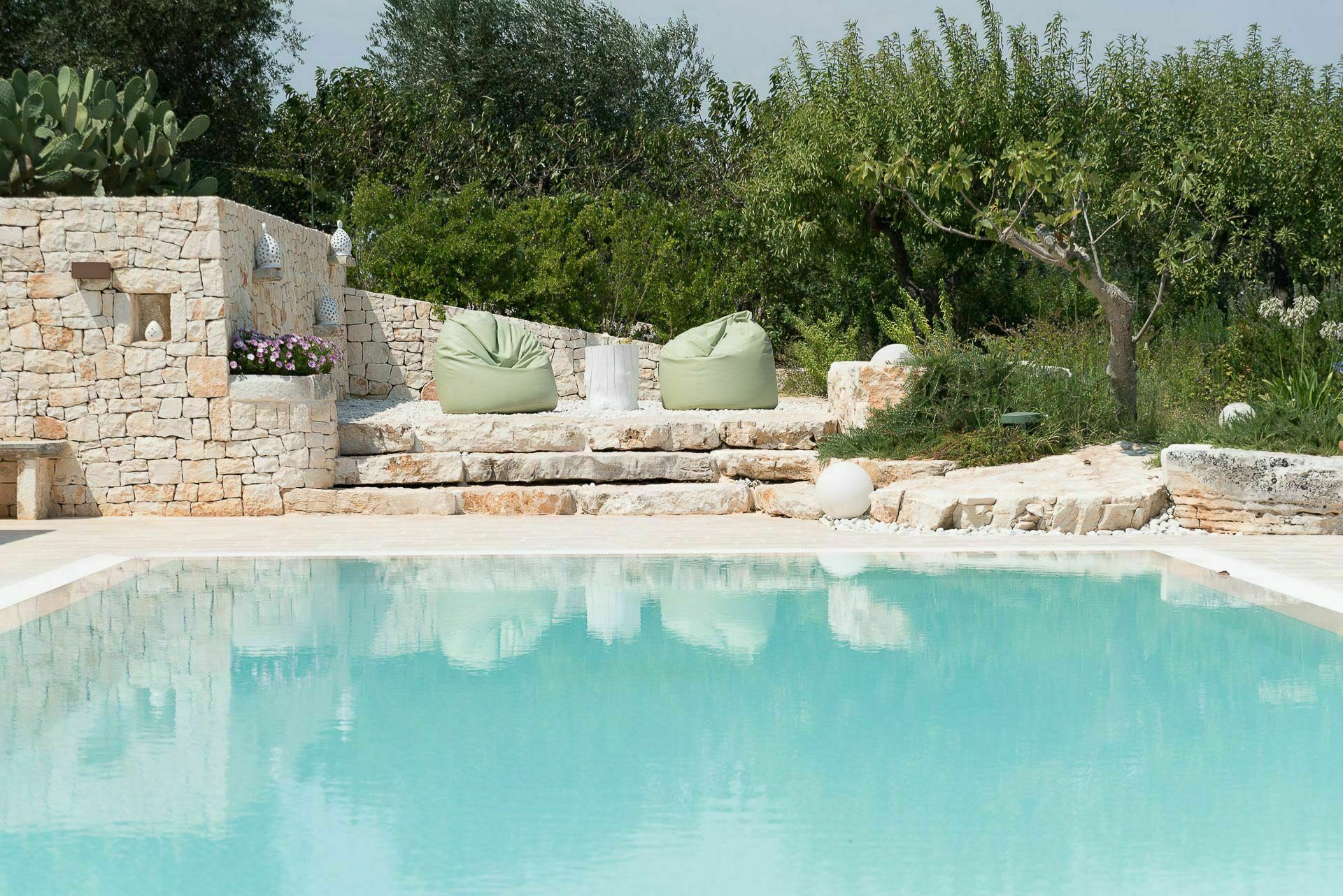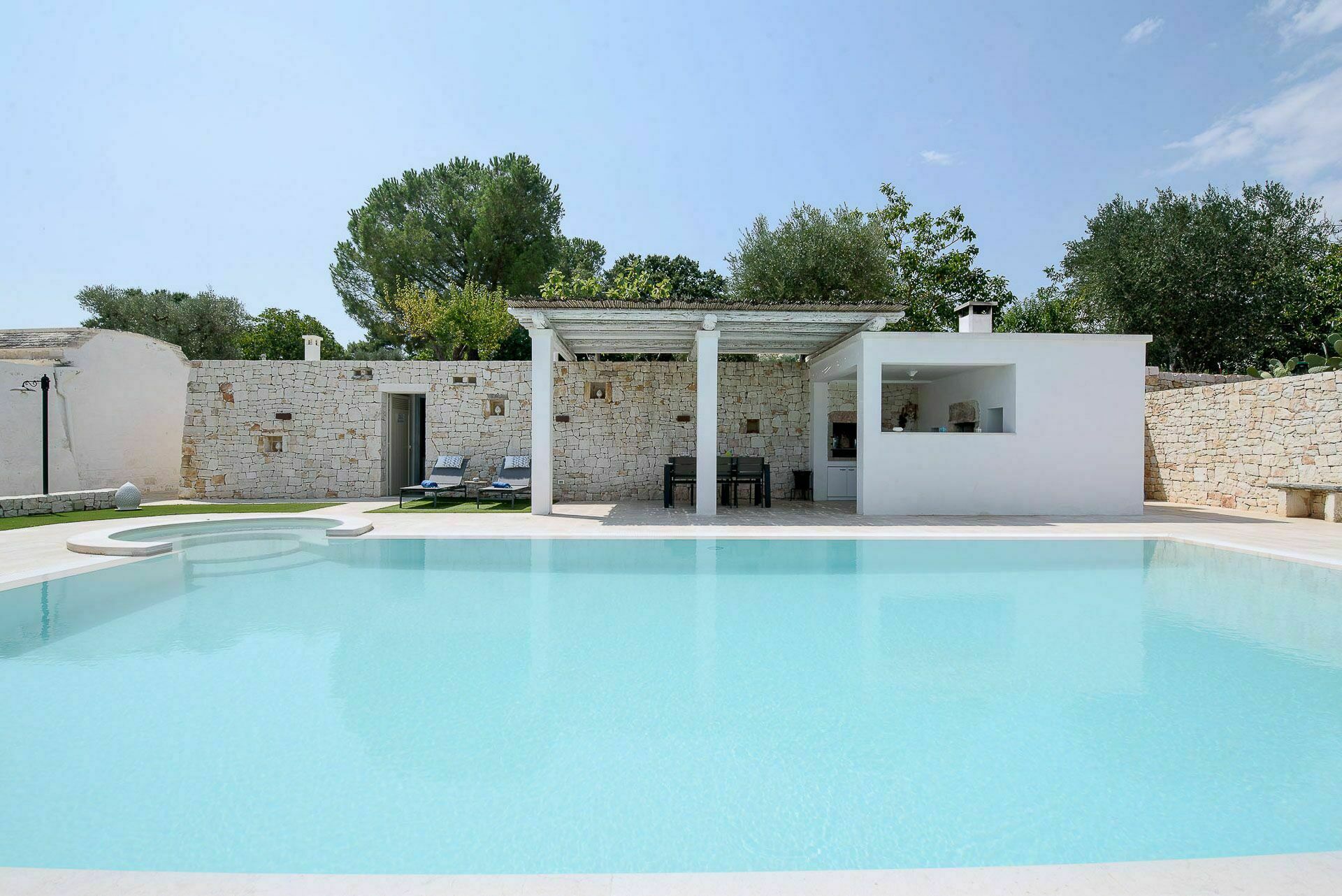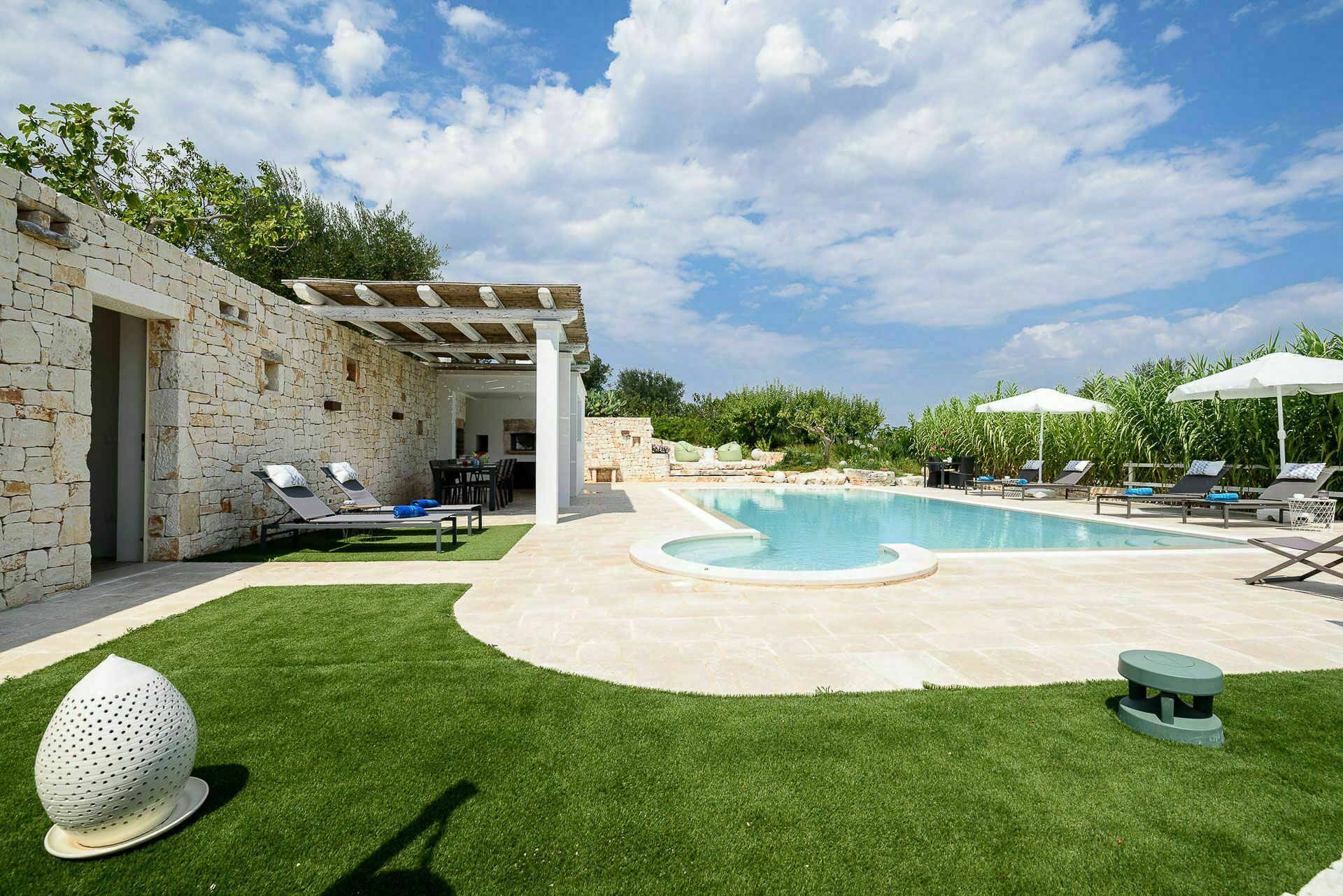 Een grote, goed onderhouden tuin omringt het pand. Achter de villa ligt een spectaculair zoutwaterzwembad geflankeerd door een elegant groen gazon. Het zwembad heeft een Romeinse trap voor gemakkelijke toegang en een ruimte met ontspannende massagestralen. Vanaf de ligstoelen bij het zwembad kunt u genieten van de zon en de rust van het Apulische platteland.