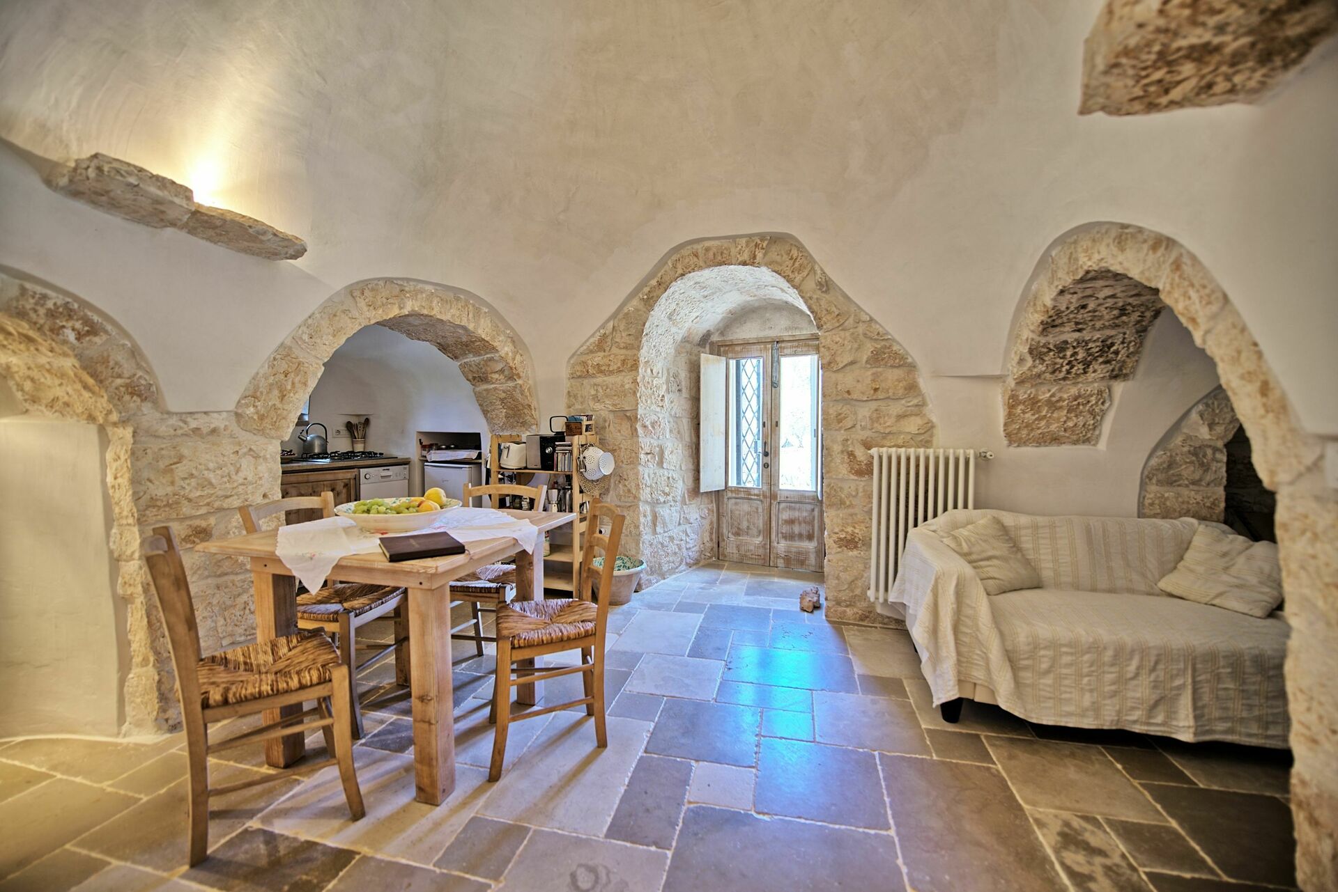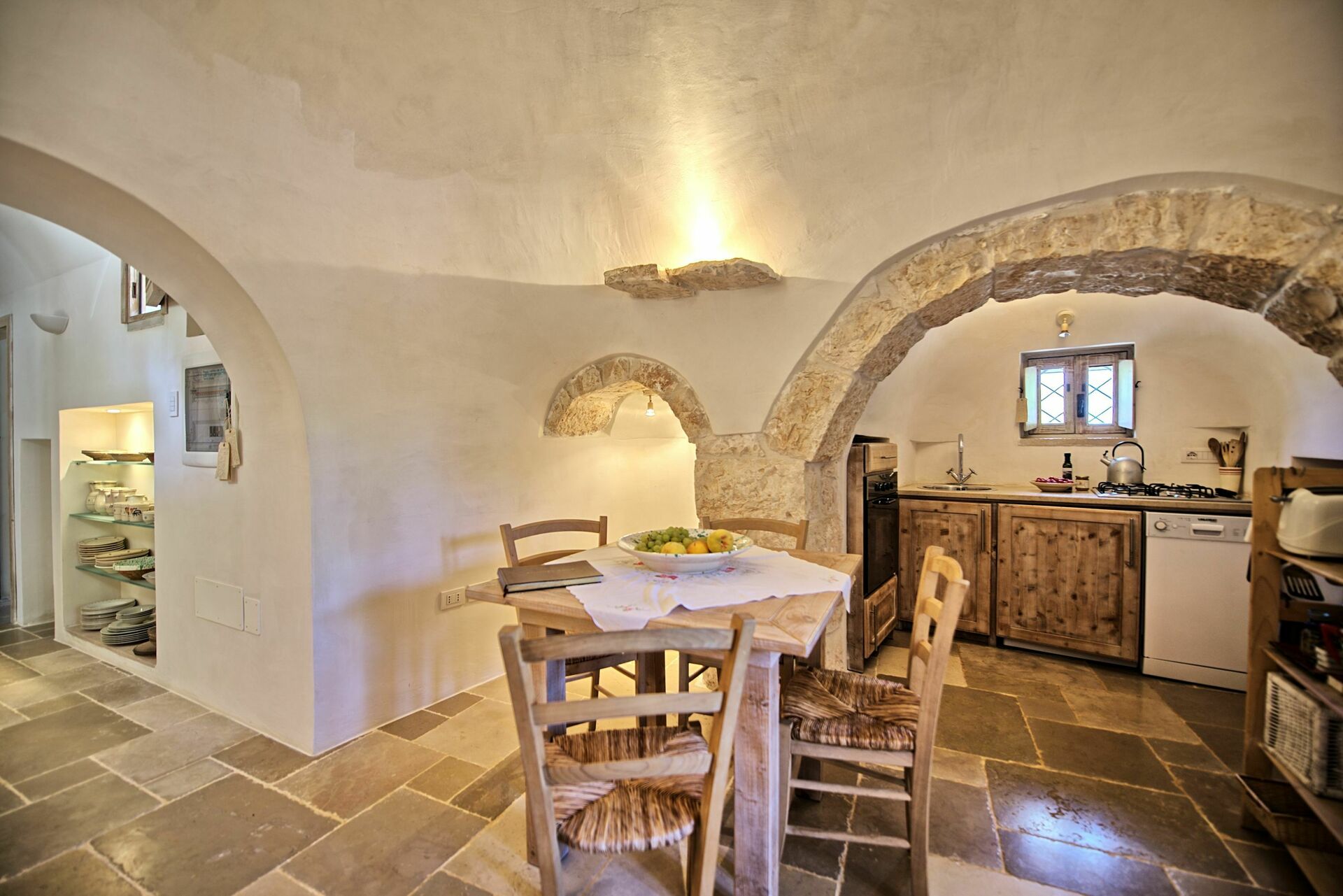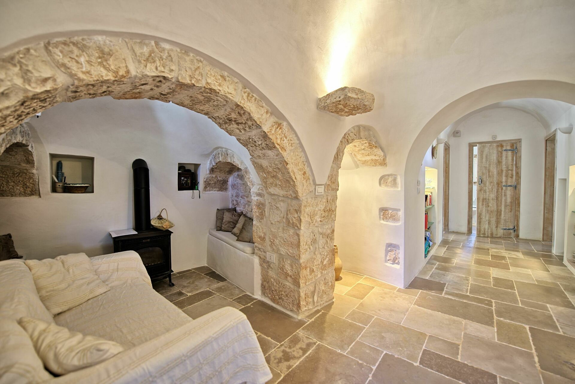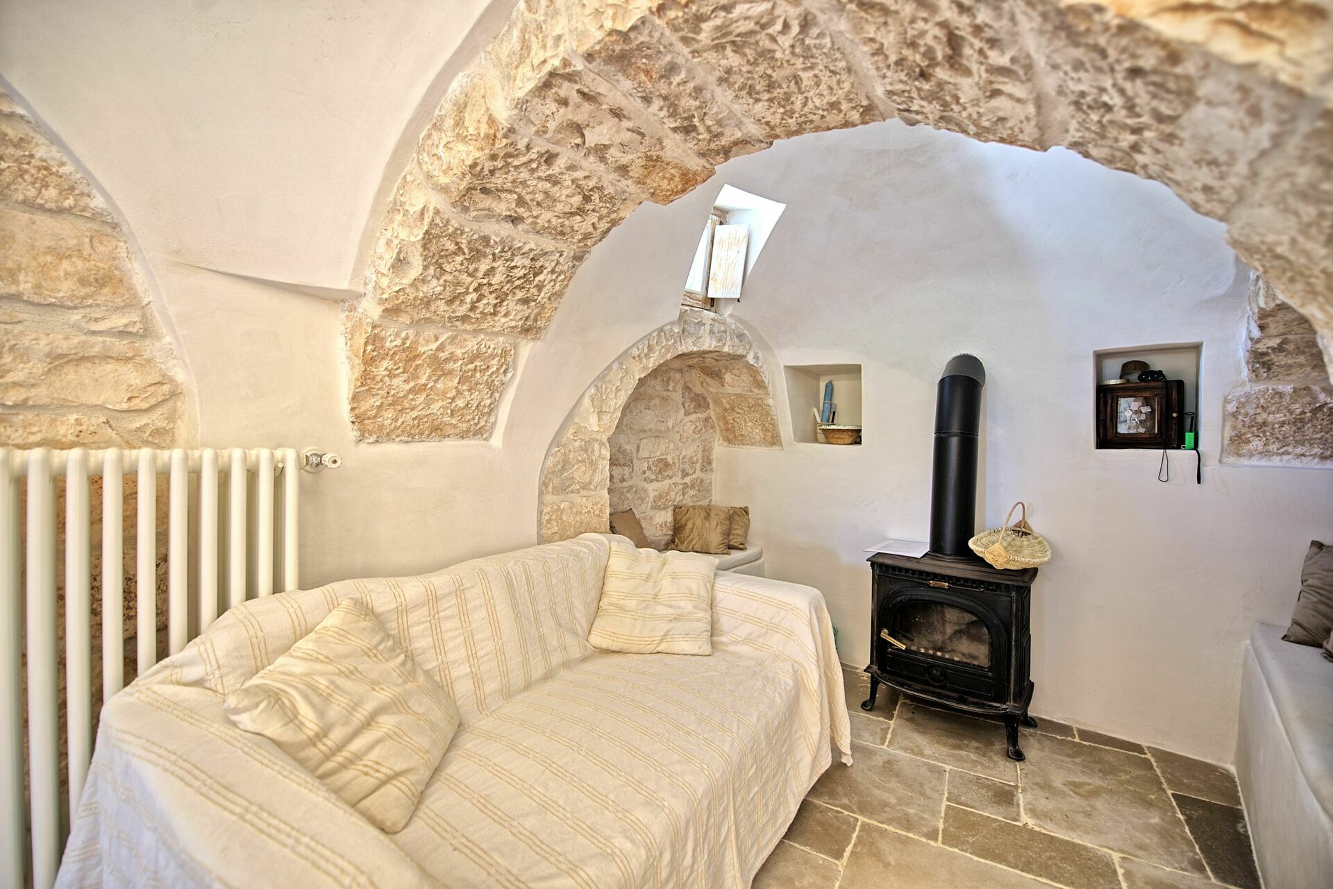 In de koudere maand wordt deze trullo verwarmd door een houtkachel en in de warmere maanden zorgen de dikke muren ervoor dat de warmte buiten blijft.