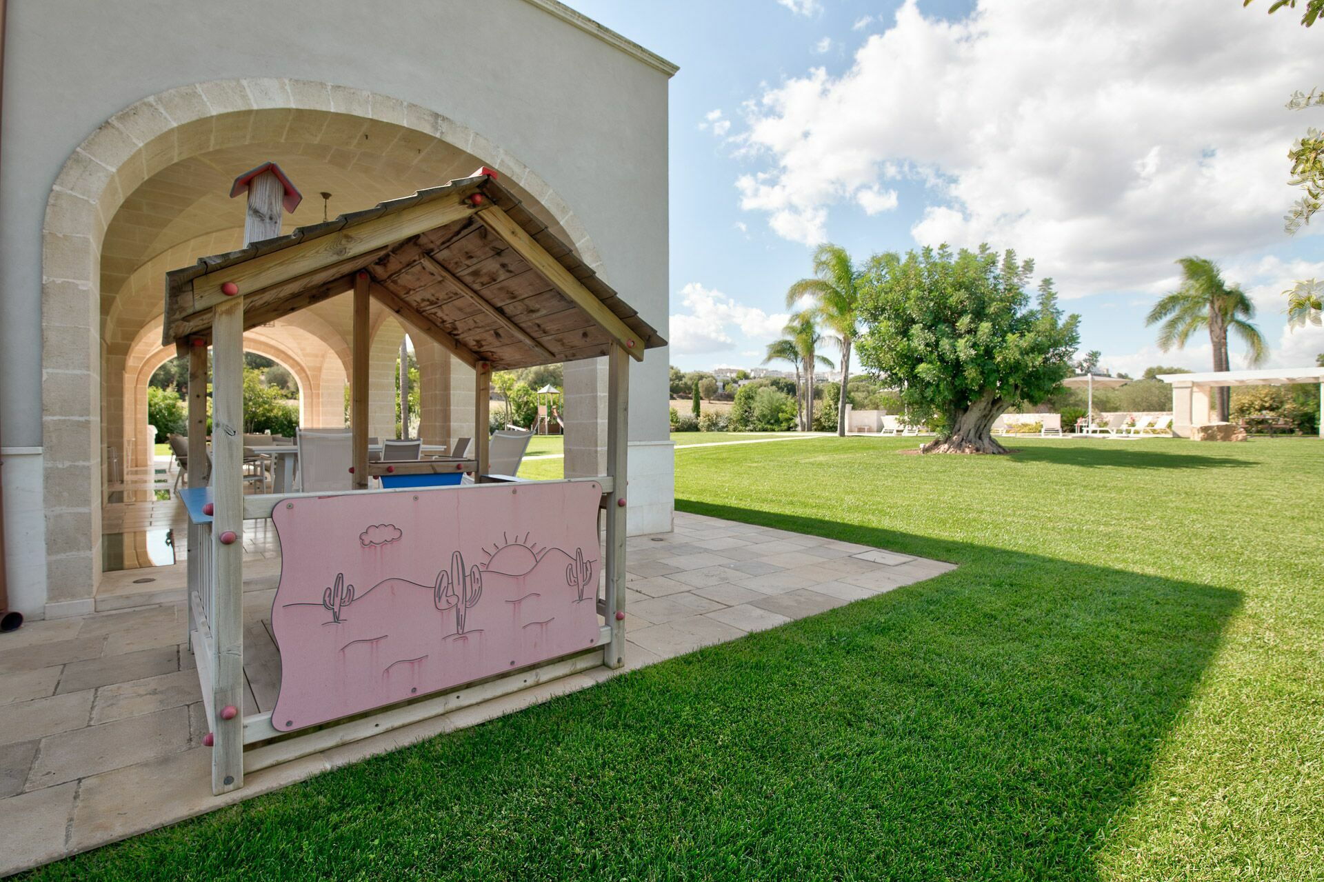 Bij het zwembad staat een modern tuinhuisje met een eettafel. Langs de gehele zijkant van de villa loopt een ruime veranda met uitzicht op het zwembad, nog een eethoek en een ontspanningsruimte. Buiten is er ook een kleine kinderspeelplaats vlakbij het zwembad.