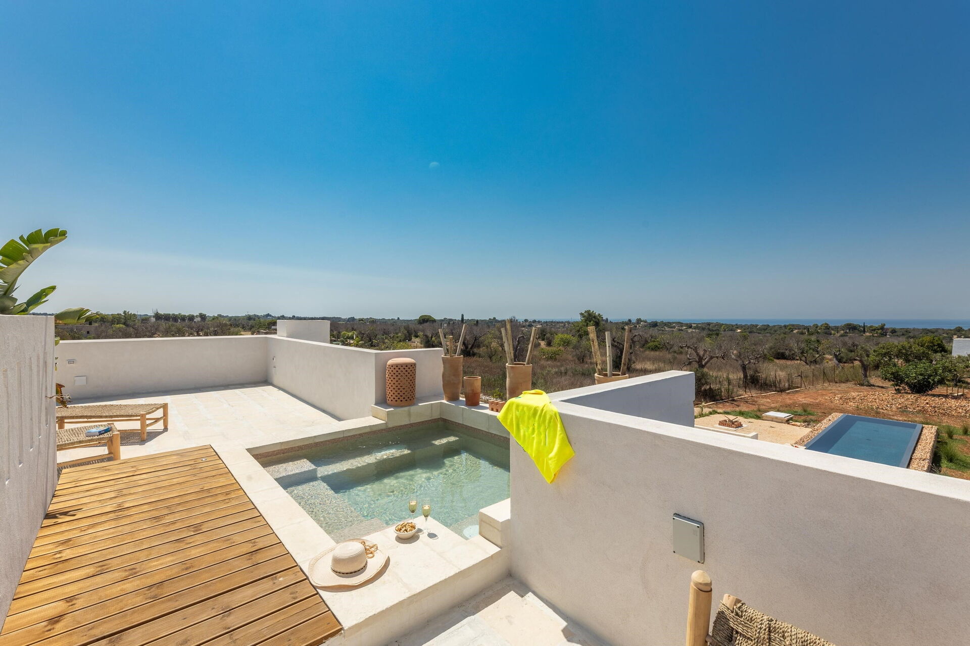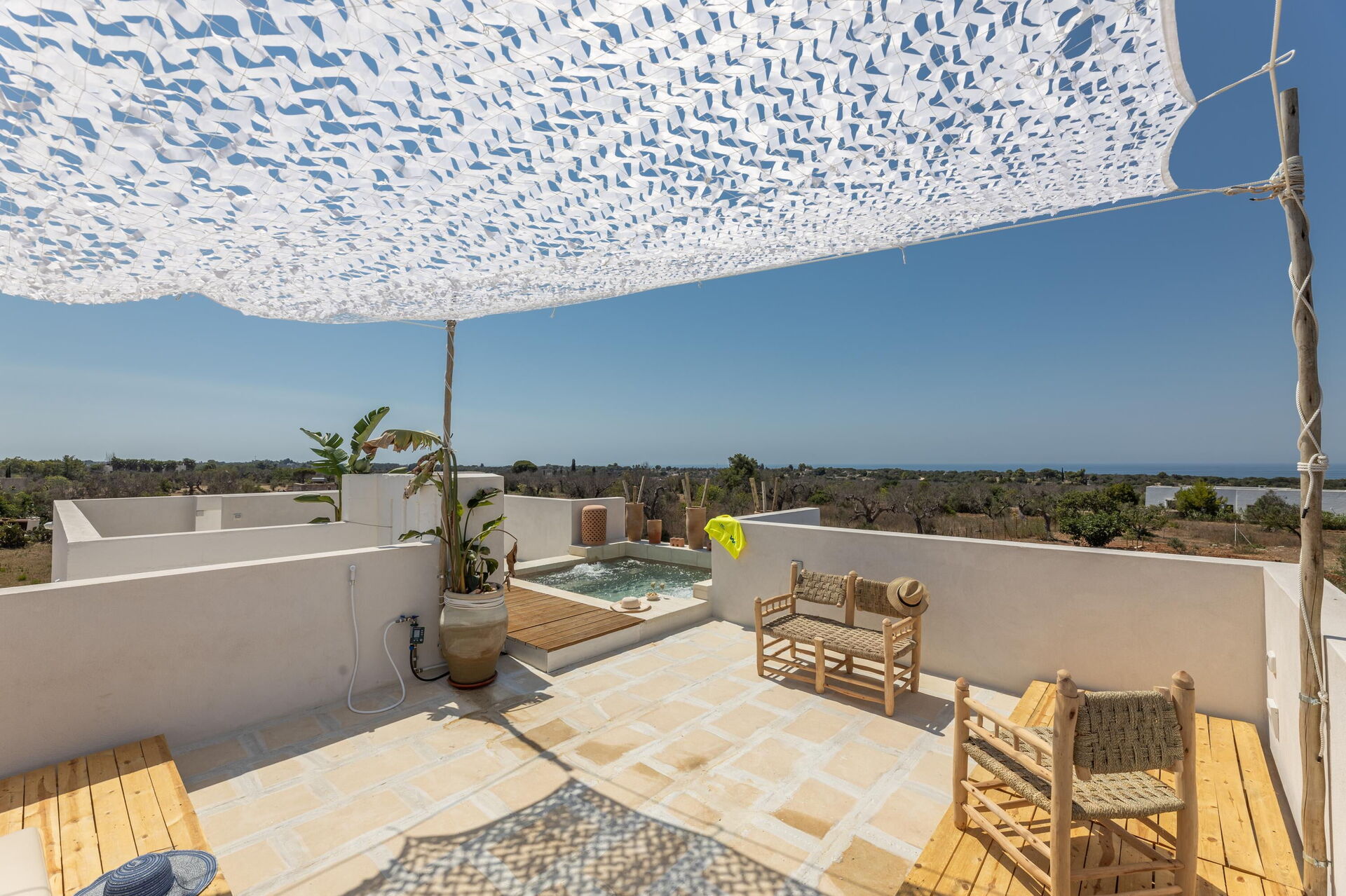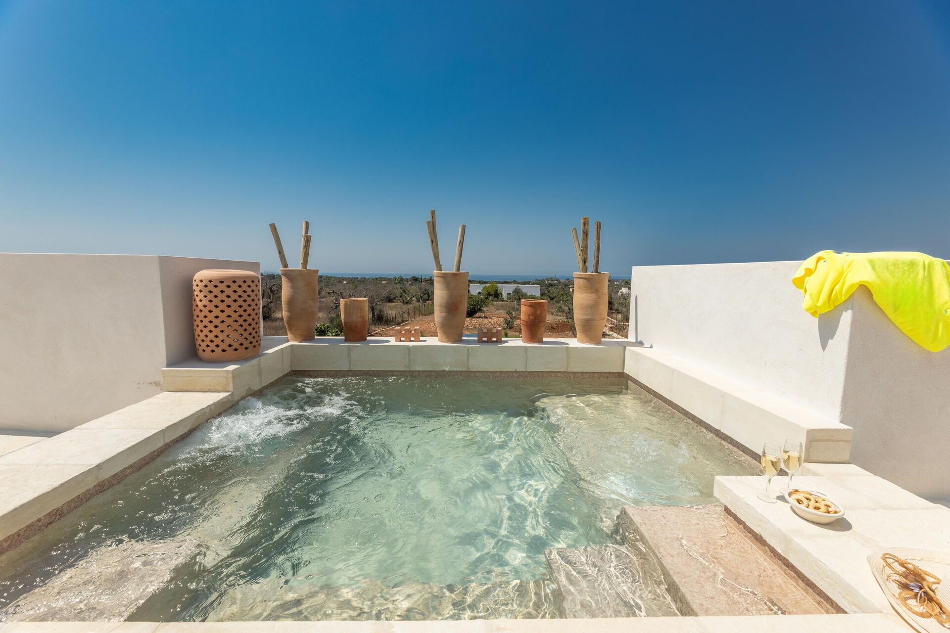 Eerste verdieping (alleen toegankelijk van buitenaf en niet verbonden met de rest van de villa van binnenuit): terras met panoramisch uitzicht en buitenjacuzzi (3 x 2,5 meter; minimale diepte 0,20 meter; maximale diepte 0,80 meter; verwarmbaar tot ca. 30–33 °C).