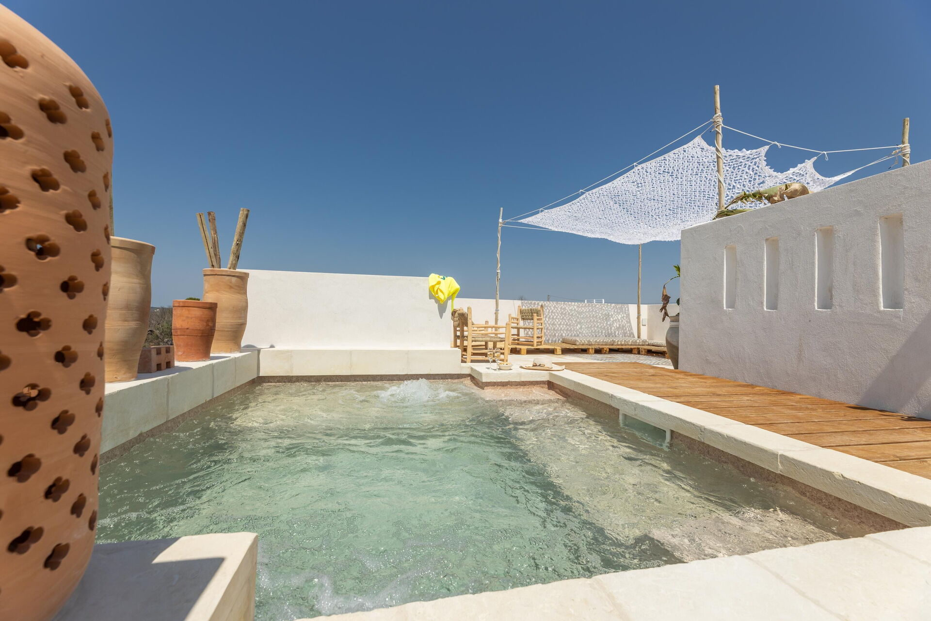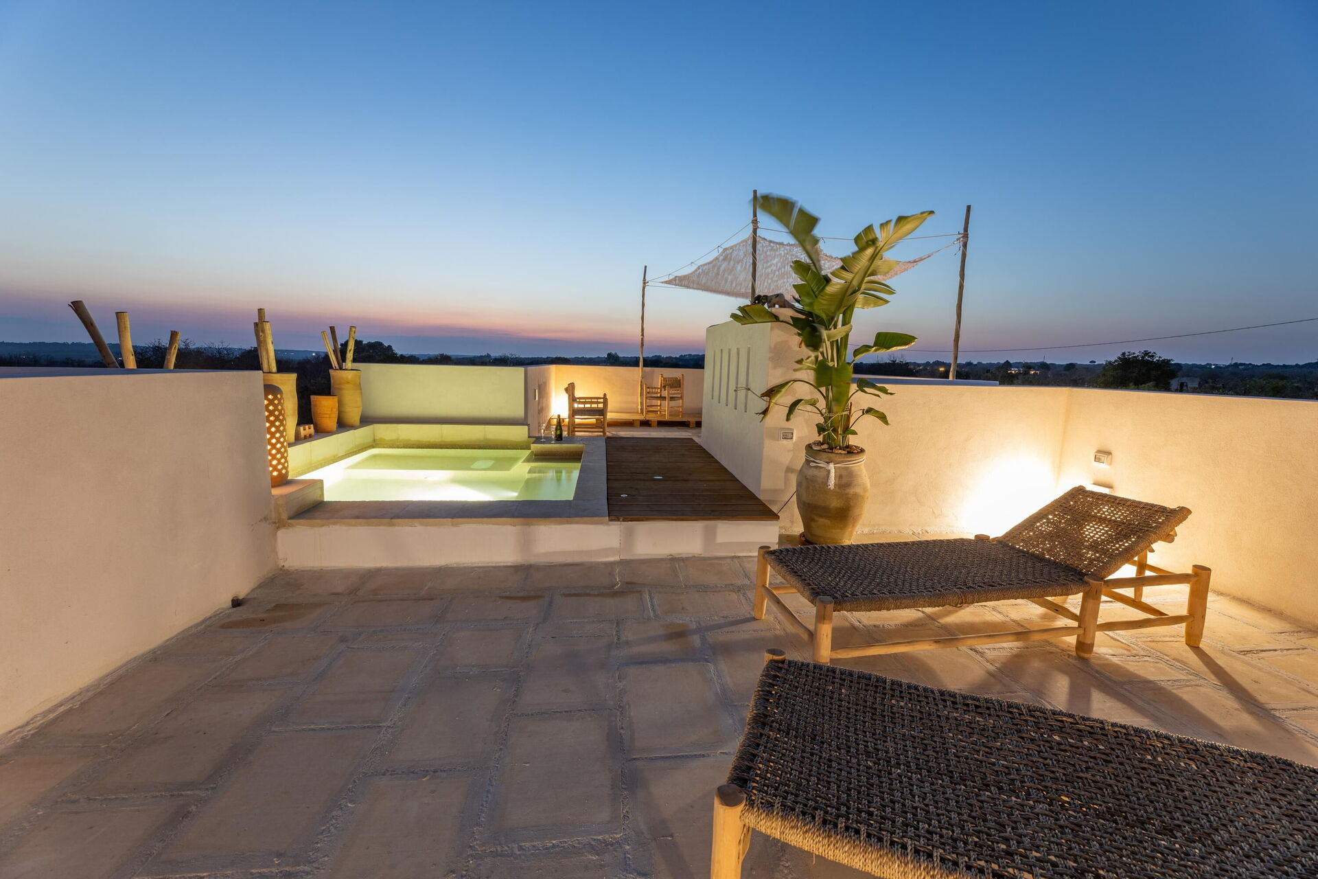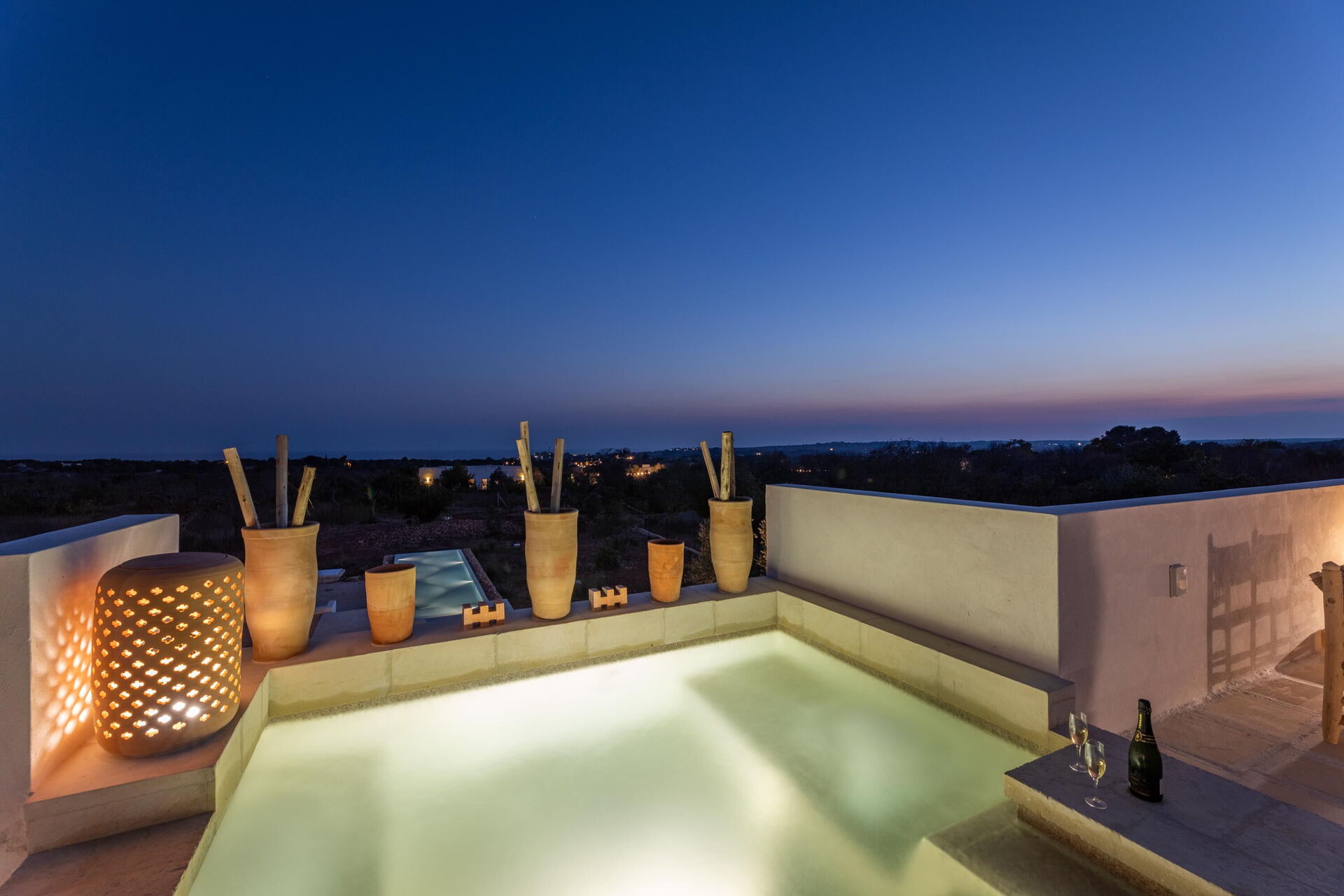 Eerste verdieping (alleen toegankelijk van buitenaf en niet verbonden met de rest van de villa van binnenuit): terras met panoramisch uitzicht en buitenjacuzzi (3 x 2,5 meter; minimale diepte 0,20 meter; maximale diepte 0,80 meter; verwarmbaar tot ca. 30–33 °C).
