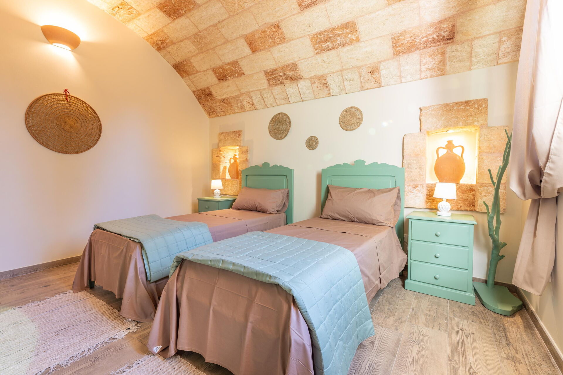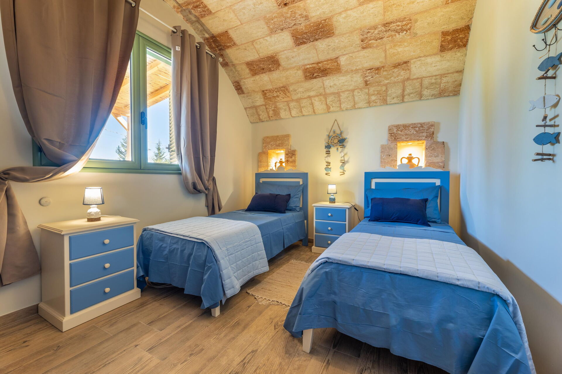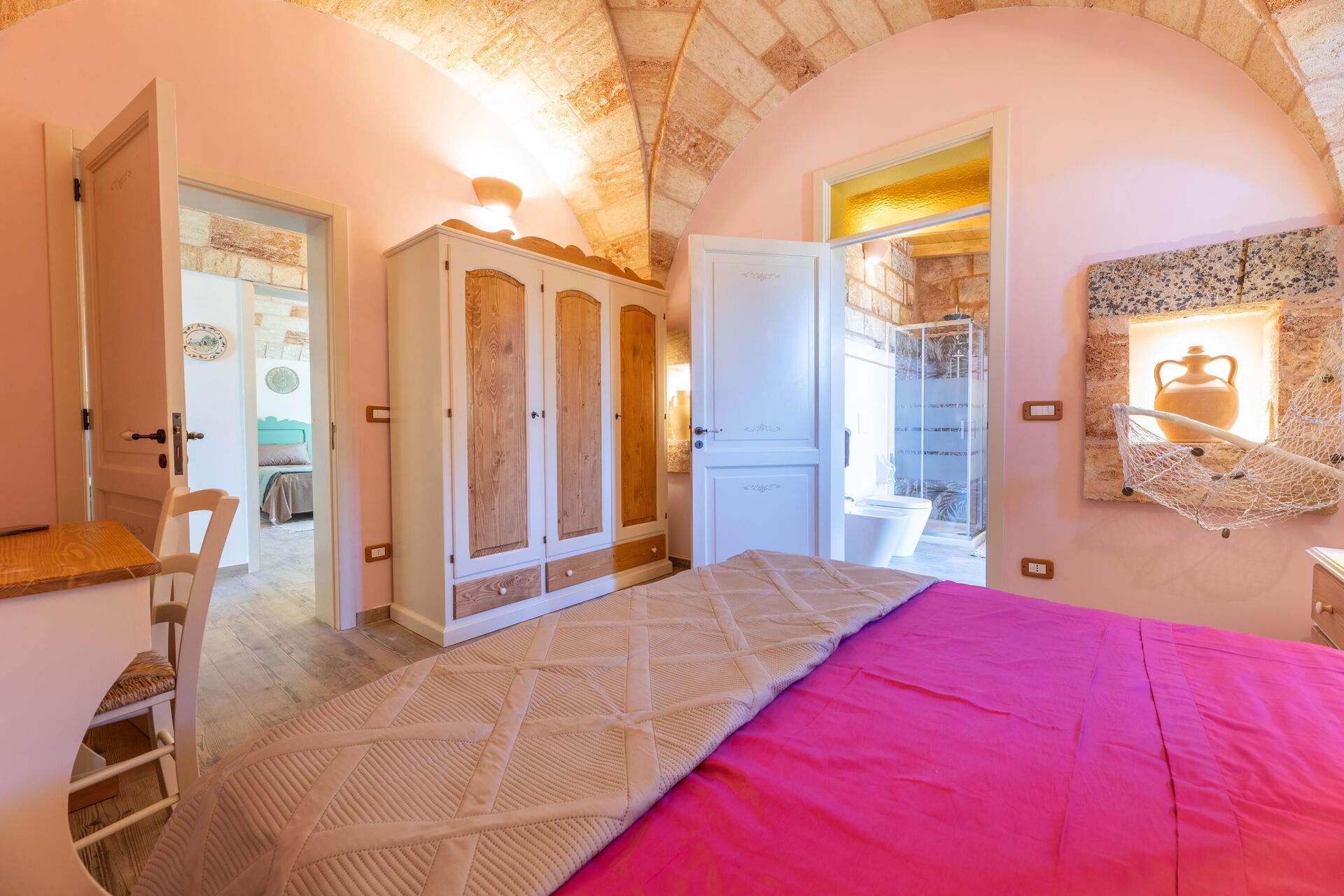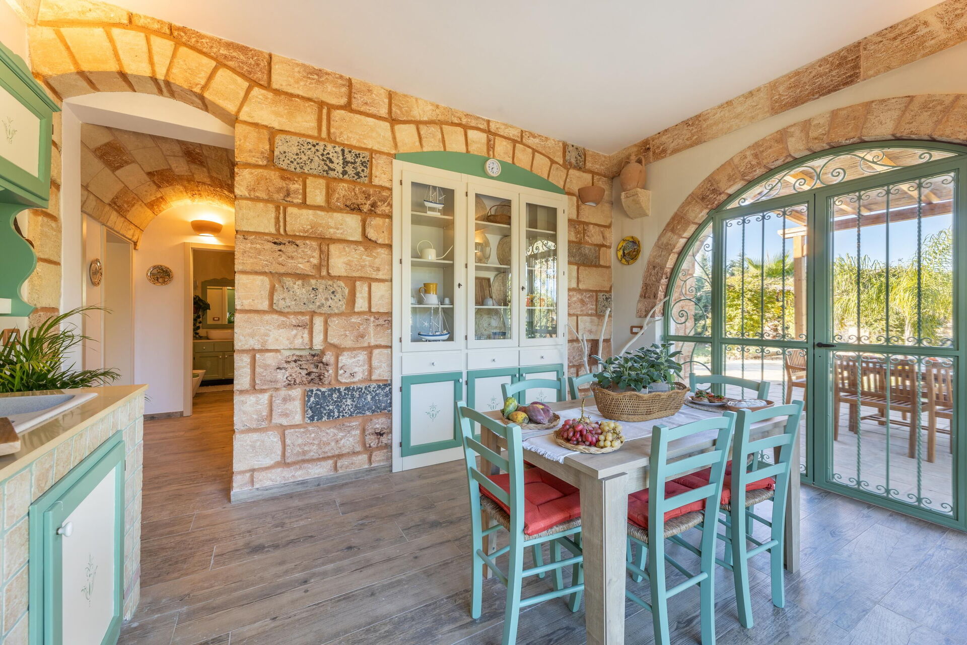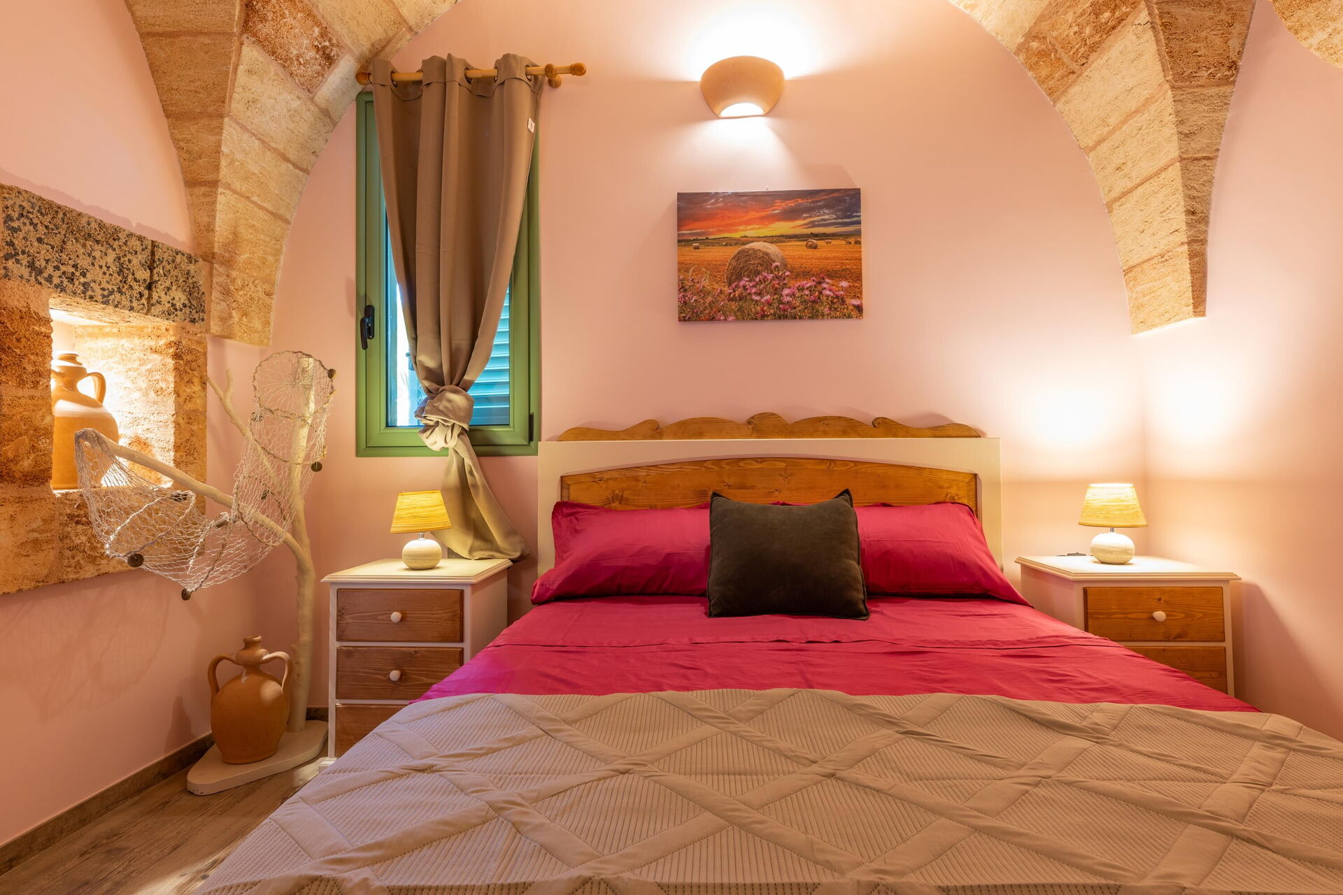 Het vakantiehuis is smaakvol ingericht en beschikt over gewelfde plafonds en zichtbare, traditionele tufsteen in verschillende ruimtes.