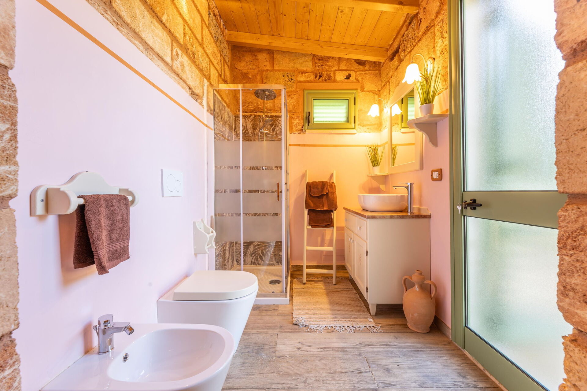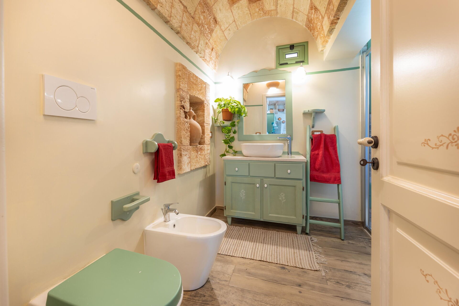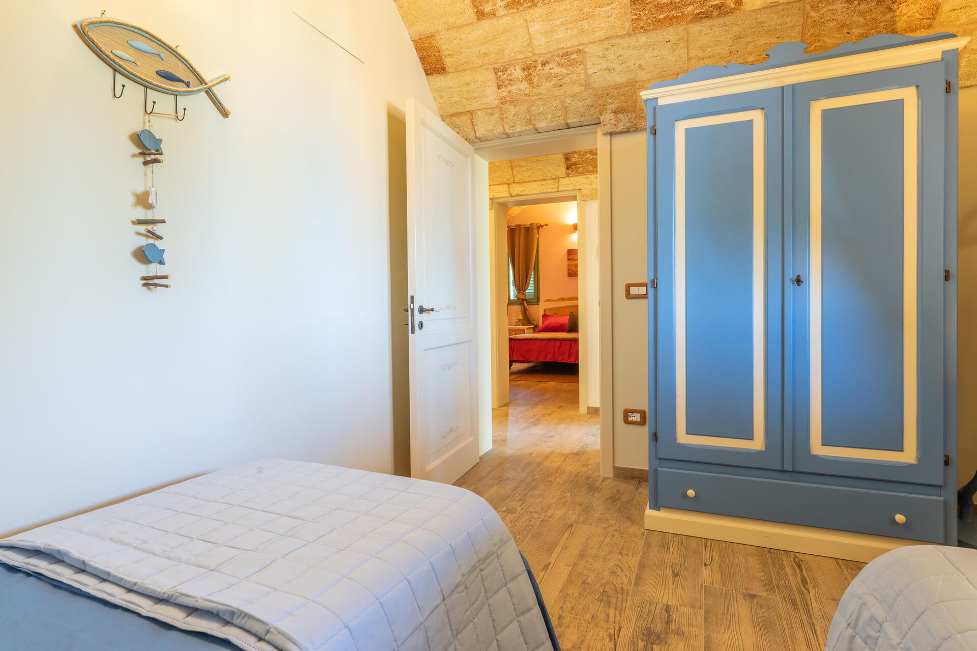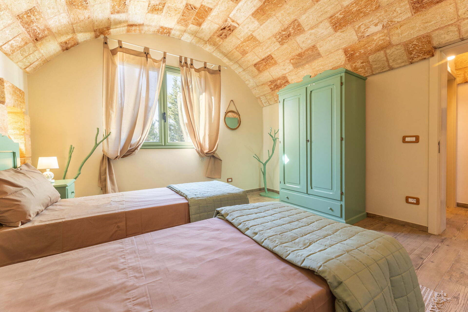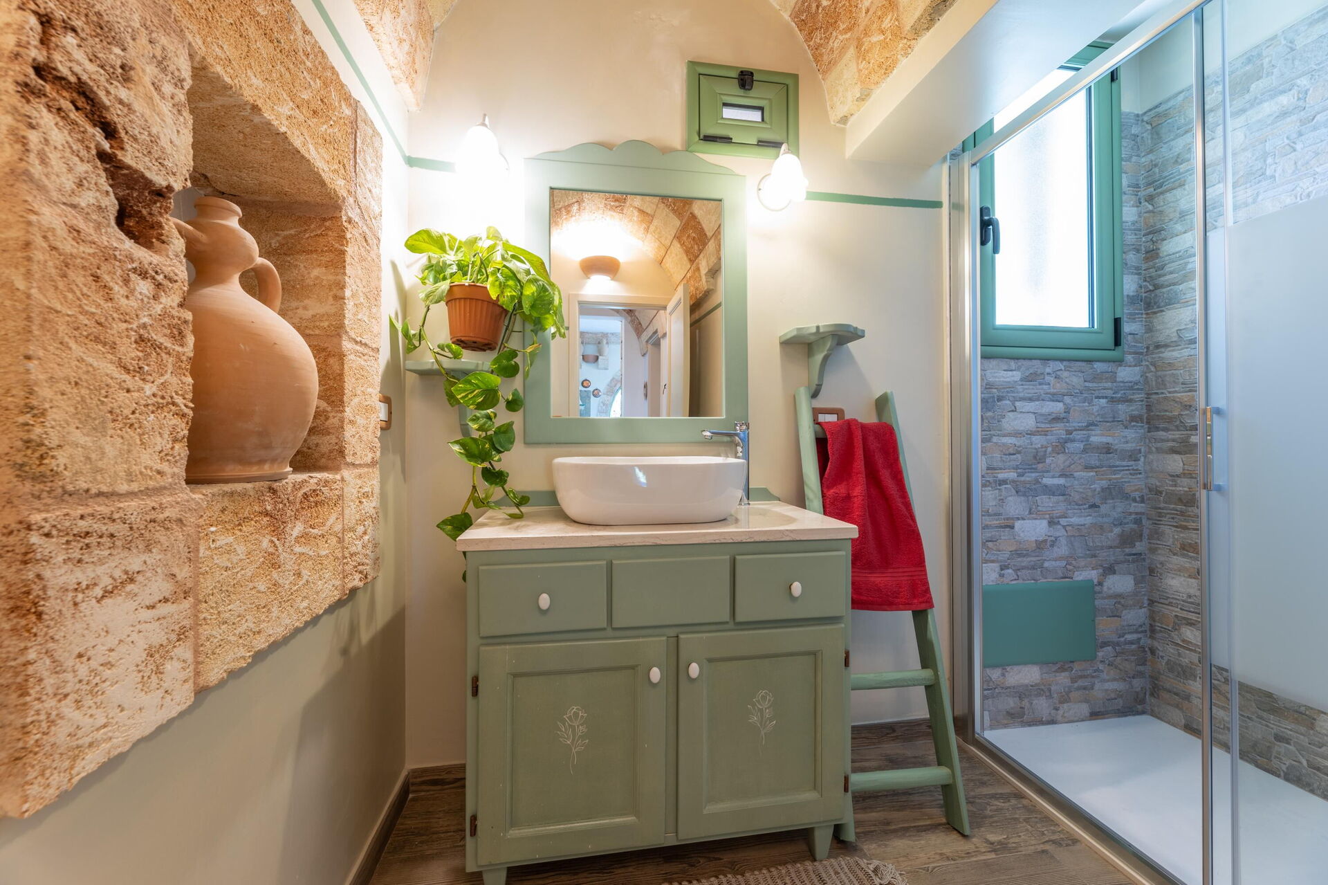 Het vakantiehuis is smaakvol ingericht en beschikt over gewelfde plafonds en zichtbare, traditionele tufsteen in verschillende ruimtes.