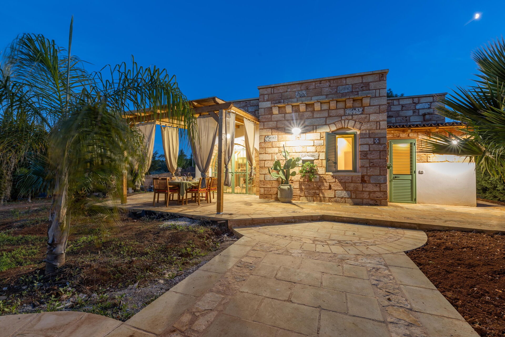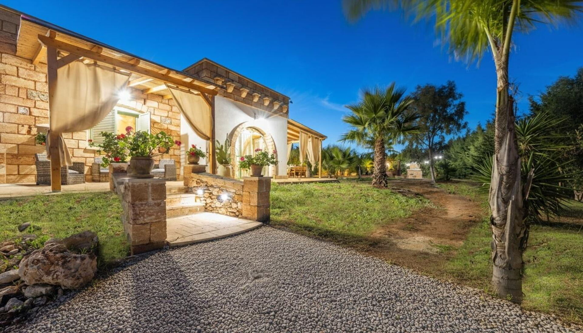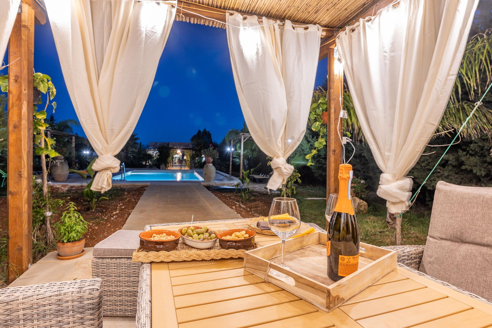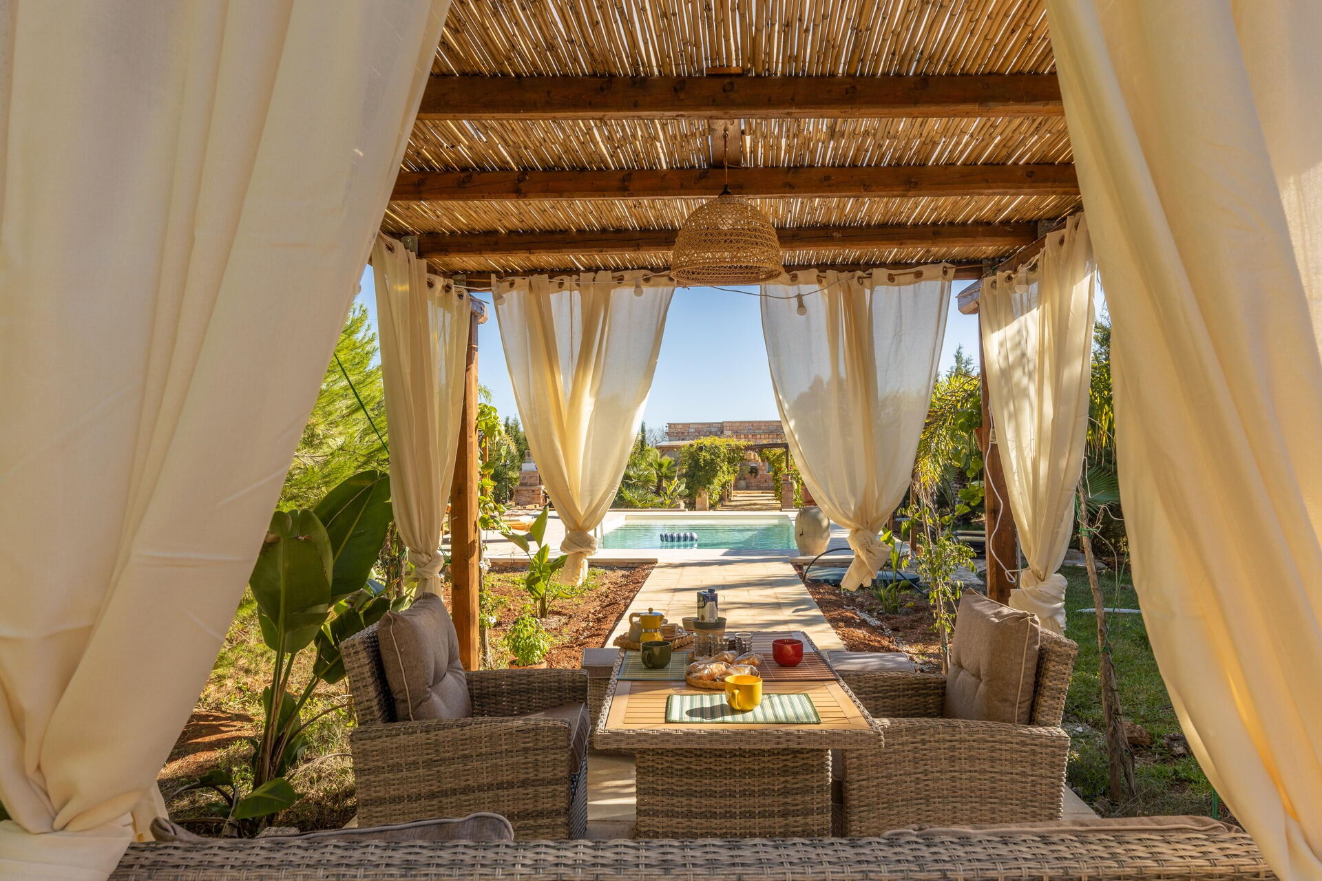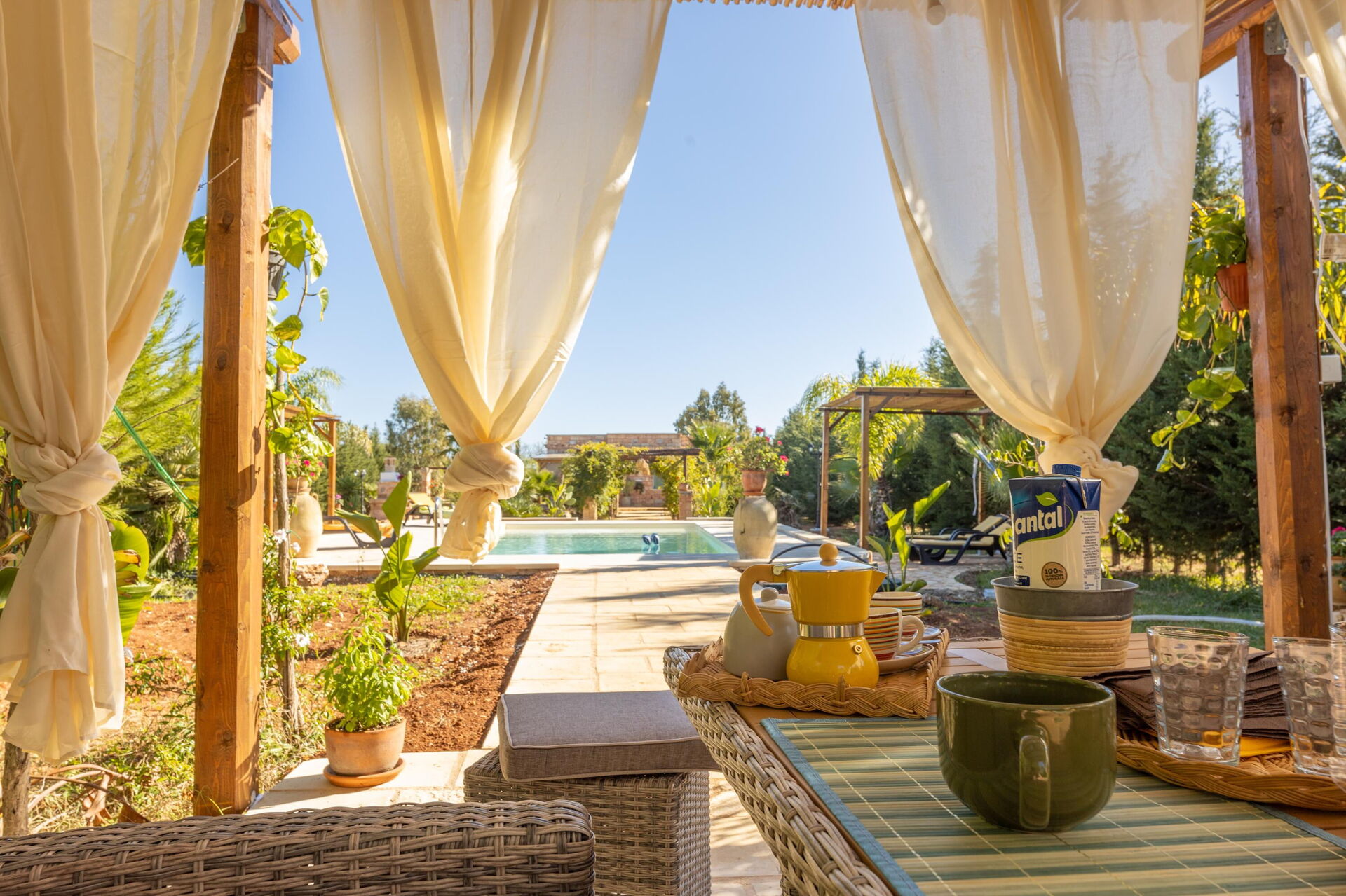 De woning wordt omringd door een grote tuin met weelderige vegetatie bestaande uit bomen en mediterrane planten. Hier vind je een privézwembad voor de gasten, een veranda met buiten-eetruimte en meerdere plekken om te ontspannen.