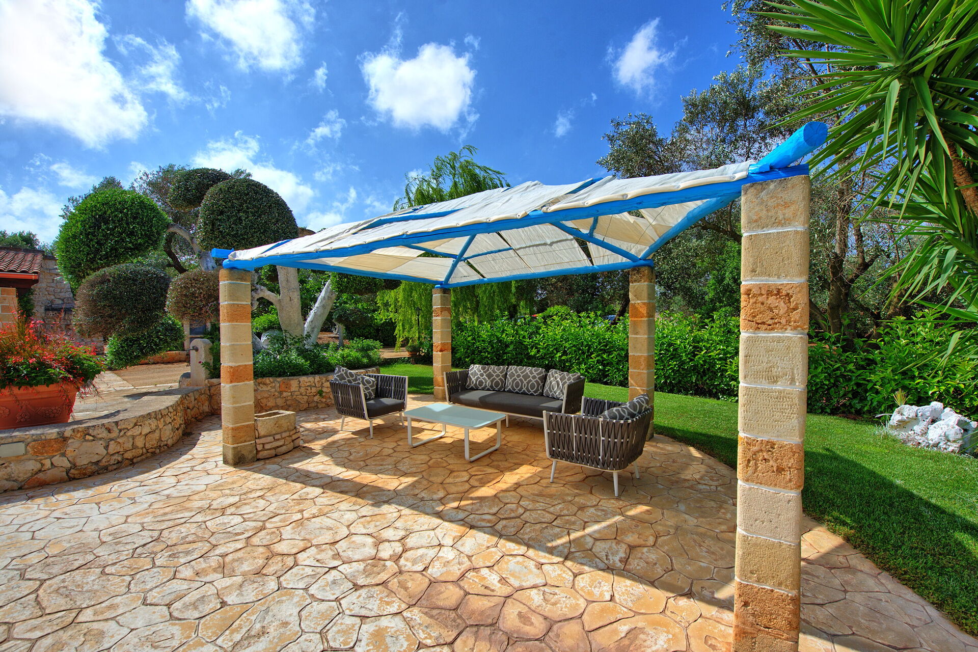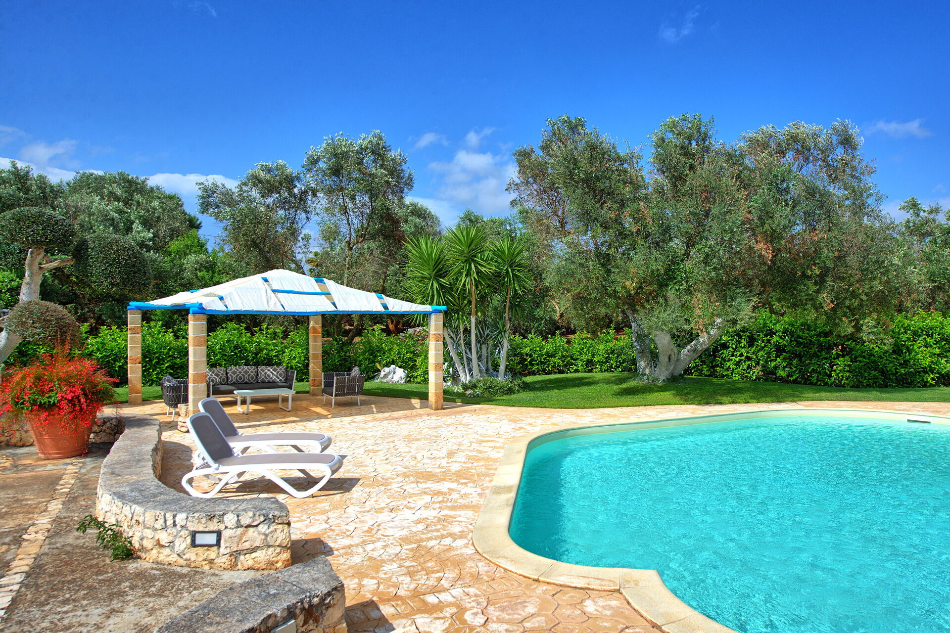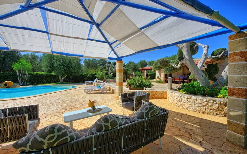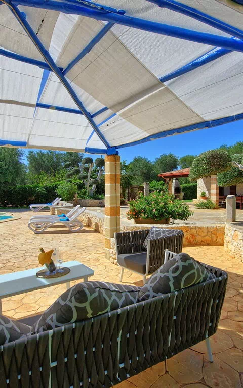 A lovely, private, 2 bedroom villa, perfect for a couple or small family, beautifully landscaped grounds and private swimming pool, with a lovely cabana. Located on a very quiet road, near the small town of San Michele Salentino, which has a number of very good restaurants, supermarkets and shops.