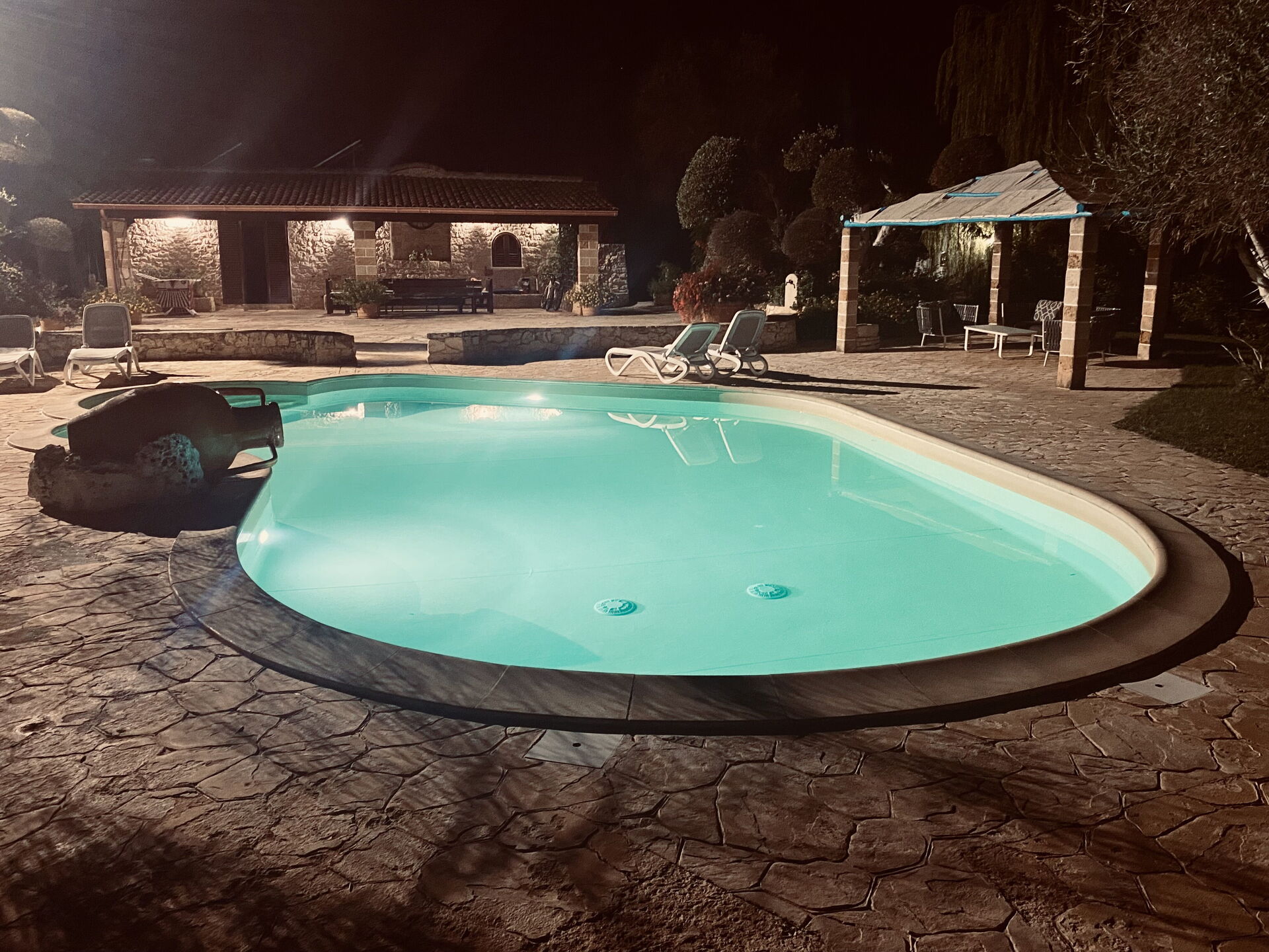 Il giardino è curato e pieno di fiori ed alberi di frutta che tra l'altro si poteva raccogliere. La piscina non è grandissima ma è molto bella e ci siamo divertititi con i bambini. Ampi spazi per rilassarsi fuori.