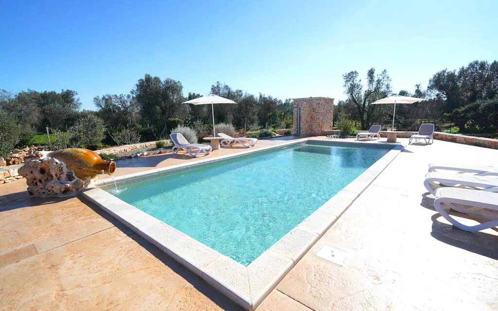 Het grote privézwembad ligt naast een zonneterras met ligstoelen – de perfecte plek om te ontspannen en af te koelen onder de warme zon van Salento, samen met familie of vrienden.