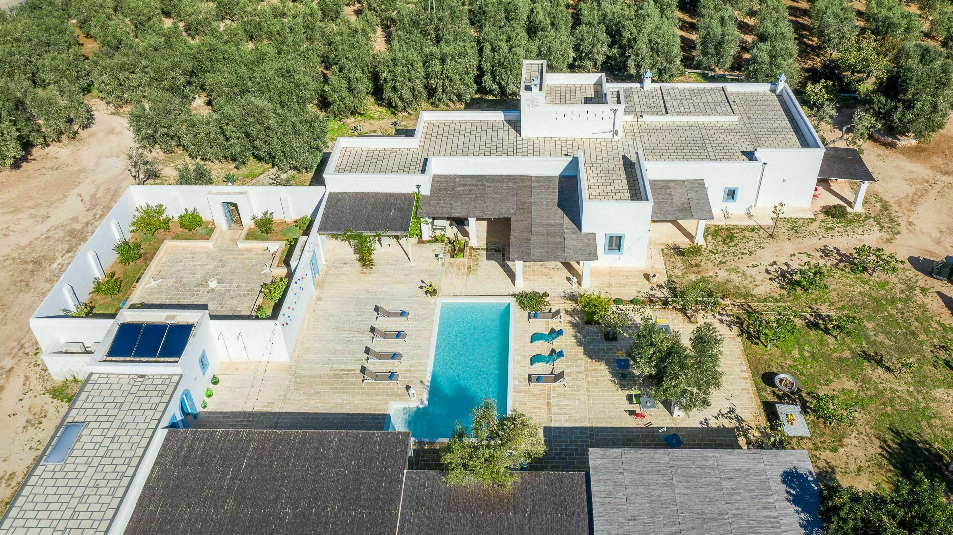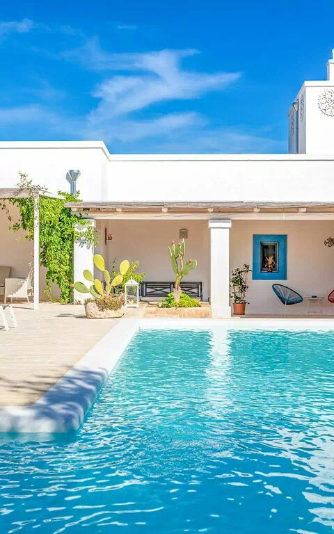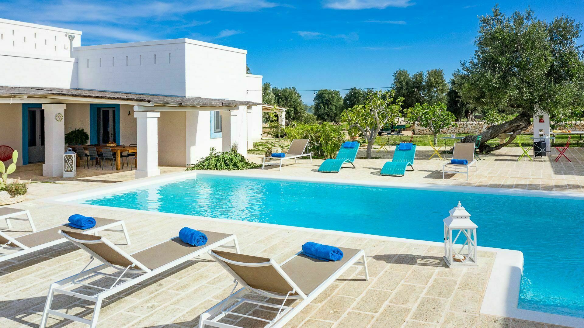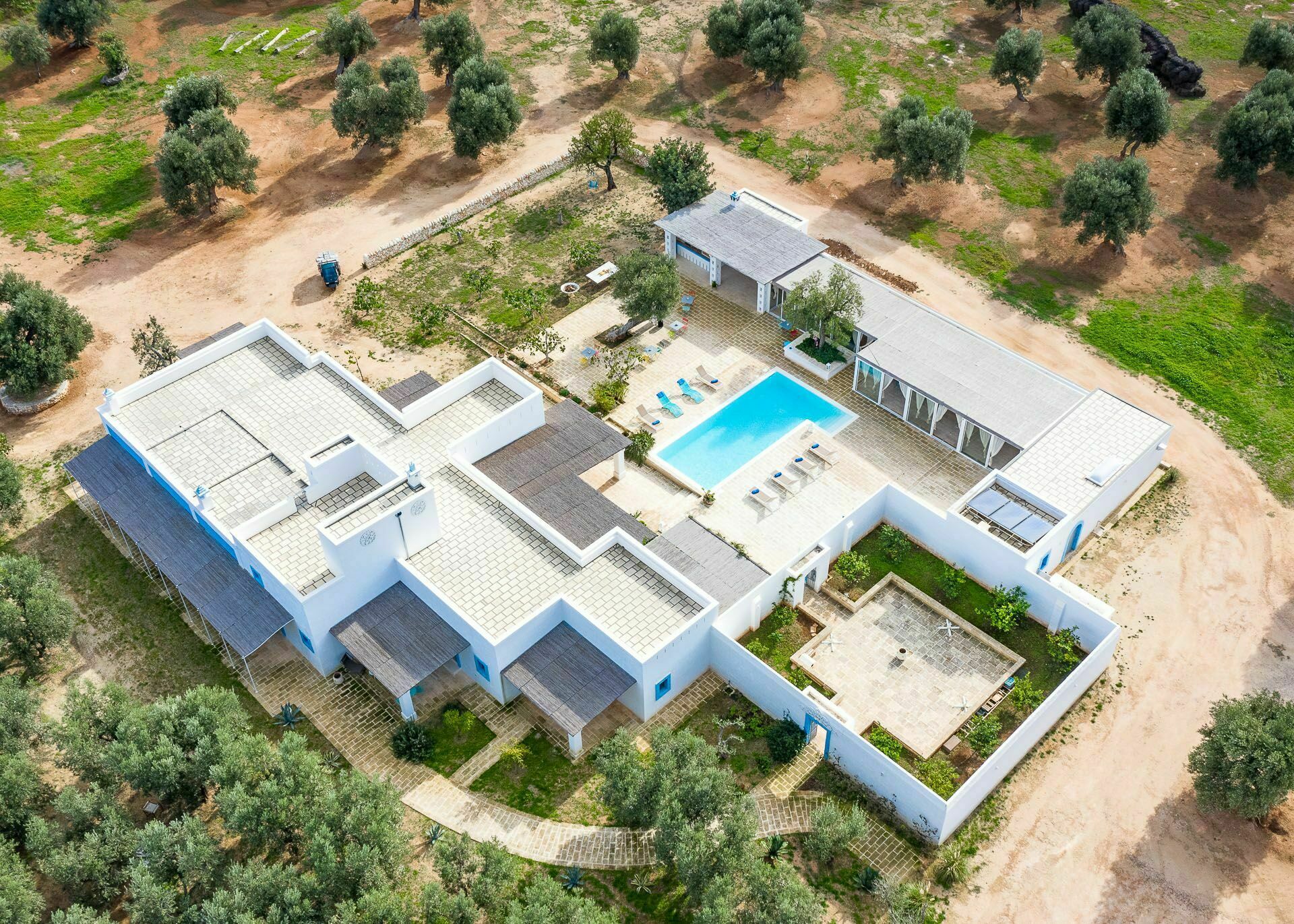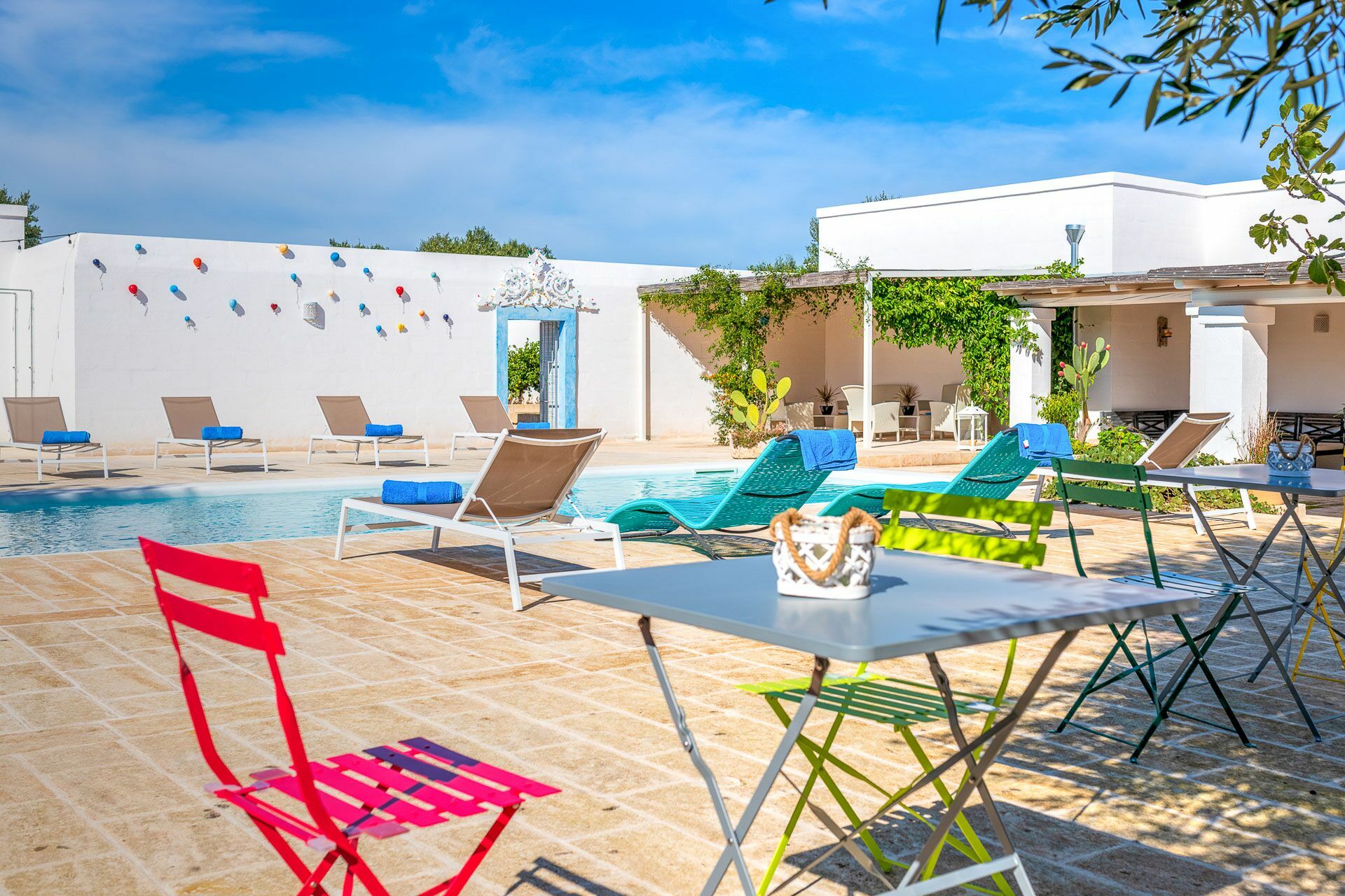 Ook de buitenruimtes zijn zeer uitnodigend. In de grote tuin rondom de vakantiewoning bevindt zich een prachtig privézwembad met Romeinse treden voor gemakkelijke toegang, een pooldeck met ligstoelen en badkamers met douche bij het zwembad. Masseria Tufo Bianco biedt een grote veranda met een traditioneel rieten dak, tafel en stoelen. Er zijn ook verschillende ontspanningsruimtes buiten met loveseats en stoelen. In de fantastische sinaasappelboomgaard van de villa is een rustig hoekje met parasols waar u volledig omringd wordt door de geuren van Apulië. Het kroonjuweel van de villa is een kleine binnenplaats bij het zwembad met vetplanten en olijfbomen, waar u aan een van de verschillende tafels kunt ontbijten, een boek kunt lezen of gewoon kunt ontspannen.