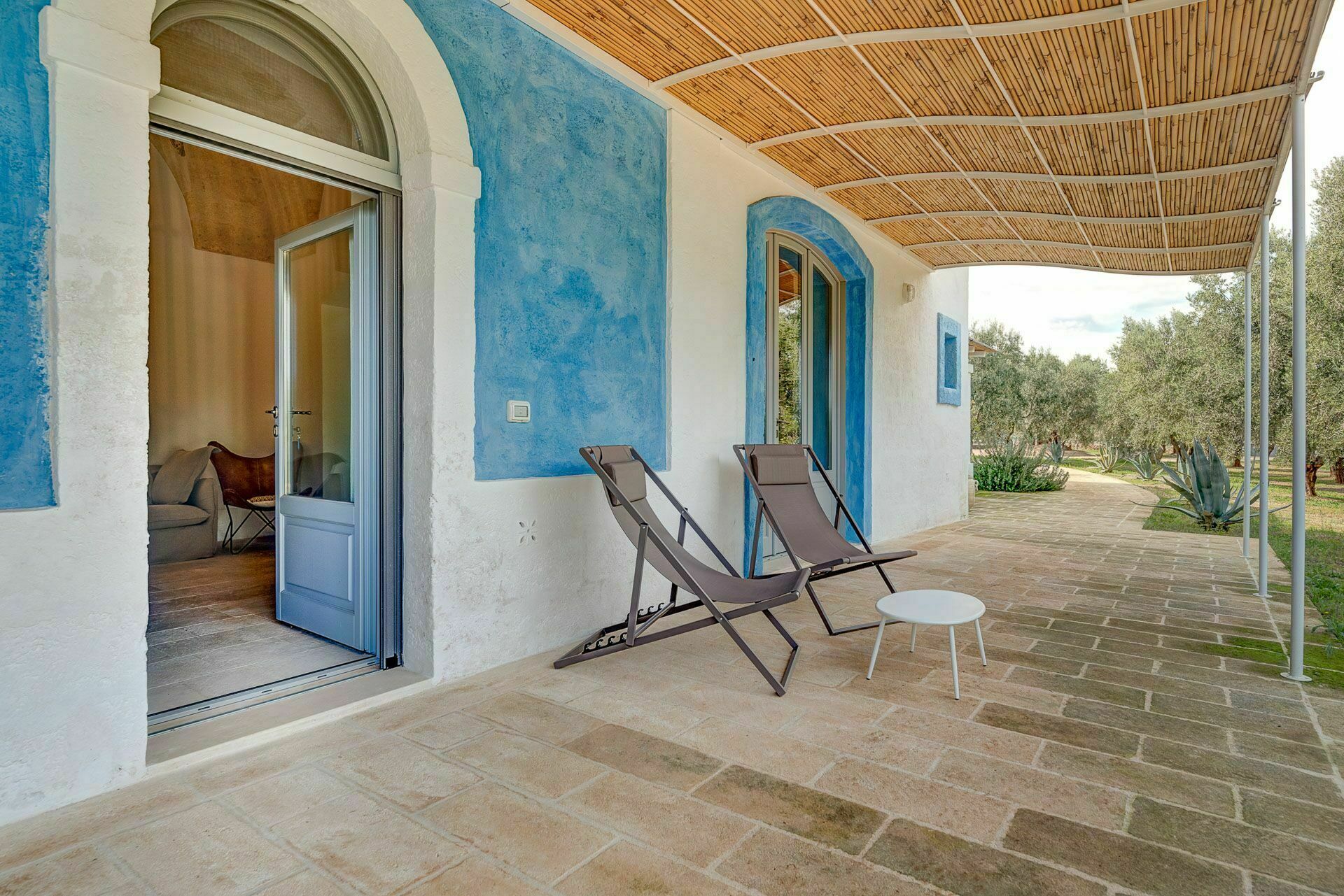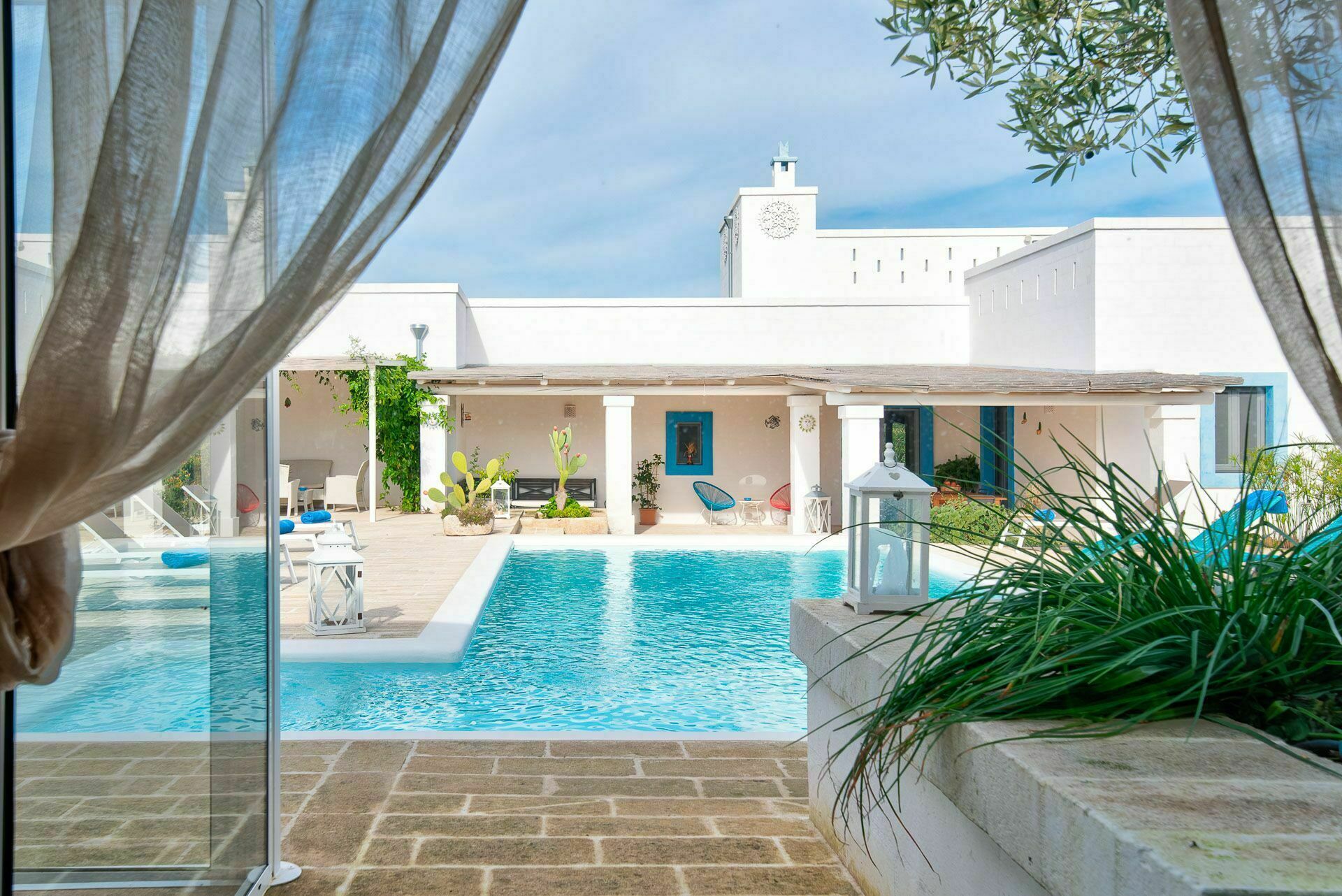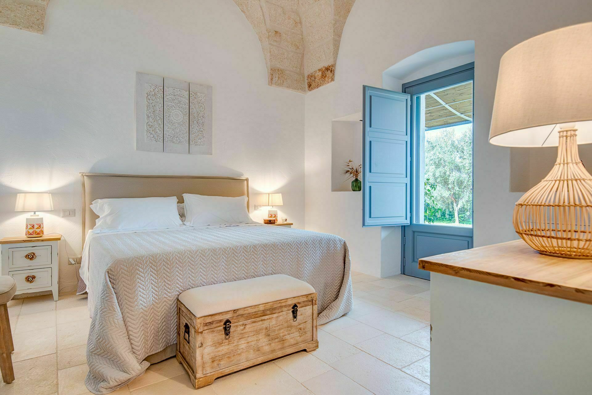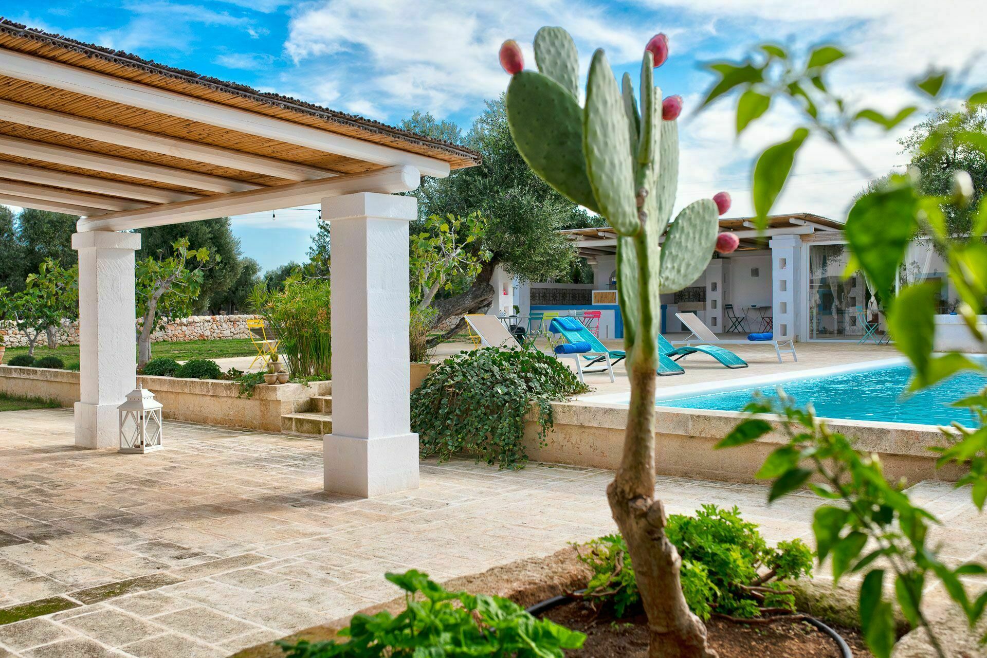 Ook de buitenruimtes zijn zeer uitnodigend. In de grote tuin rondom de vakantiewoning bevindt zich een prachtig privézwembad met Romeinse treden voor gemakkelijke toegang, een pooldeck met ligstoelen en badkamers met douche bij het zwembad. Masseria Tufo Bianco biedt een grote veranda met een traditioneel rieten dak, tafel en stoelen. Er zijn ook verschillende ontspanningsruimtes buiten met loveseats en stoelen. In de fantastische sinaasappelboomgaard van de villa is een rustig hoekje met parasols waar u volledig omringd wordt door de geuren van Apulië. Het kroonjuweel van de villa is een kleine binnenplaats bij het zwembad met vetplanten en olijfbomen, waar u aan een van de verschillende tafels kunt ontbijten, een boek kunt lezen of gewoon kunt ontspannen.