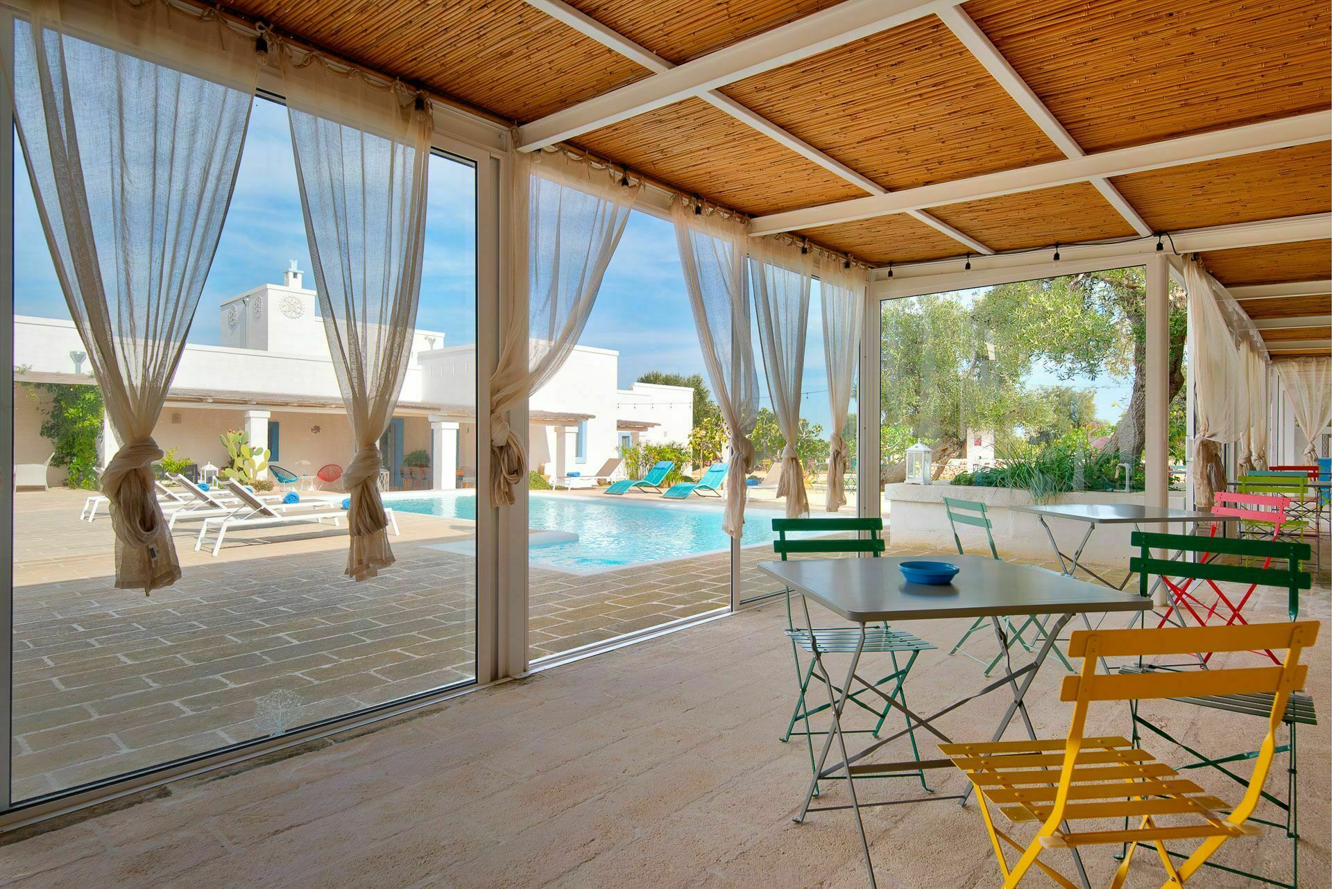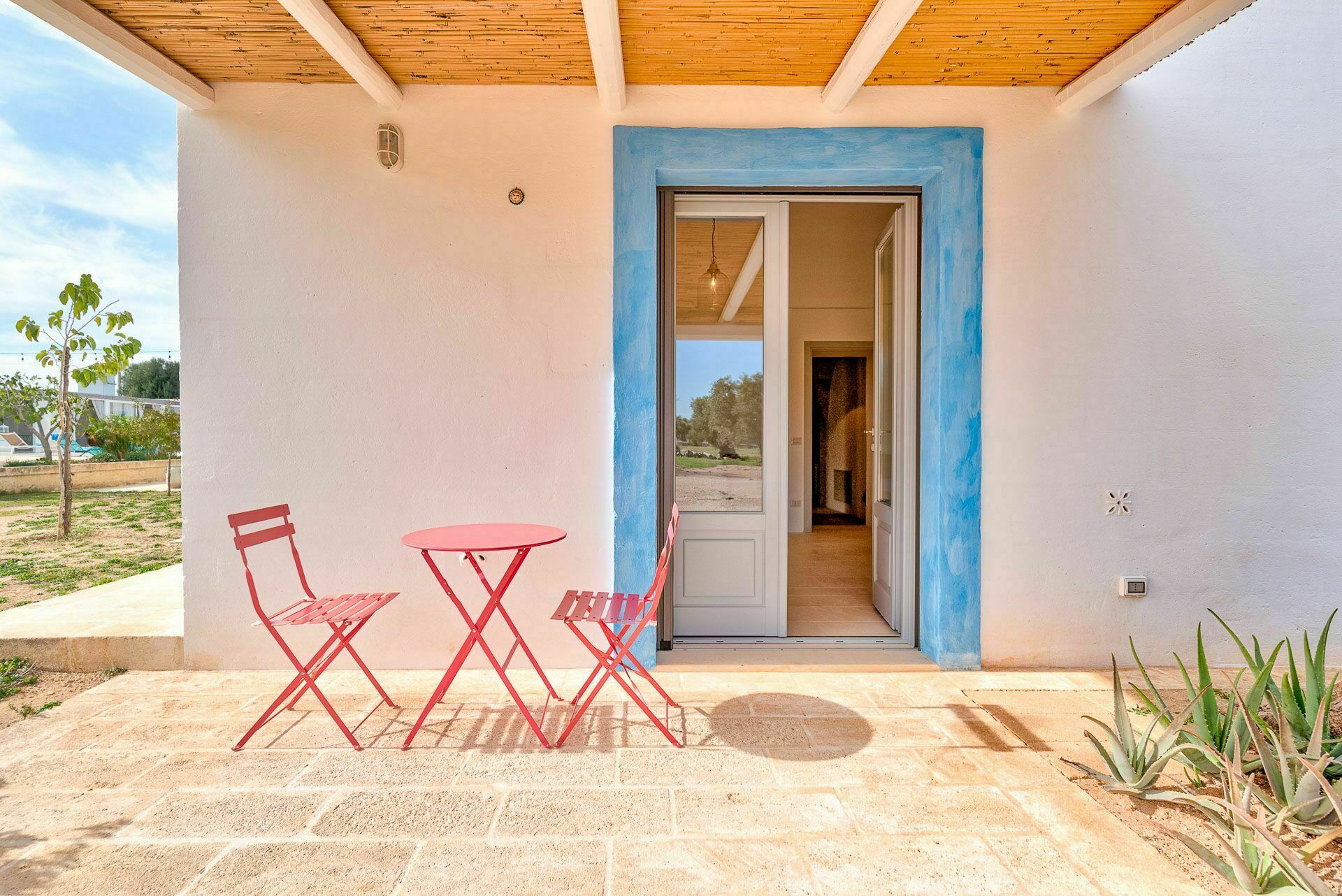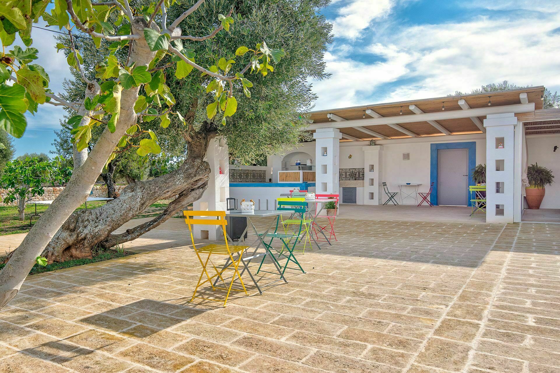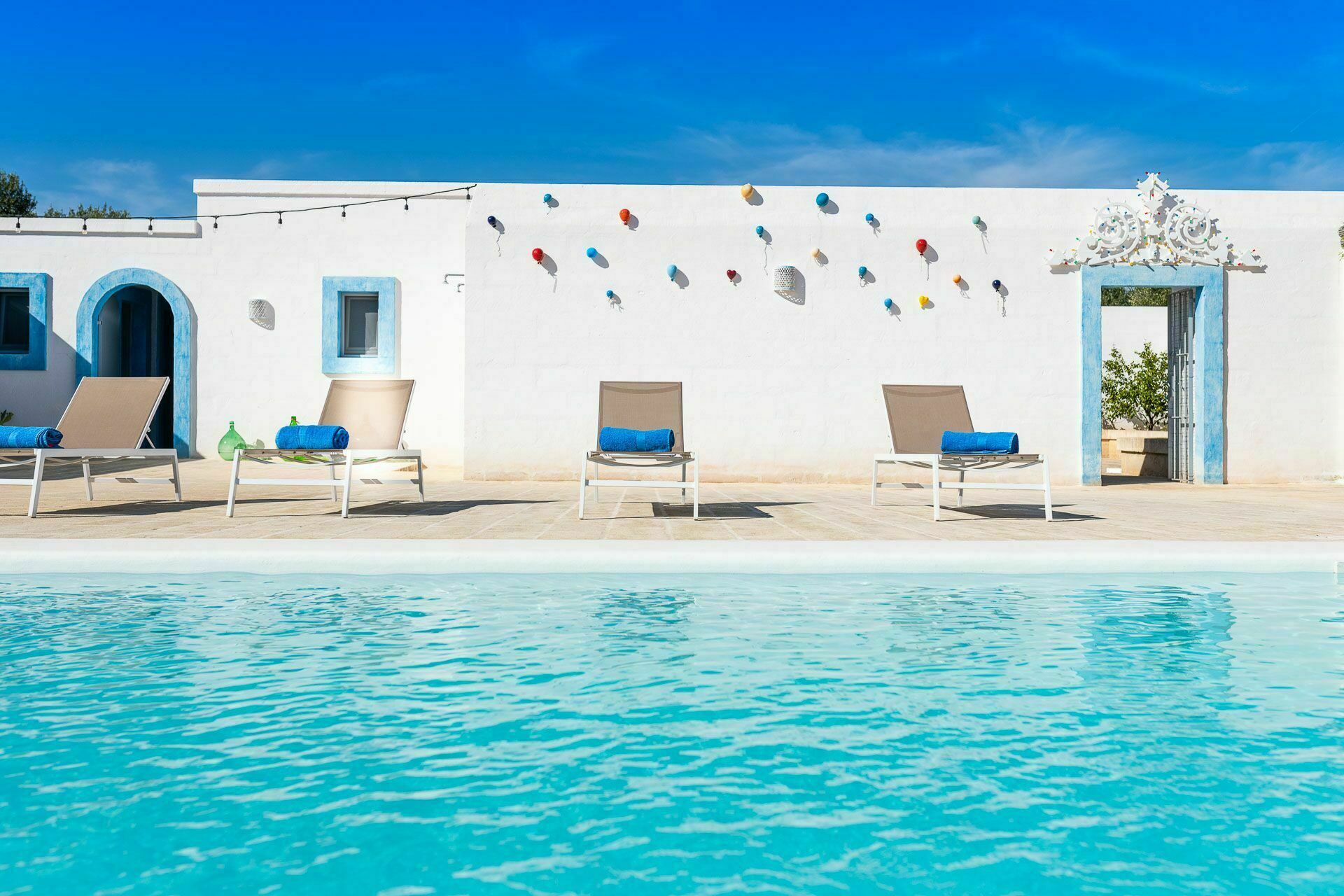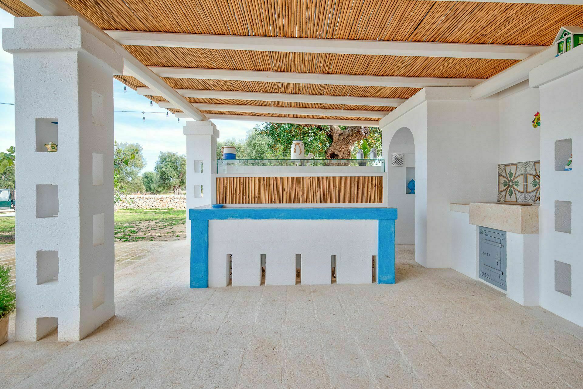 Ook de buitenruimtes zijn zeer uitnodigend. In de grote tuin rondom de vakantiewoning bevindt zich een prachtig privézwembad met Romeinse treden voor gemakkelijke toegang, een pooldeck met ligstoelen en badkamers met douche bij het zwembad. Masseria Tufo Bianco biedt een grote veranda met een traditioneel rieten dak, tafel en stoelen. Er zijn ook verschillende ontspanningsruimtes buiten met loveseats en stoelen. In de fantastische sinaasappelboomgaard van de villa is een rustig hoekje met parasols waar u volledig omringd wordt door de geuren van Apulië. Het kroonjuweel van de villa is een kleine binnenplaats bij het zwembad met vetplanten en olijfbomen, waar u aan een van de verschillende tafels kunt ontbijten, een boek kunt lezen of gewoon kunt ontspannen.