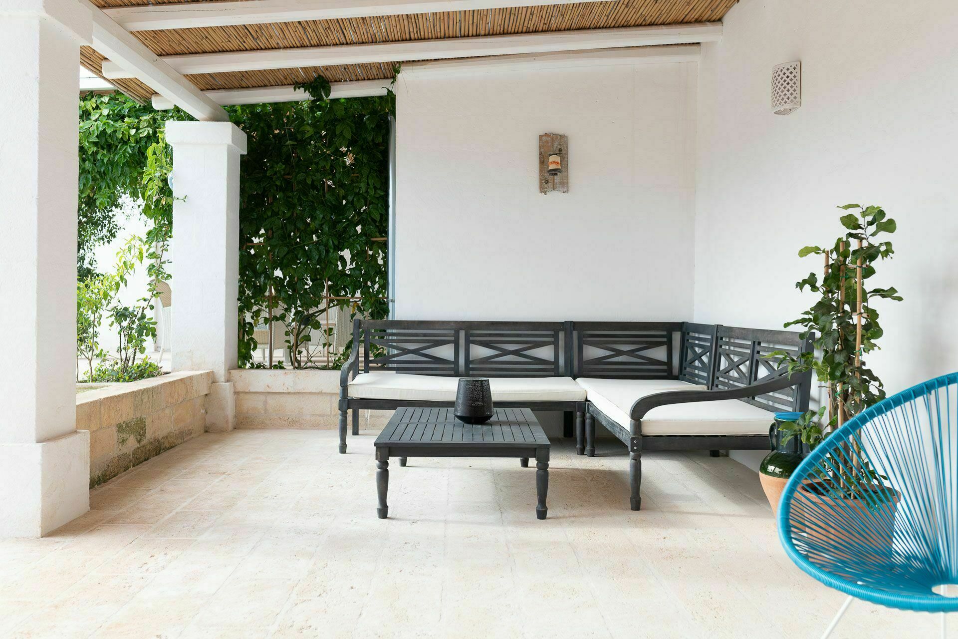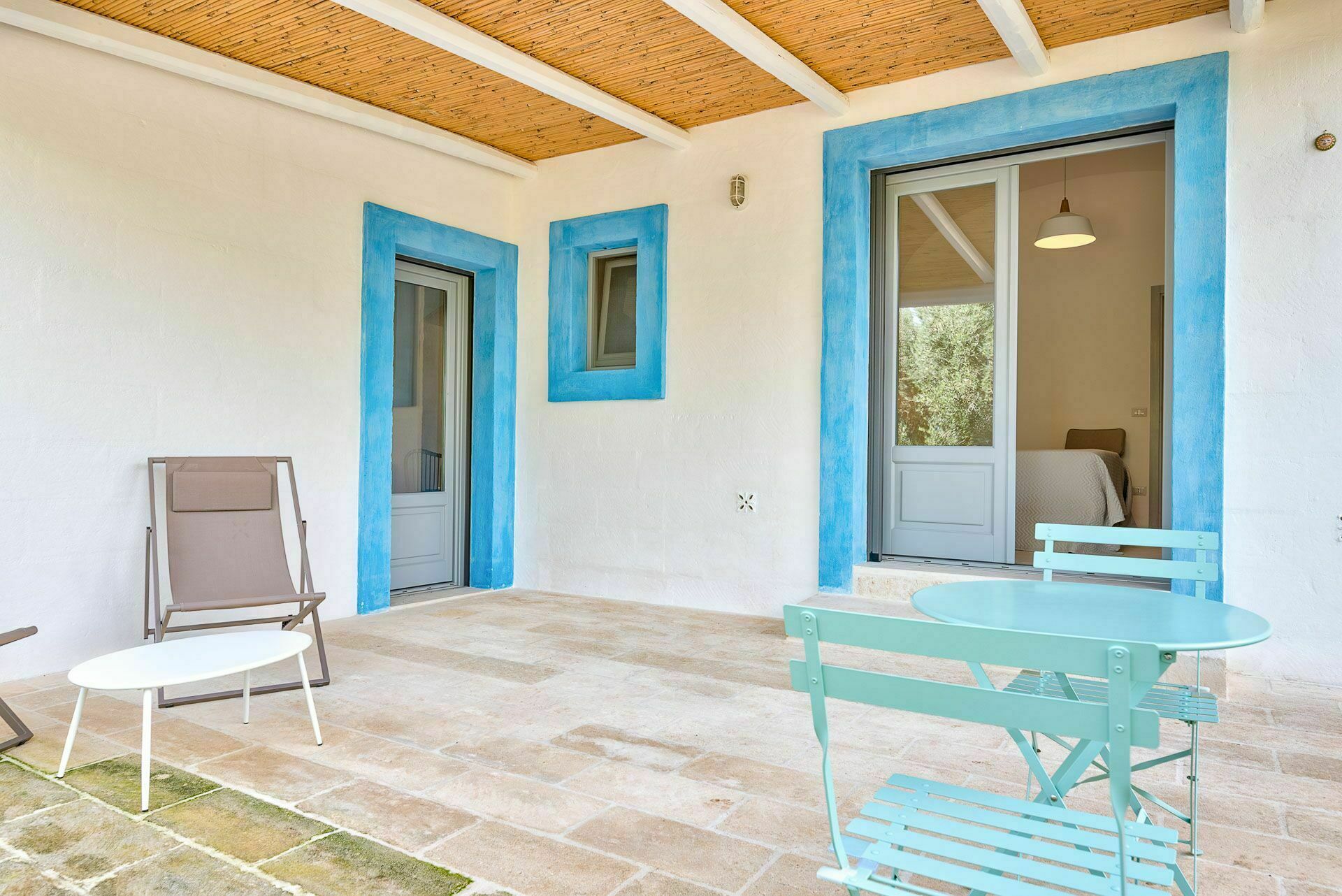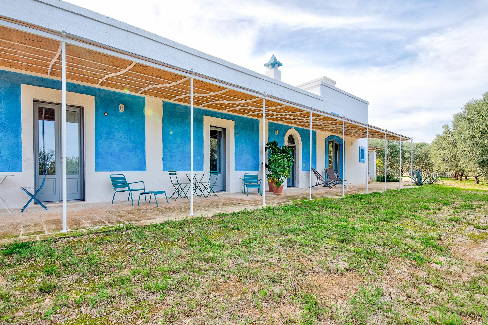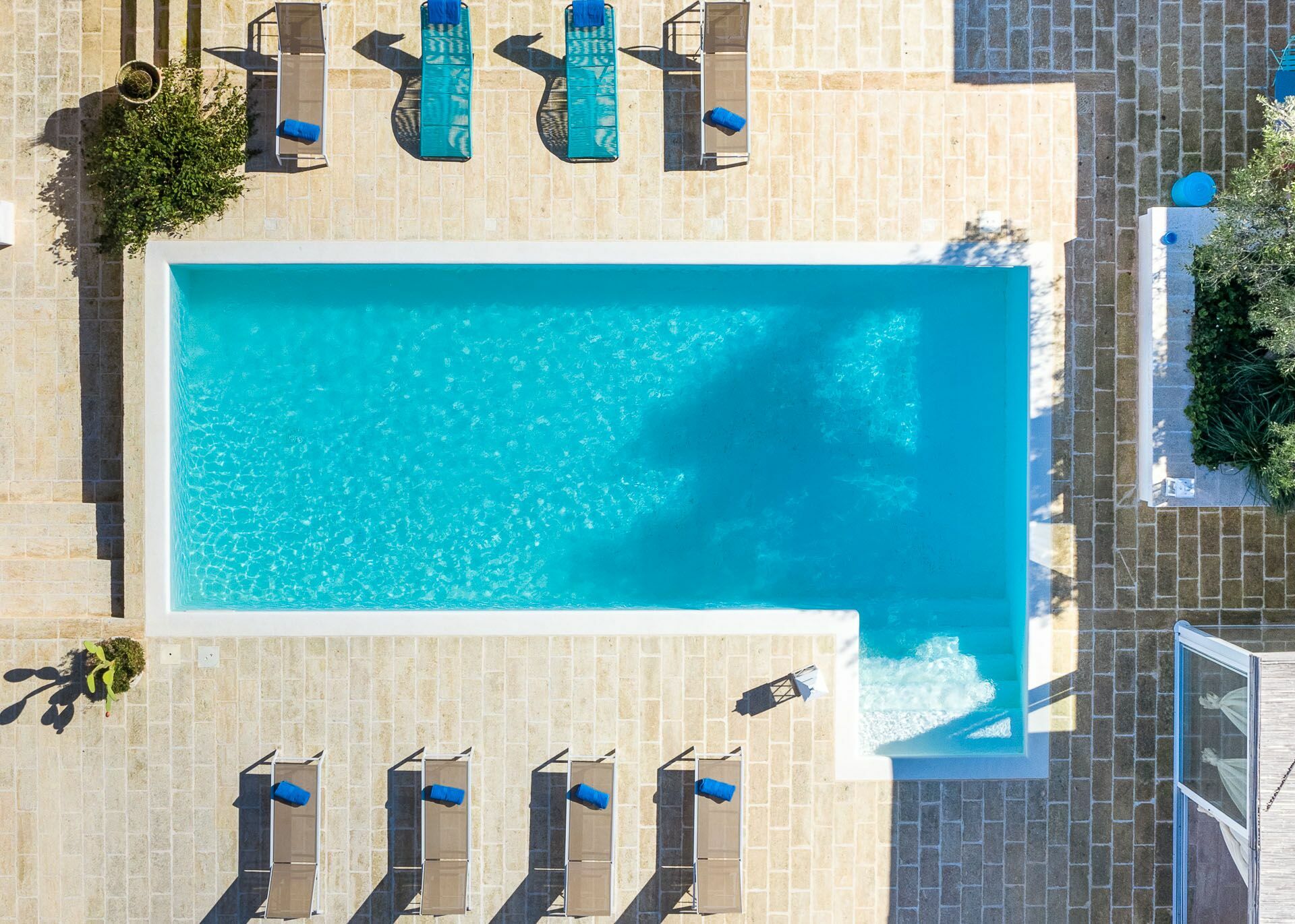 Ook de buitenruimtes zijn zeer uitnodigend. In de grote tuin rondom de vakantiewoning bevindt zich een prachtig privézwembad met Romeinse treden voor gemakkelijke toegang, een pooldeck met ligstoelen en badkamers met douche bij het zwembad. Masseria Tufo Bianco biedt een grote veranda met een traditioneel rieten dak, tafel en stoelen. Er zijn ook verschillende ontspanningsruimtes buiten met loveseats en stoelen. In de fantastische sinaasappelboomgaard van de villa is een rustig hoekje met parasols waar u volledig omringd wordt door de geuren van Apulië. Het kroonjuweel van de villa is een kleine binnenplaats bij het zwembad met vetplanten en olijfbomen, waar u aan een van de verschillende tafels kunt ontbijten, een boek kunt lezen of gewoon kunt ontspannen.
