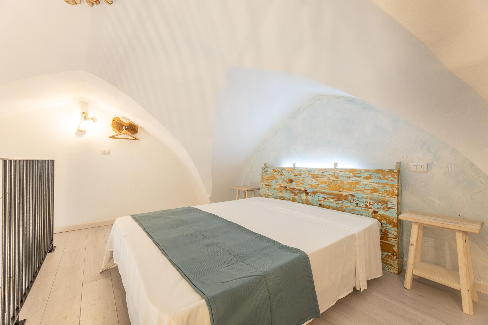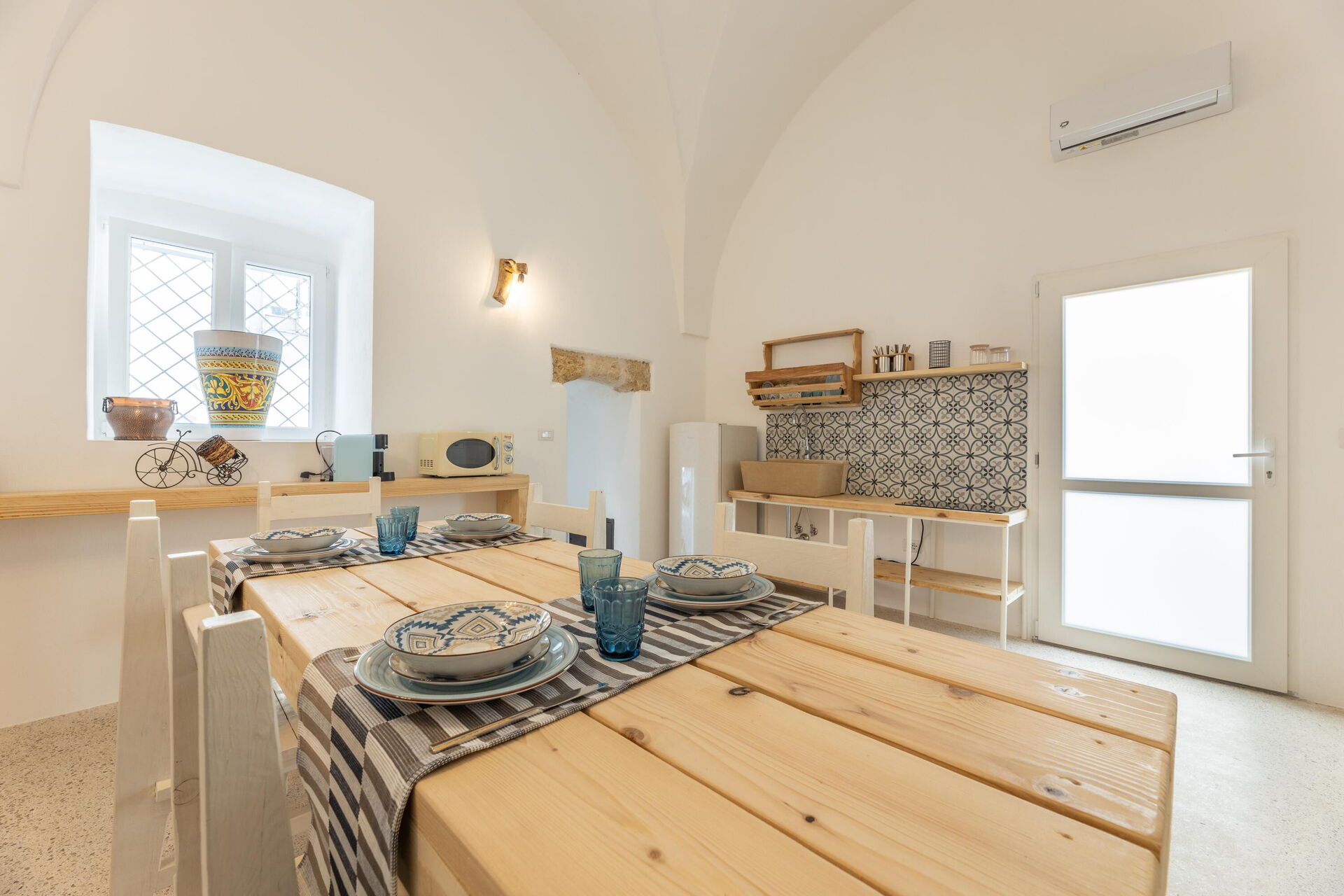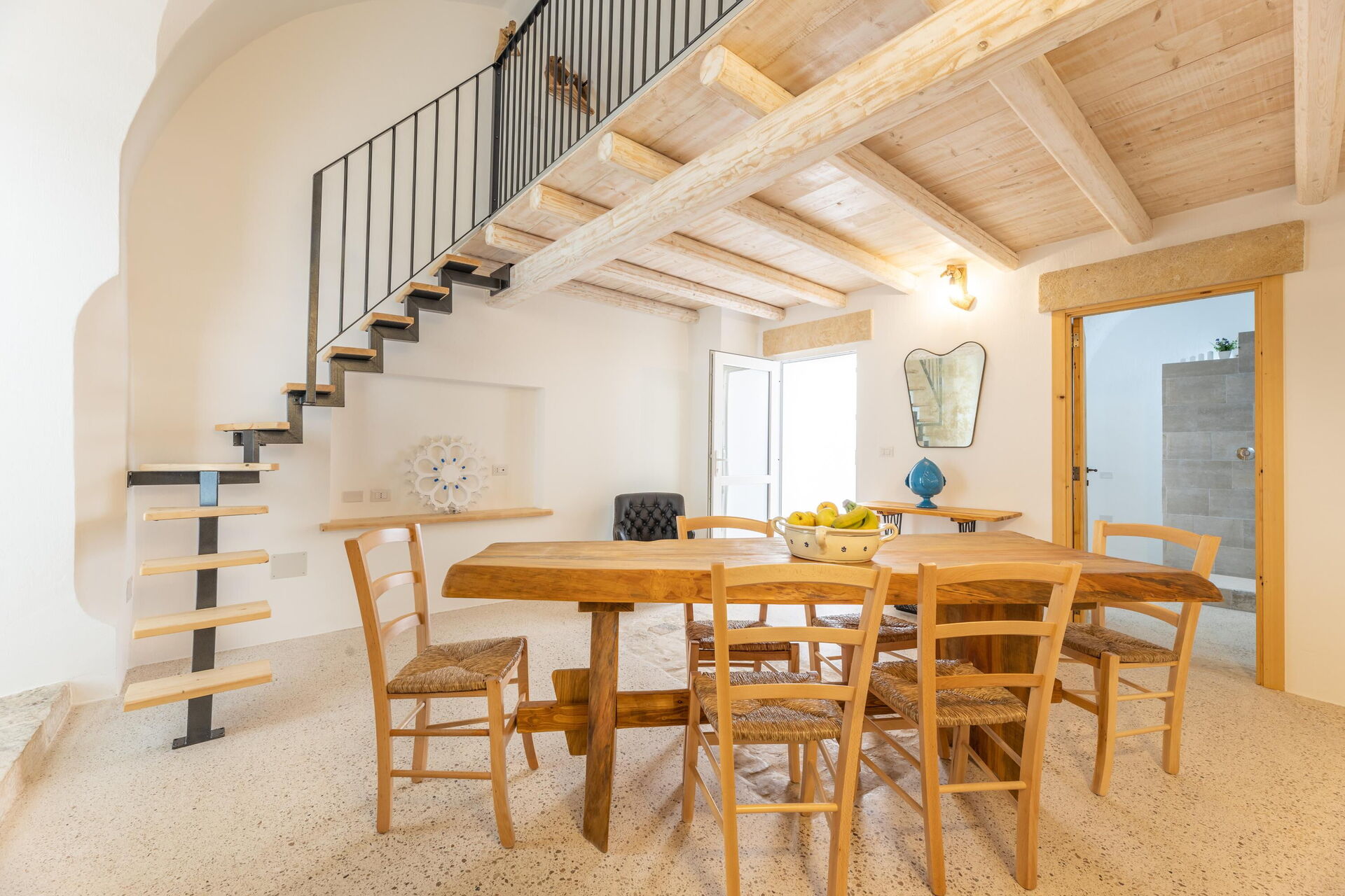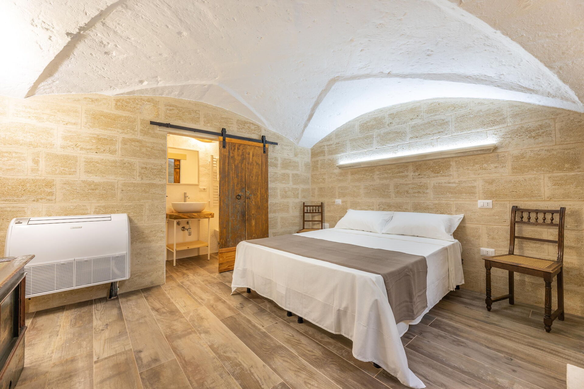 Het interieur van deze vakantiewoning in Puglia is voorzien van hout en steen, traditionele materialen uit Salento. De witte kleur, gewelfde plafonds en stenen aan de muur geven je het gevoel dat je in een traditioneel landhuis bent, ook al ben je midden in het stadscentrum.