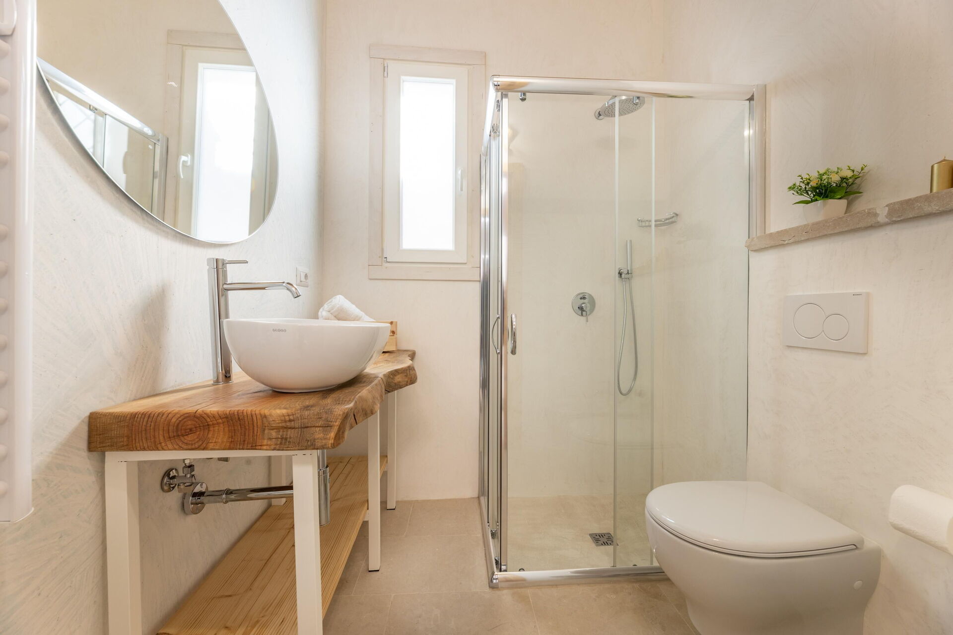 Benedenverdieping:: slaapkamer met tweepersoonsbed (airconditioning) met eigen badkamer met douche; zwembad (verwarmbaar op aanvraag) toegankelijk vanuit de ontspanningsruimte op de begane grond.