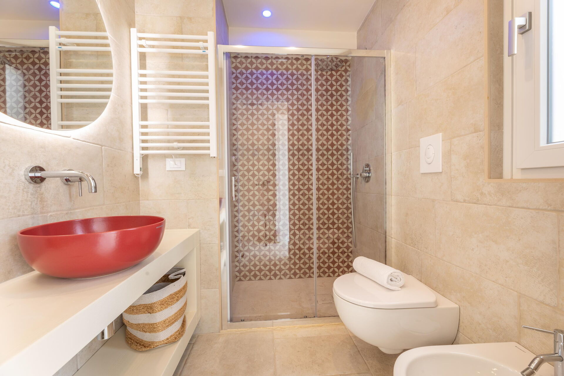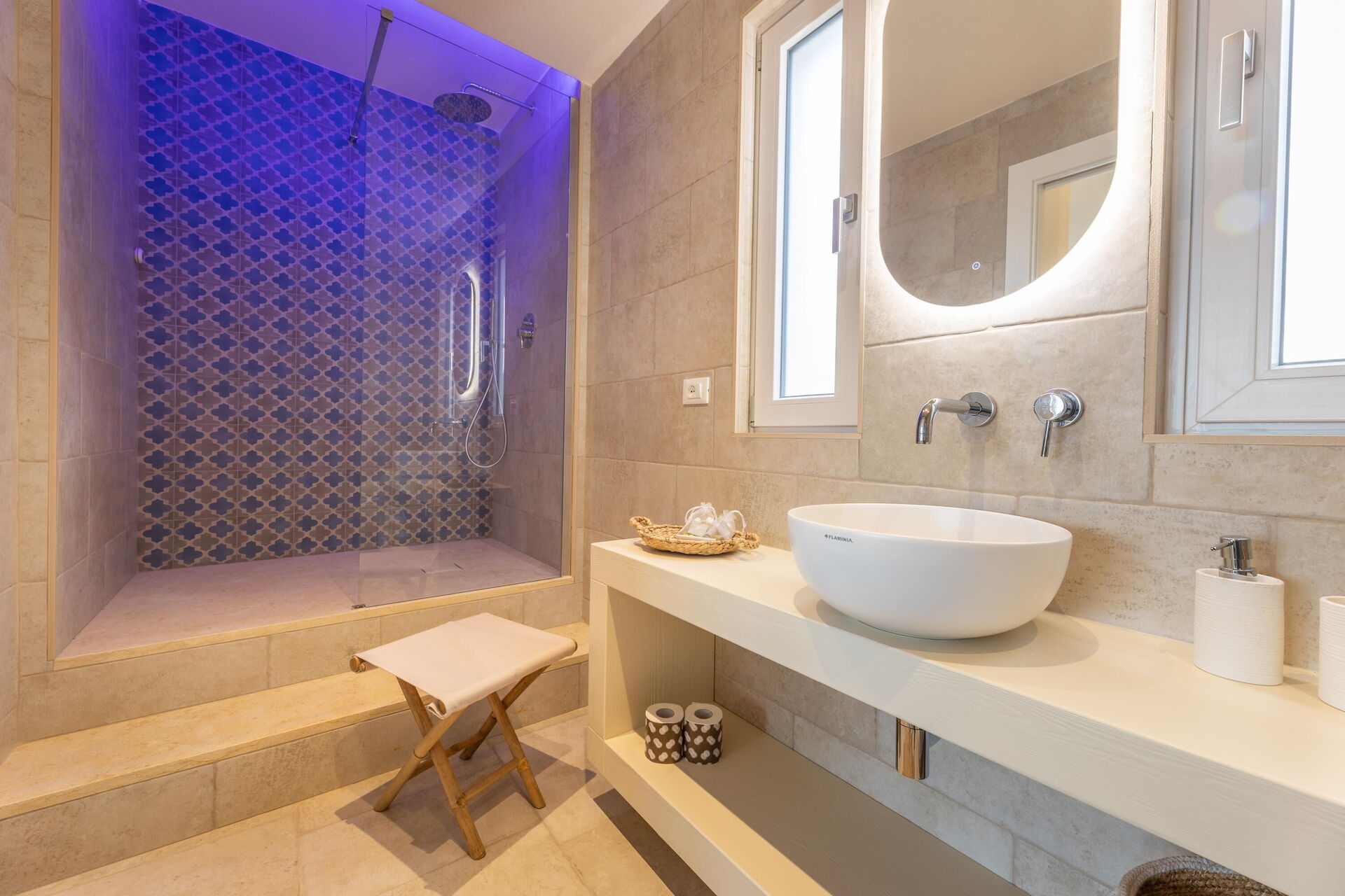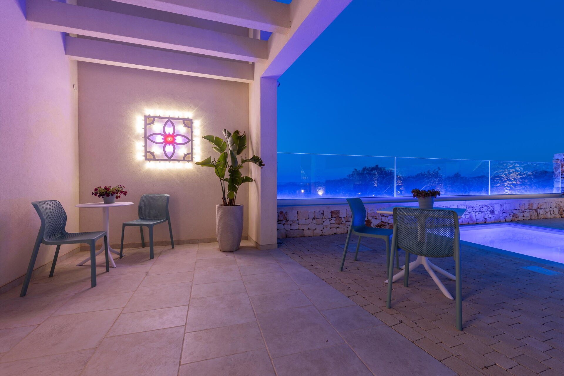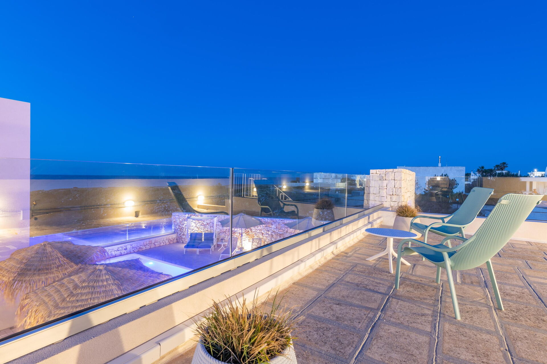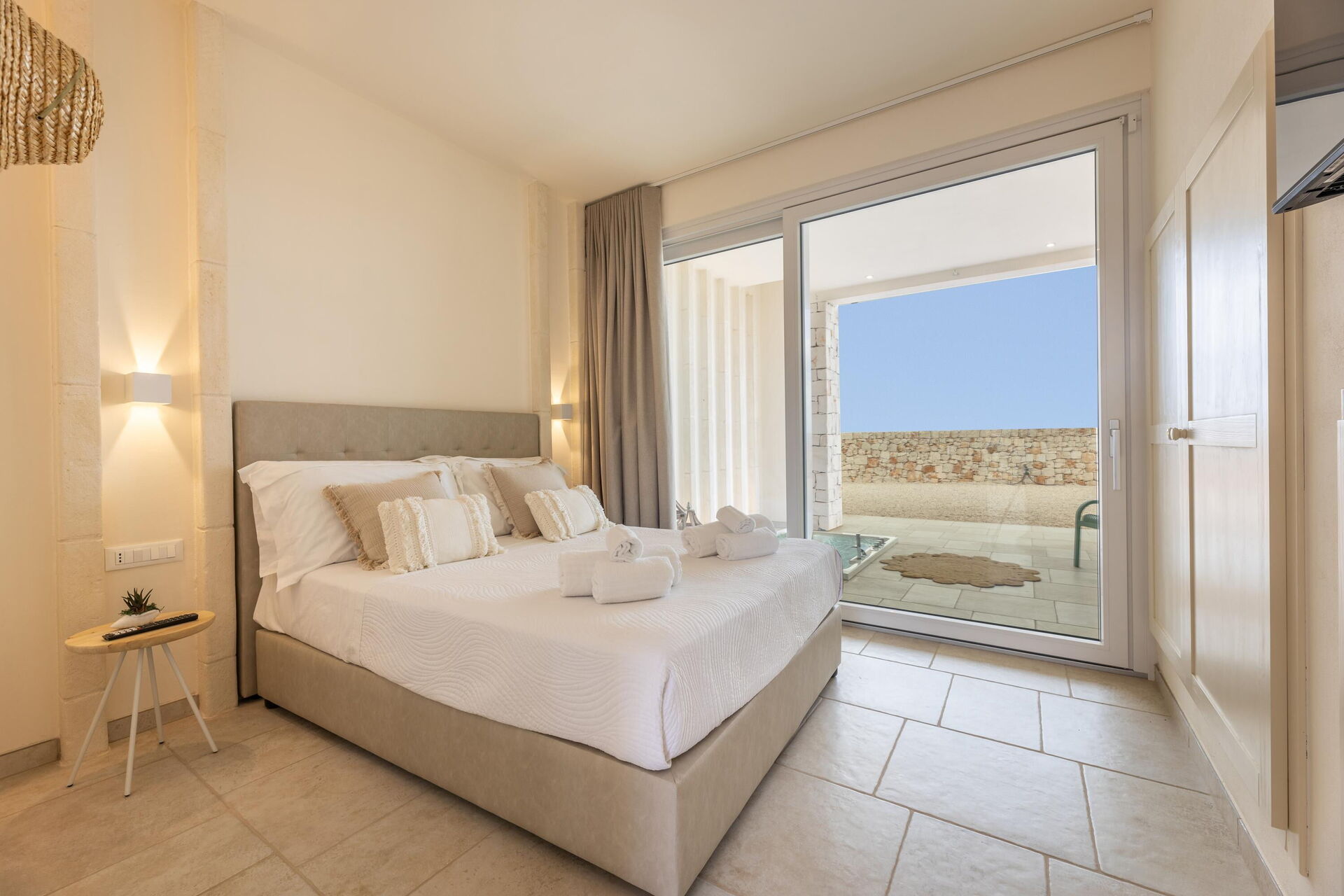 Begane grond: (alleen van buitenaf toegankelijk en niet intern verbonden met elkaar of met de rest van de villa): 3 tweepersoonsslaapkamers, elk met een eigen badkamer met douche en een buiten bubbelbad (1,80 x 1,20 meter; diepte 0,40 meter; verwarmd tot 28–32 °C)