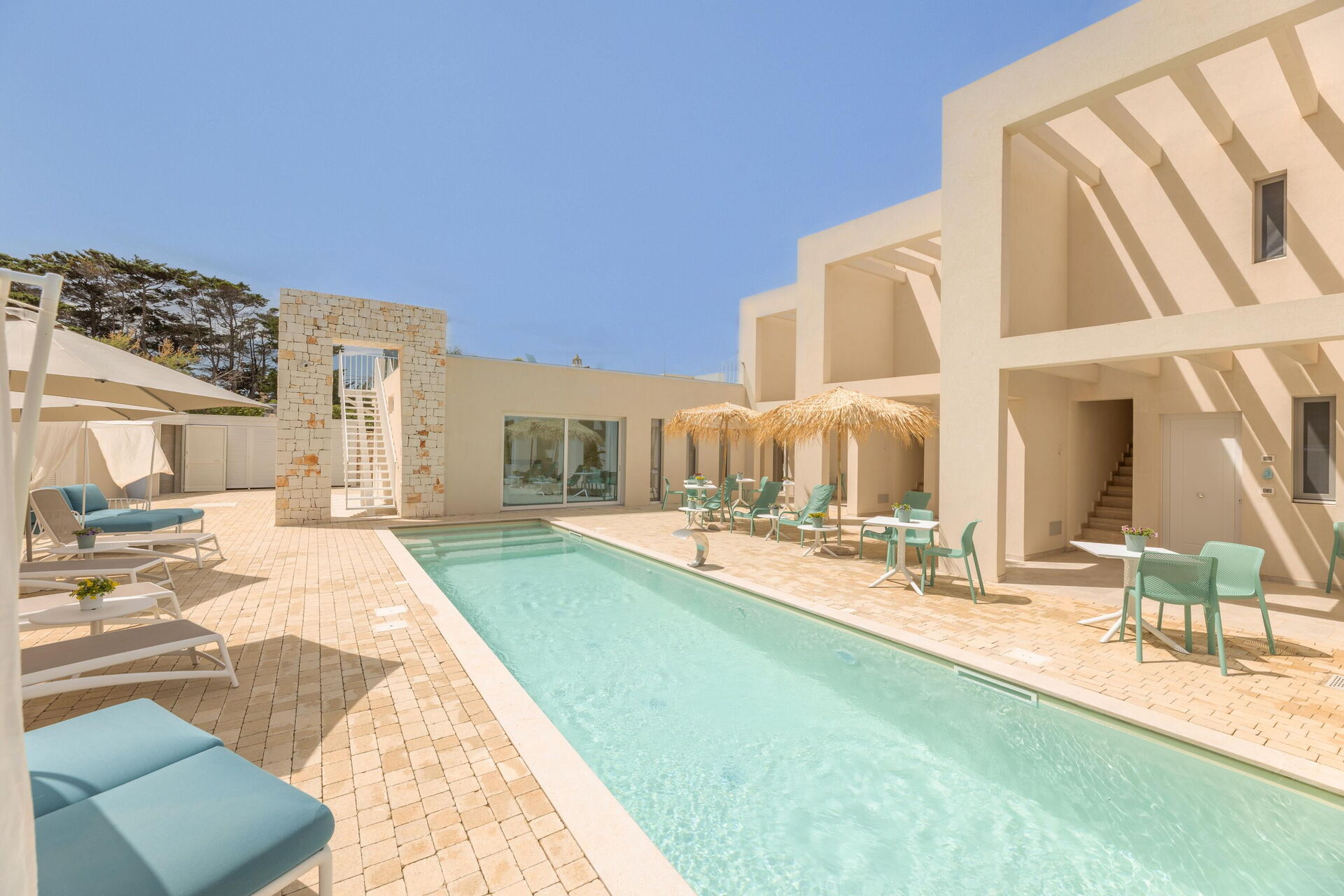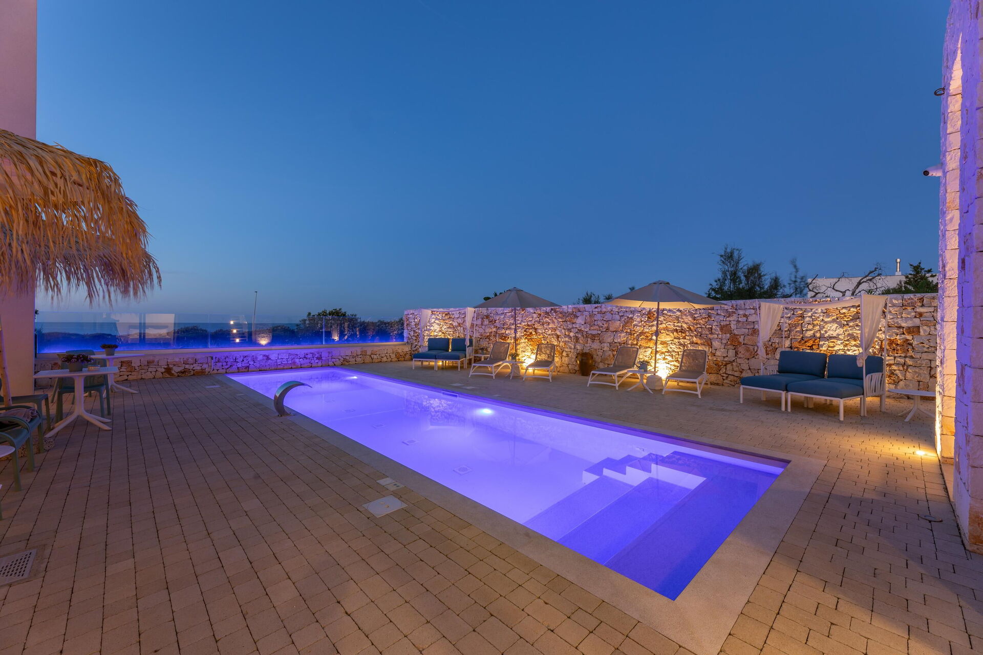 Het terrein biedt verschillende gemeenschappelijke ruimtes: u kunt ontspannen bij het zwembad, op het zonneterras en op het terras met een prachtig panoramisch uitzicht op zee; dit alles maakt de villa perfect voor een ontspannen vakantie met vrienden of familie onder de warme zon van Puglia.