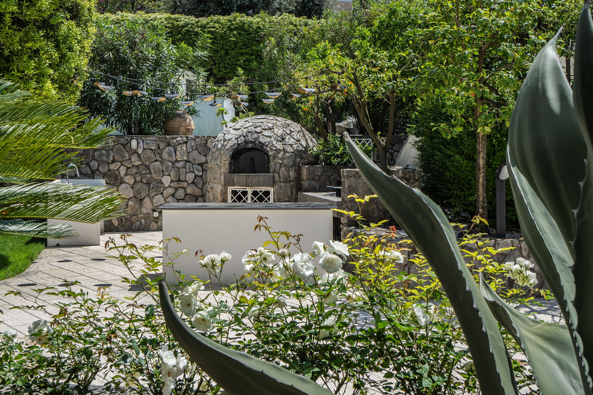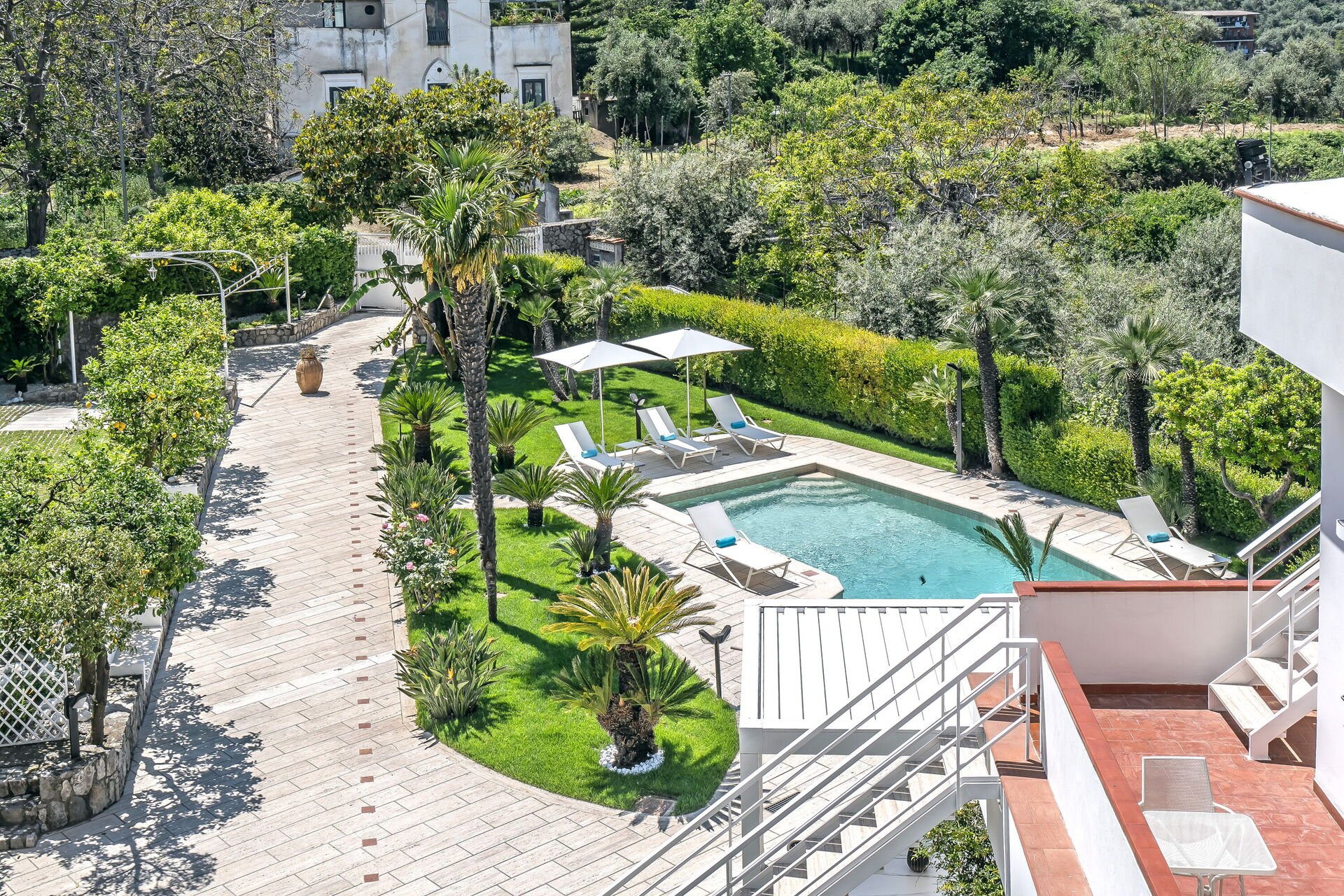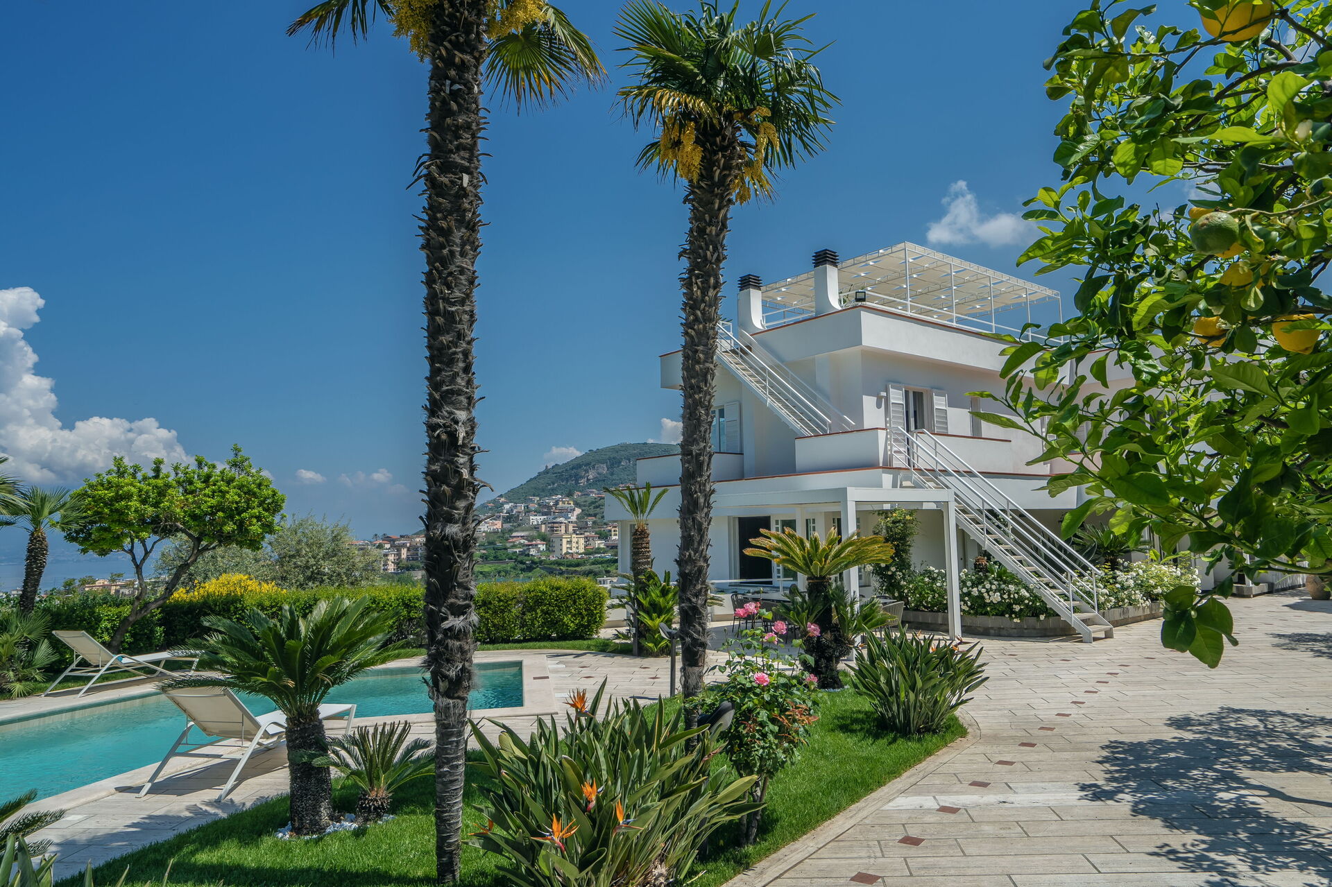 Toegang tot Villa Antonietta is via een weelderige tuin met citroen-, grapefruit-, bananen- en palmbomen.