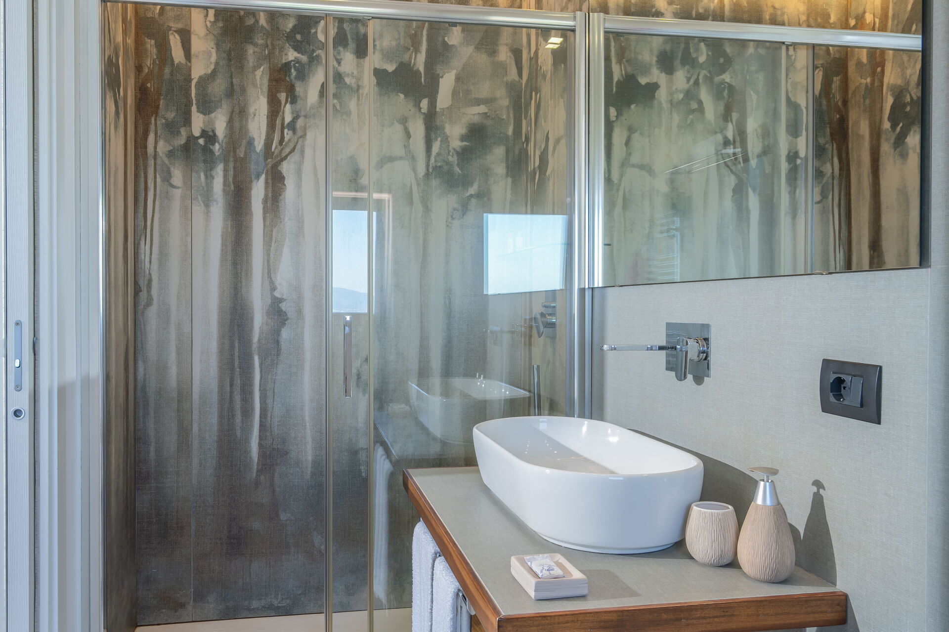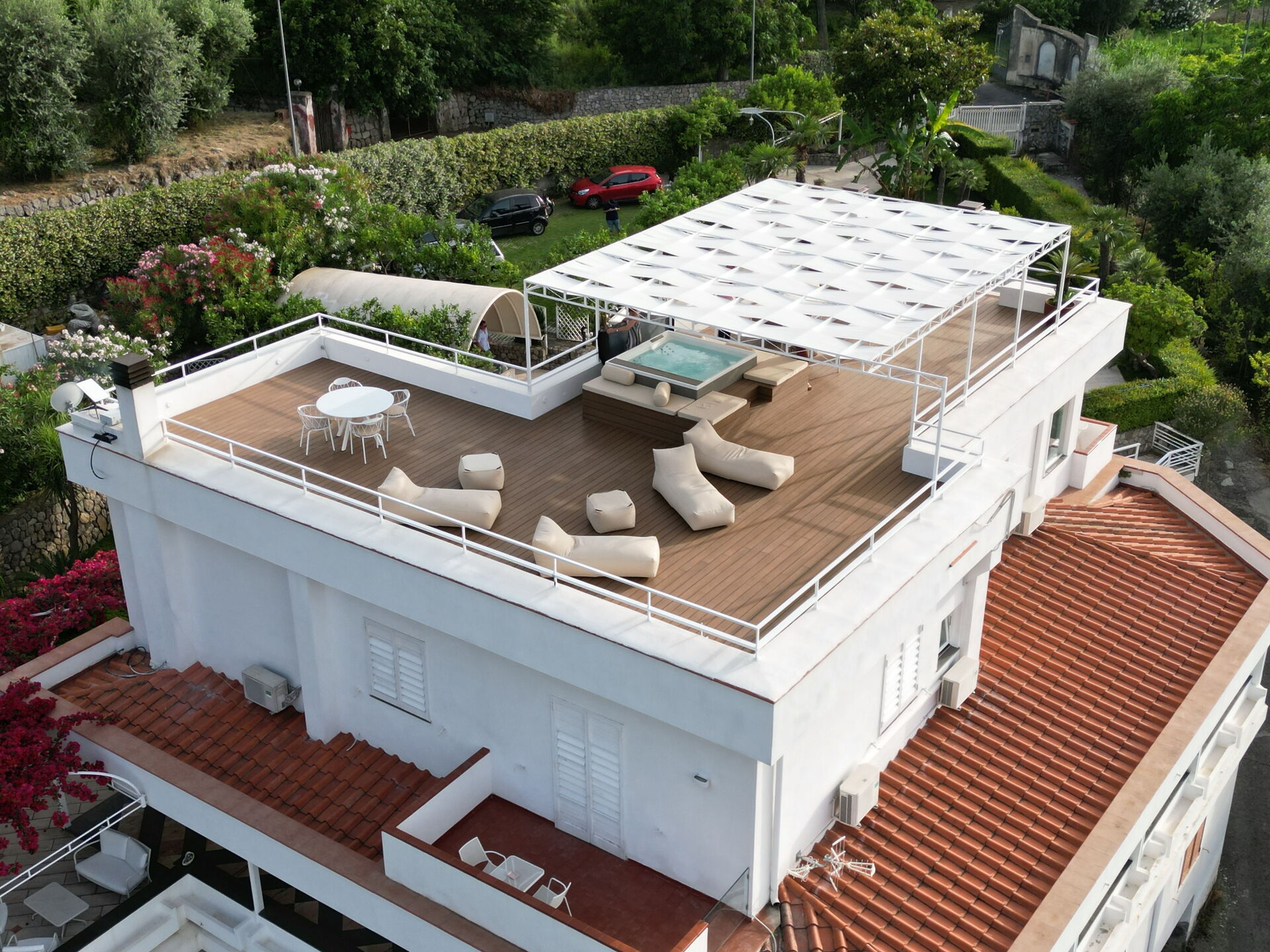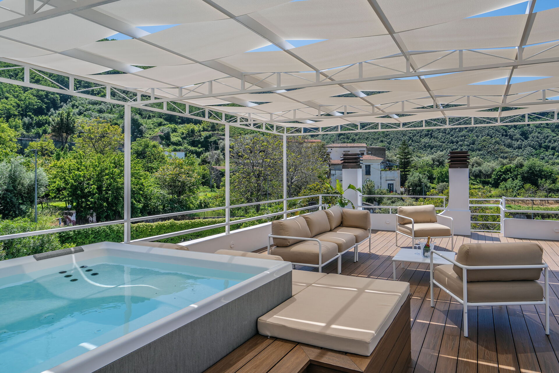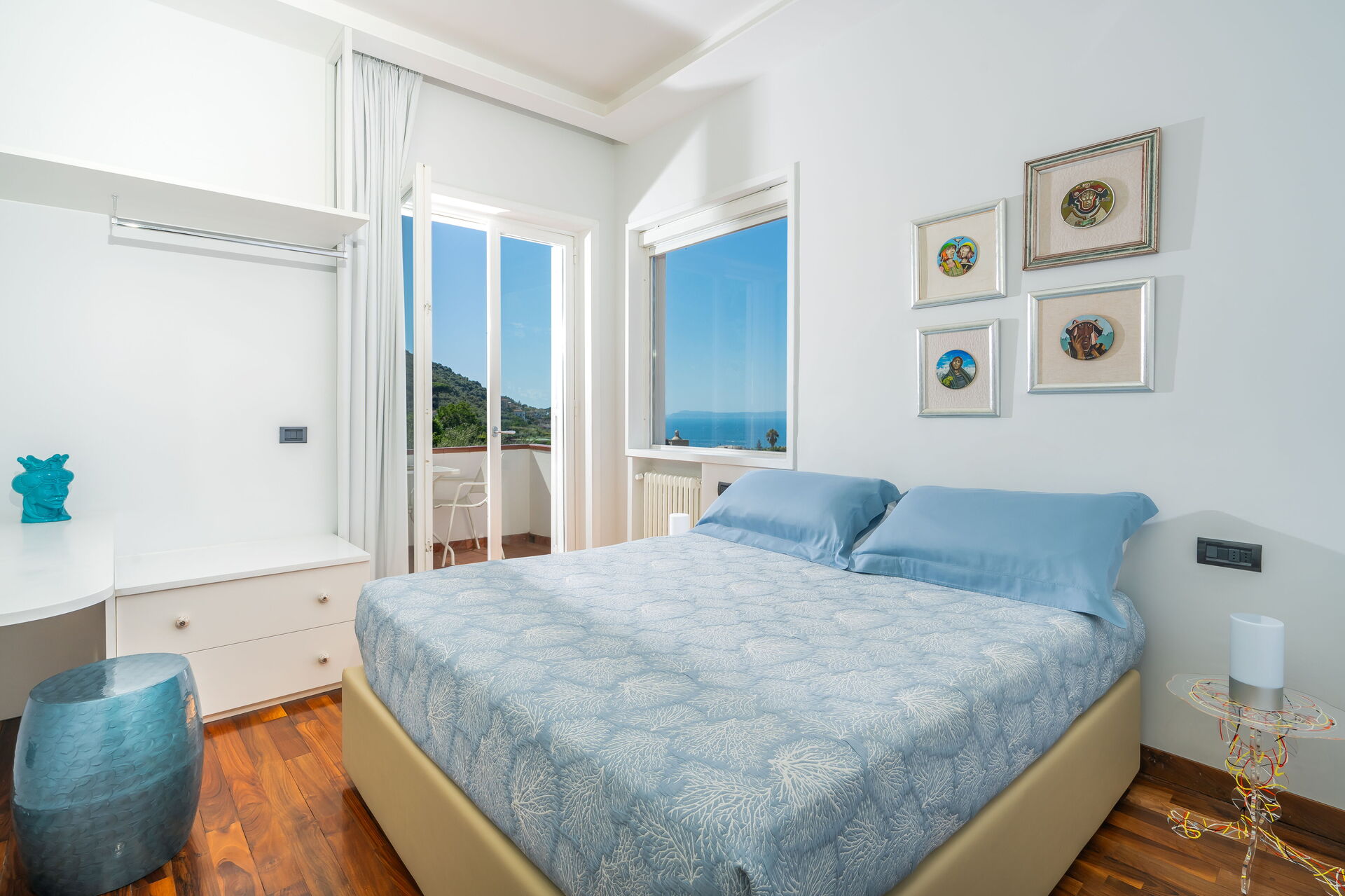 Eerste verdieping: 2 tweepersoonskamers met elk een eigen badkamer met douche; slaapkamer met tweepersoonsbed (op verzoek kan het bed worden gescheiden tot 2 eenpersoonsbedden) met eigen badkamer met douche; suite met voorkamer met tweepersoonsslaapbank en hoofdslaapkamer met tweepersoonsbed met eigen badkamer met bubbelbad en douche. Elke slaapkamer heeft een smart-tv die is aangesloten op snelle wifi en een terras met tafel en stoelen (twee terrassen hebben uitzicht op zee en twee terrassen hebben uitzicht op de tuin en het zwembad).