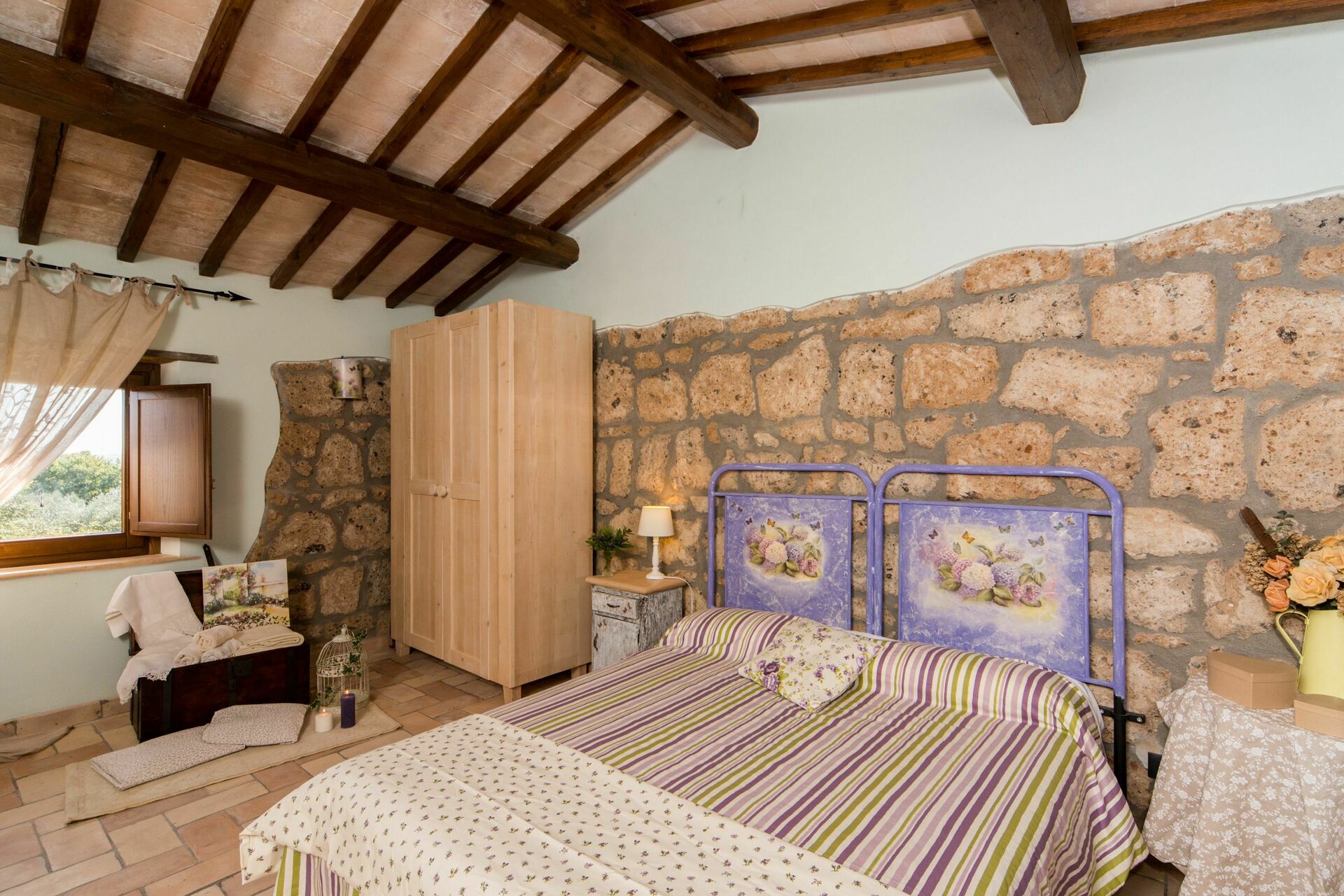 Deze mooie vakantievilla met drie slaapkamer met airconditioning biedt een betoverend panoramisch uitzicht over het omliggende landschap. De vakantiewoning is omgeven door een enorme tuin (4 hectare) met olijfbomen, bosjes en fruitbomen.