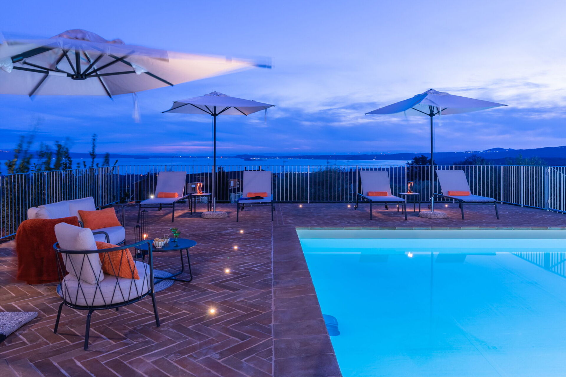 Buiten is er een goed onderhouden tuin van circa 2.000 m². Hier vindt u een prachtig privézwembad met een schilderachtig uitzicht op het Meer van Bolsena, ideaal om af te koelen op warme zomerdagen. De veranda met buiten-eetgedeelte is nog een plek die perfect is om te ontspannen met familie of vrienden.