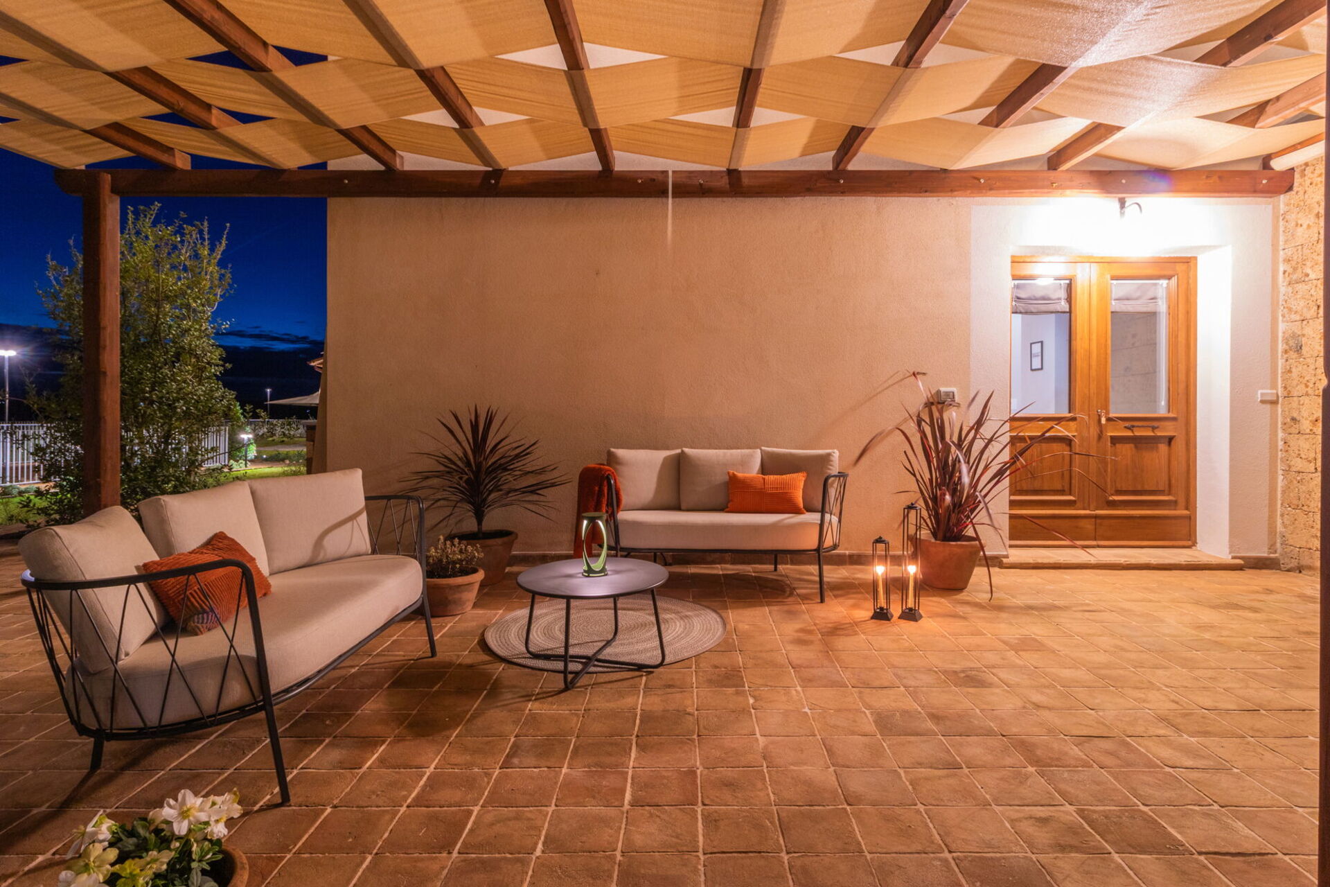 - schilderachtige veranda met houten pergola, zonwering en buiten-eetgedeelte