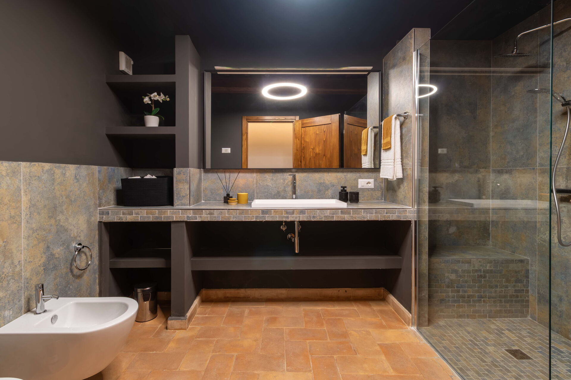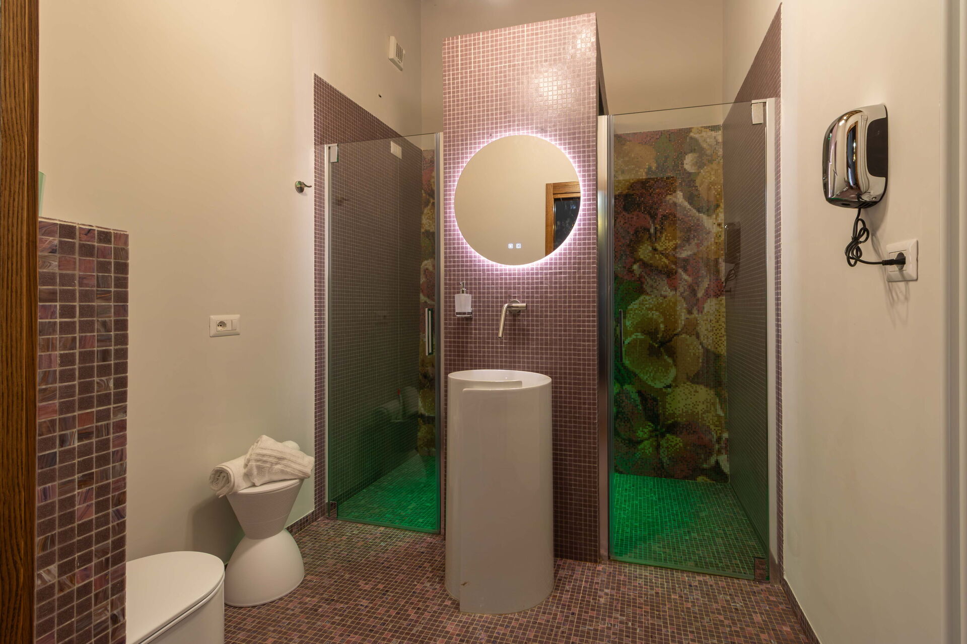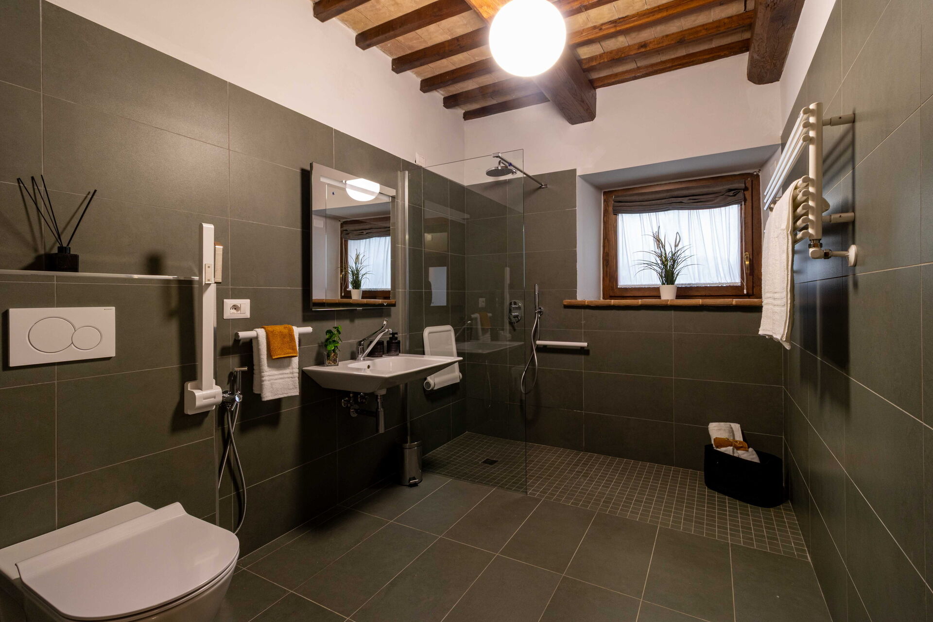 Begane grond (niet intern verbonden met de andere units): tweepersoonsslaapkamer (op aanvraag kan het king-size bed worden omgezet in 2 eenpersoonsbedden) met eigen badkamer met drempelloze douche (ideaal voor mensen met beperkte mobiliteit of een beperking).