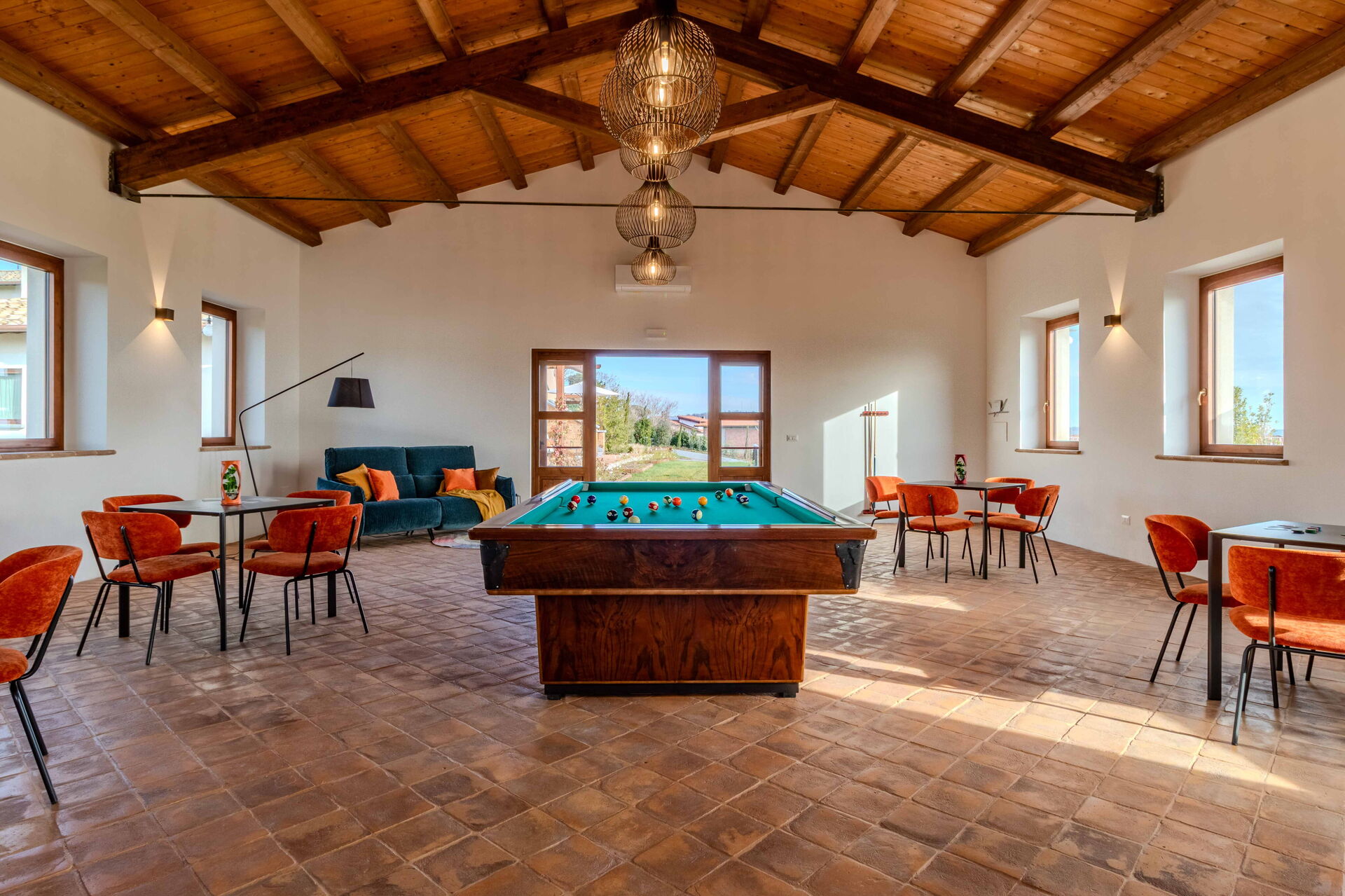 Begane grond: (toegankelijk vanuit de tuin boven het zwembad en niet intern verbonden met de andere units): woonkamer (airconditioning) met kleine banken en fauteuils, biljarttafel, tafelvoetbal en grote wandprojector.