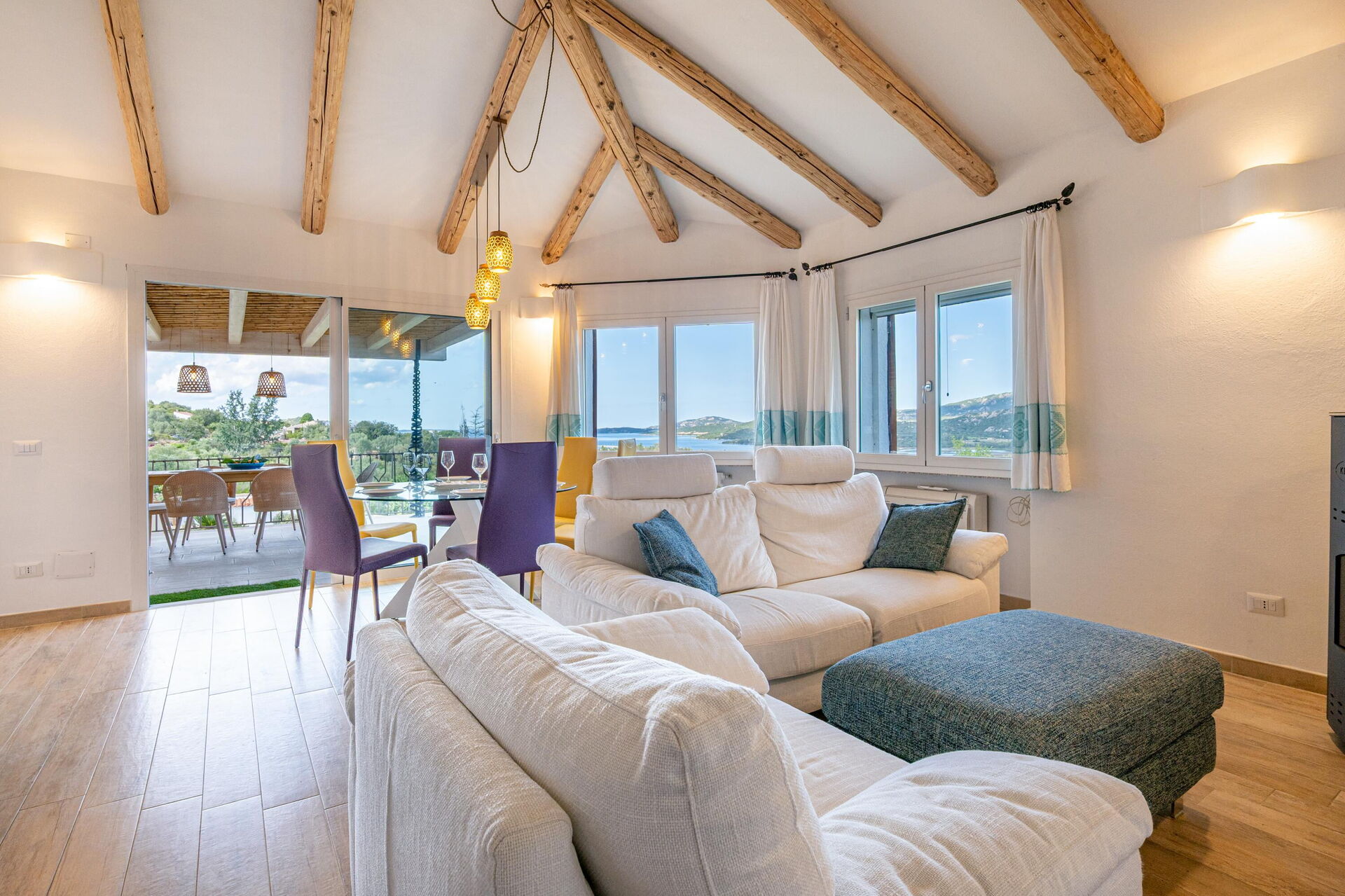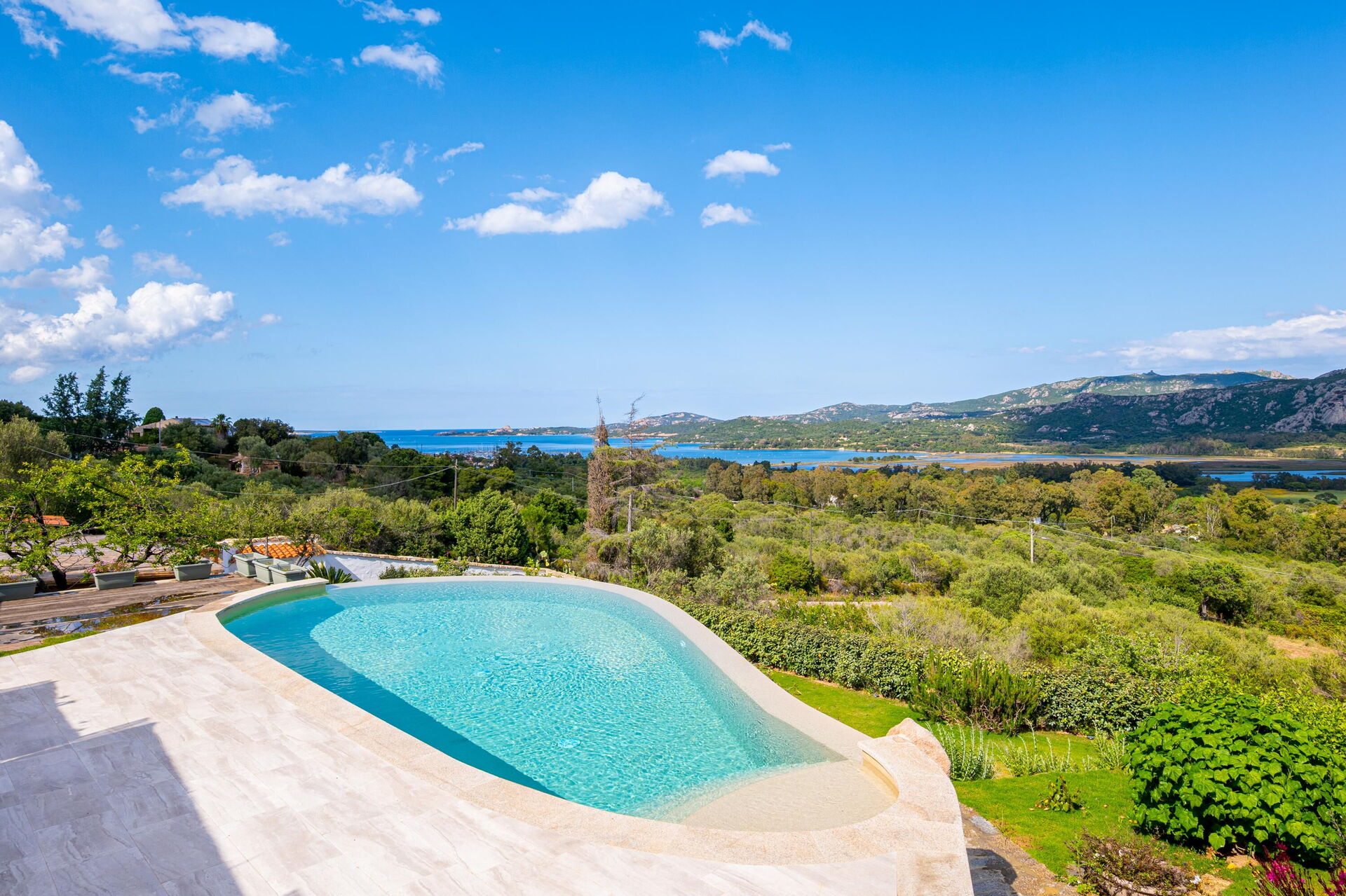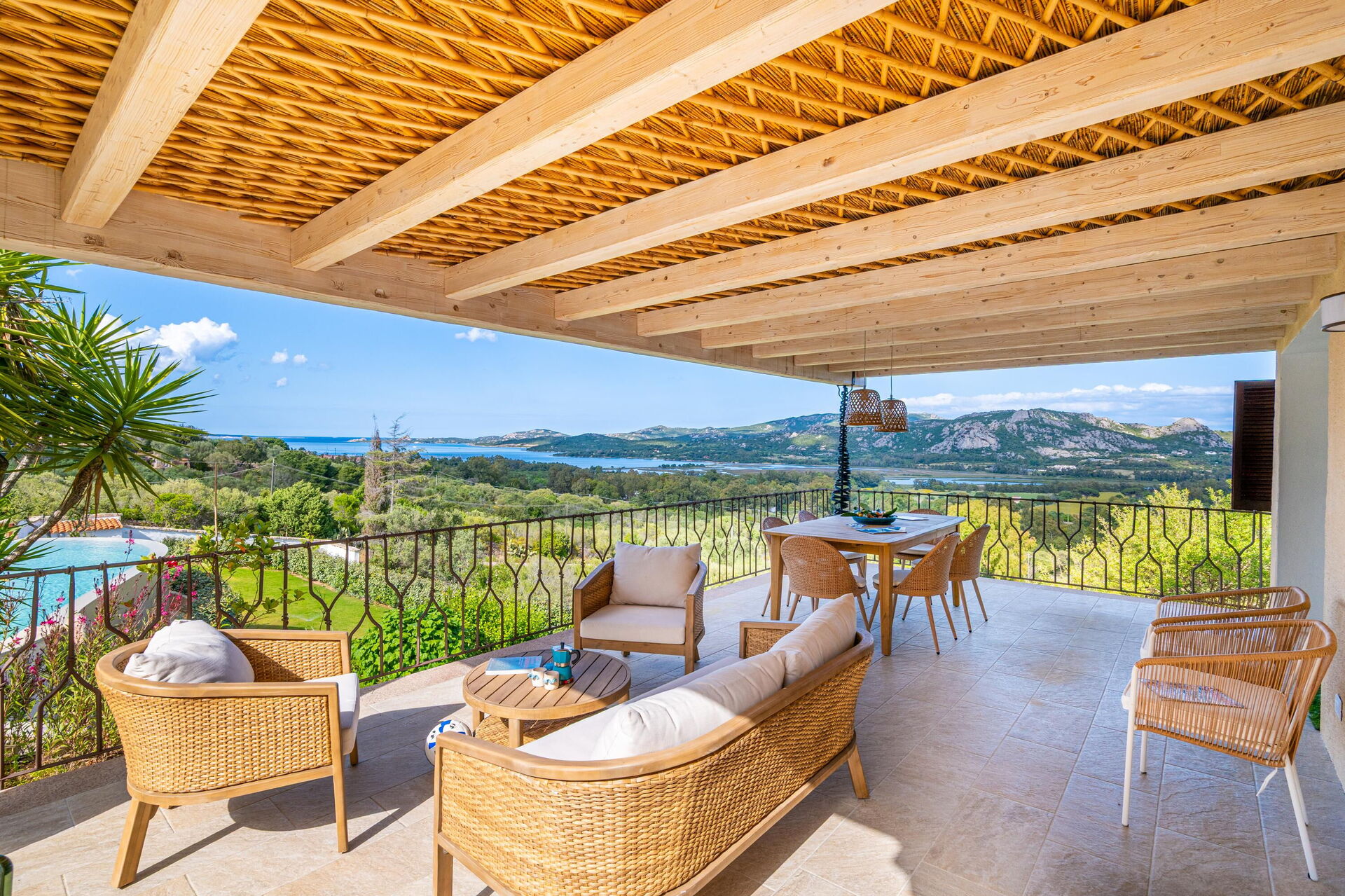 Buiten zijn er diverse schilderachtige plekken waar u samen met familie of vrienden kunt ontspannen – van het terras met eettafel en stoelen tot het ruime zwembadgedeelte met zeezicht, perfect voor onvergetelijke momenten in de zon op Sardinië.