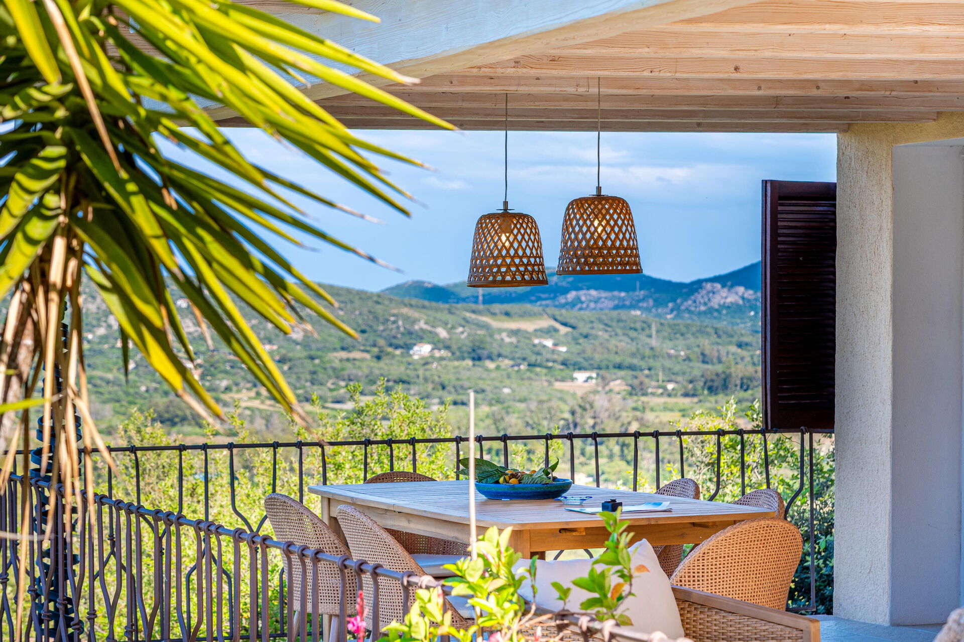 - panoramisch terras met pergola van hout en riet, met tafel en stoelen voor maaltijden buiten