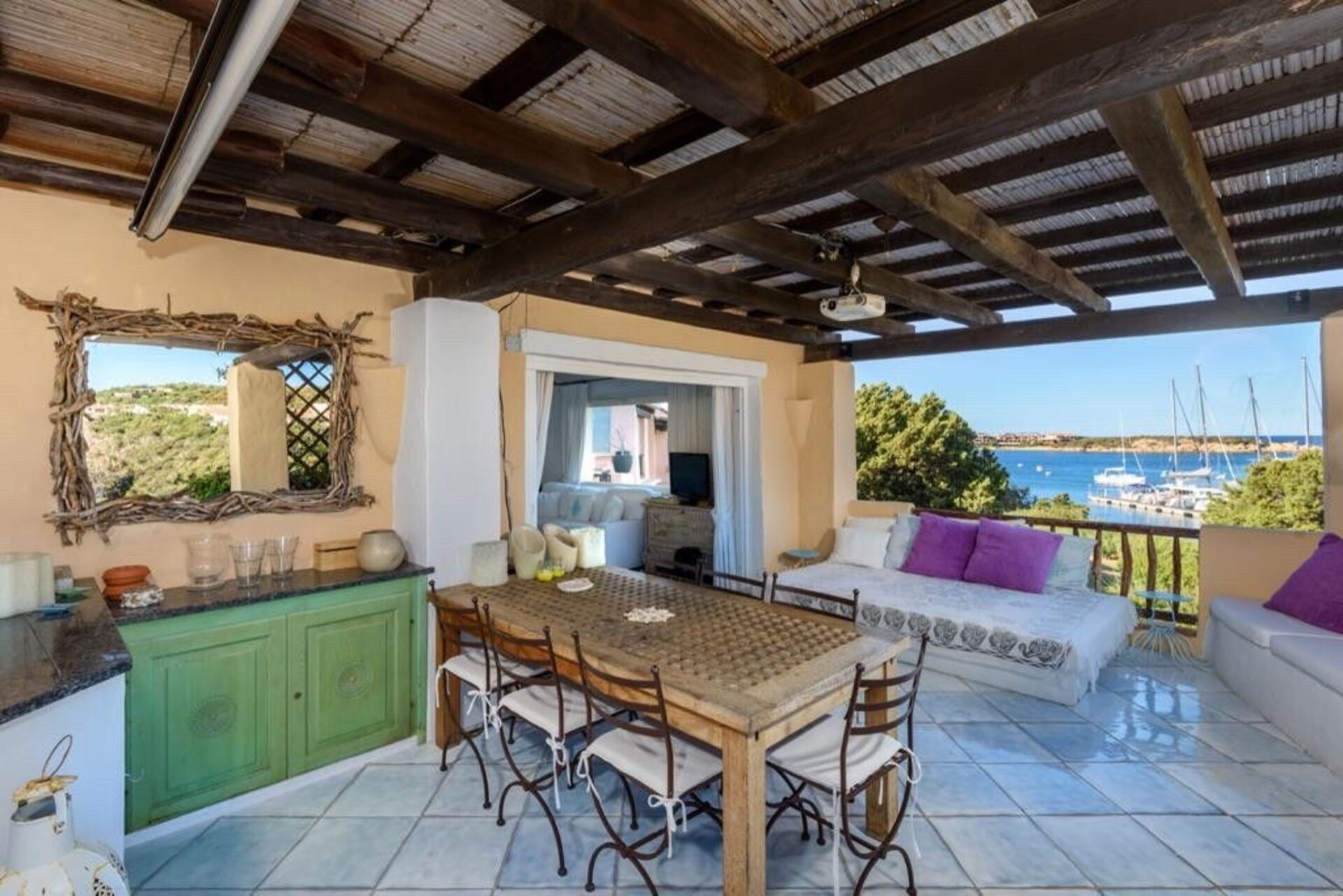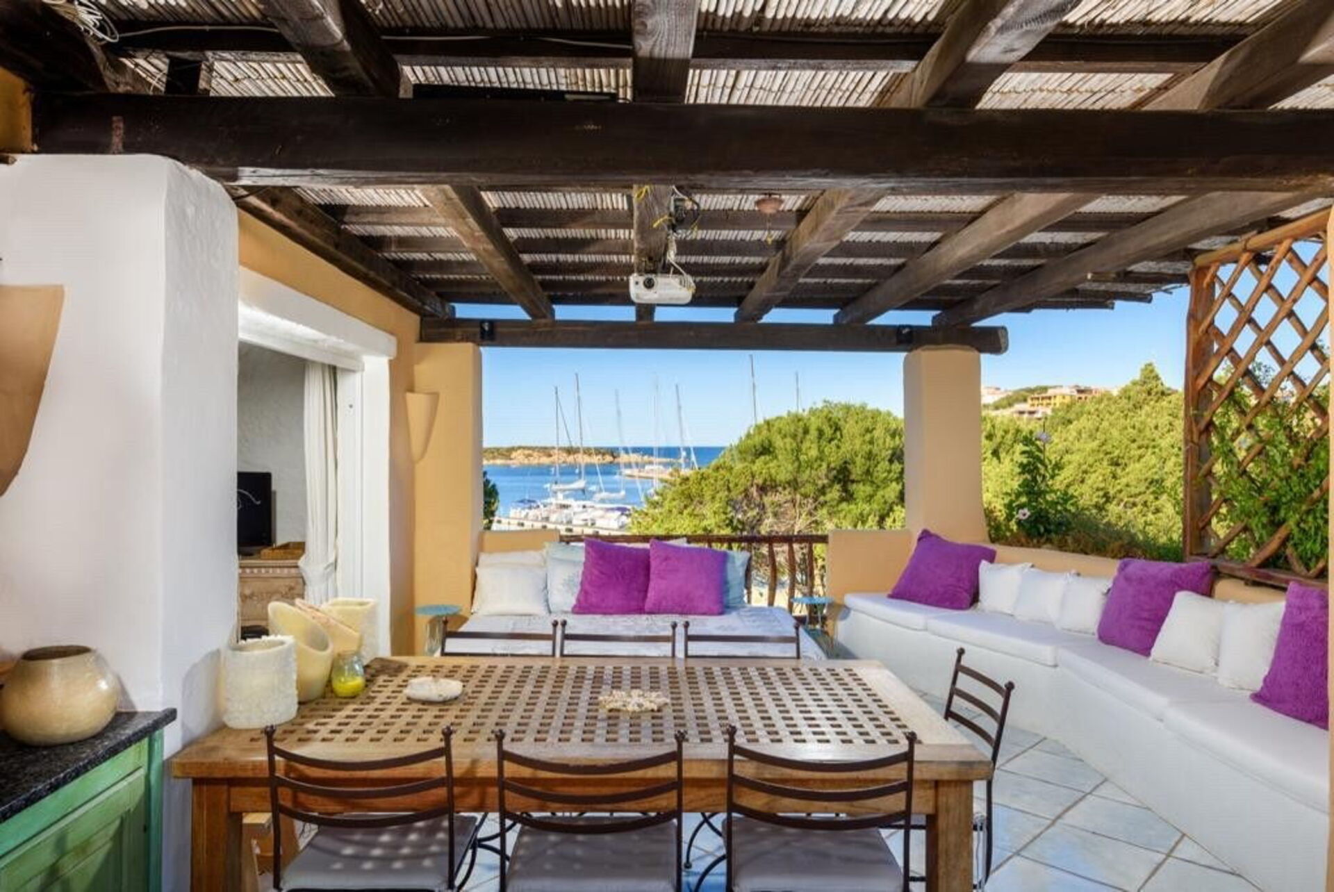 Er is een overdekte veranda met een tafel en stoelen om buiten te eten, met een prachtig uitzicht op de prachtige oude pier van de baai van Porto Corvo.