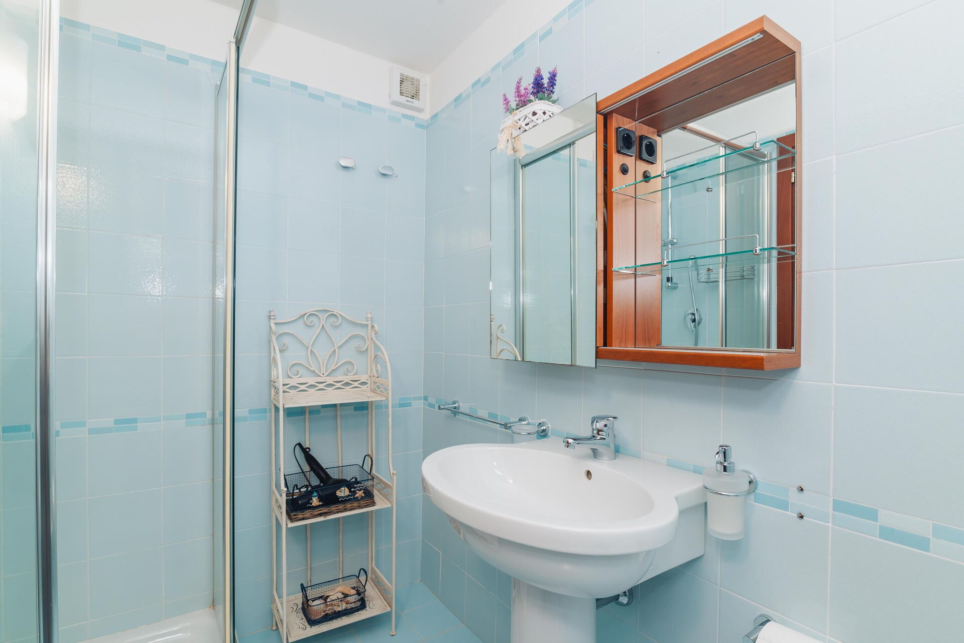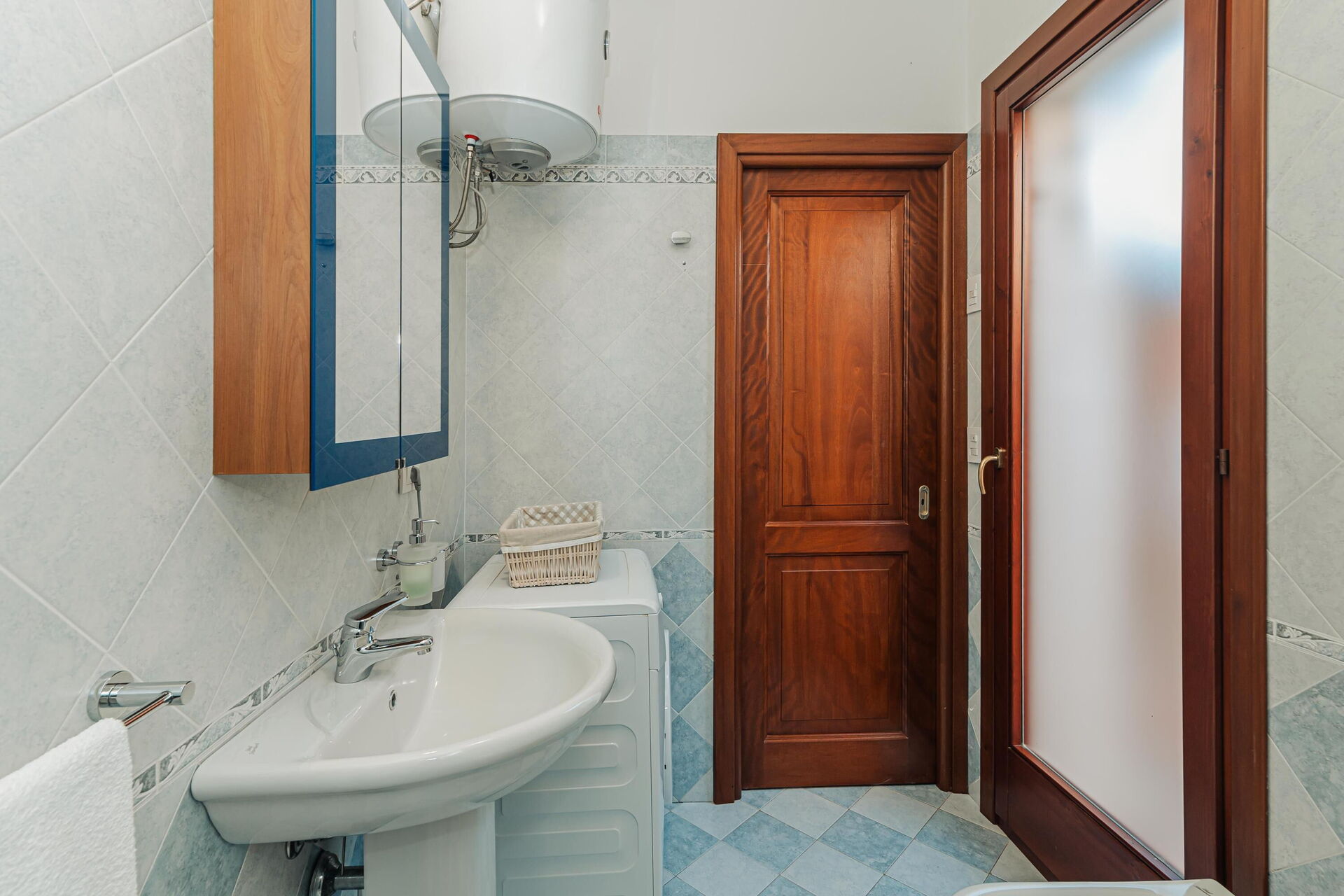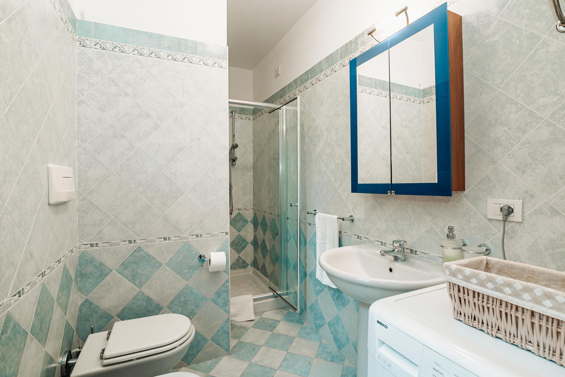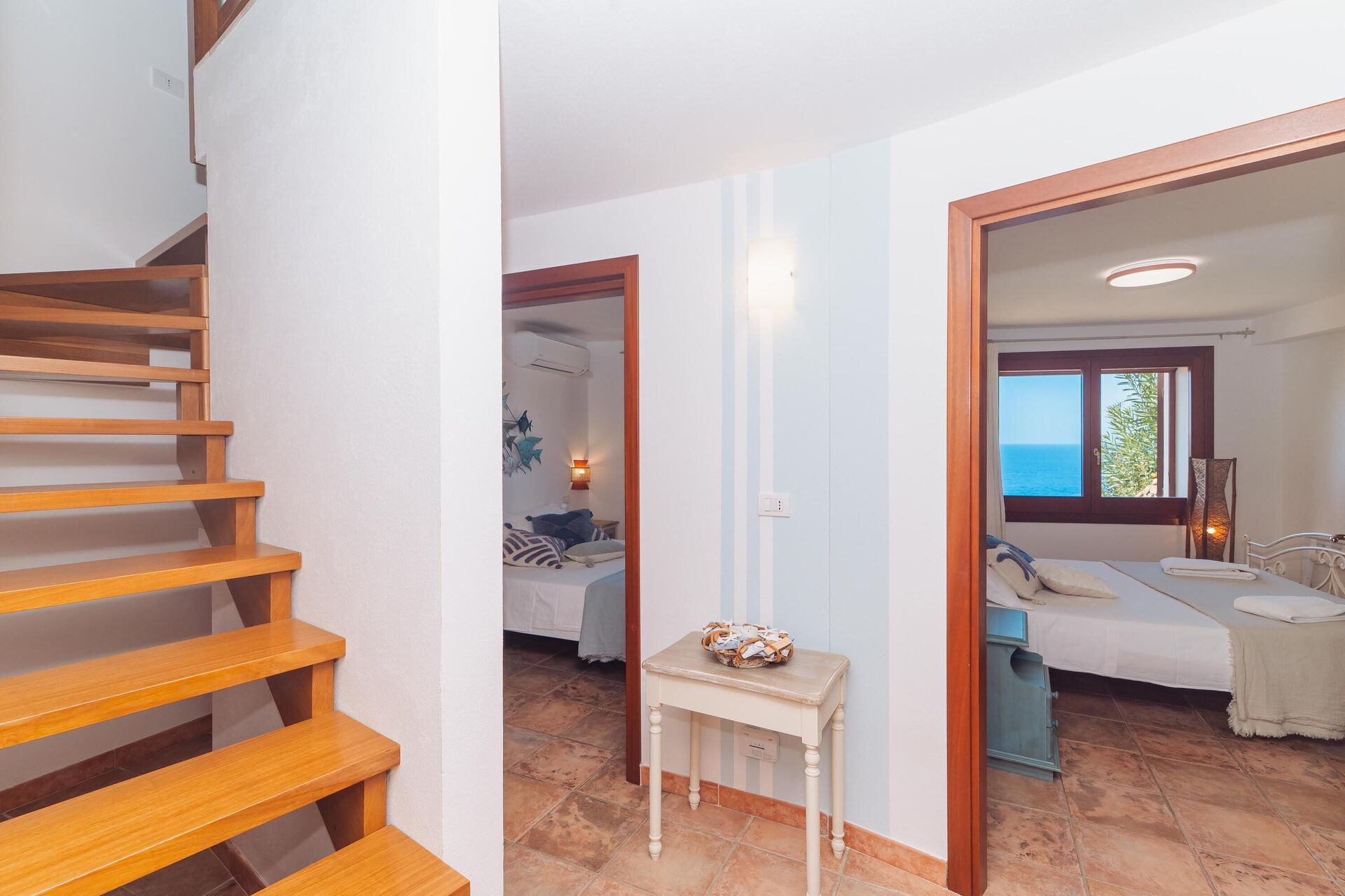 4 treden omhoog: eetkamer (airconditioning), keuken (kookplaat, oven, koelkast, vriezer, vaatwasser, magnetron, espressokoffiemachine, broodrooster), badkamer met douche (wasmachine), tweepersoonsslaapkamer (airconditioning) met toegang naar buiten, badkamer met douche.