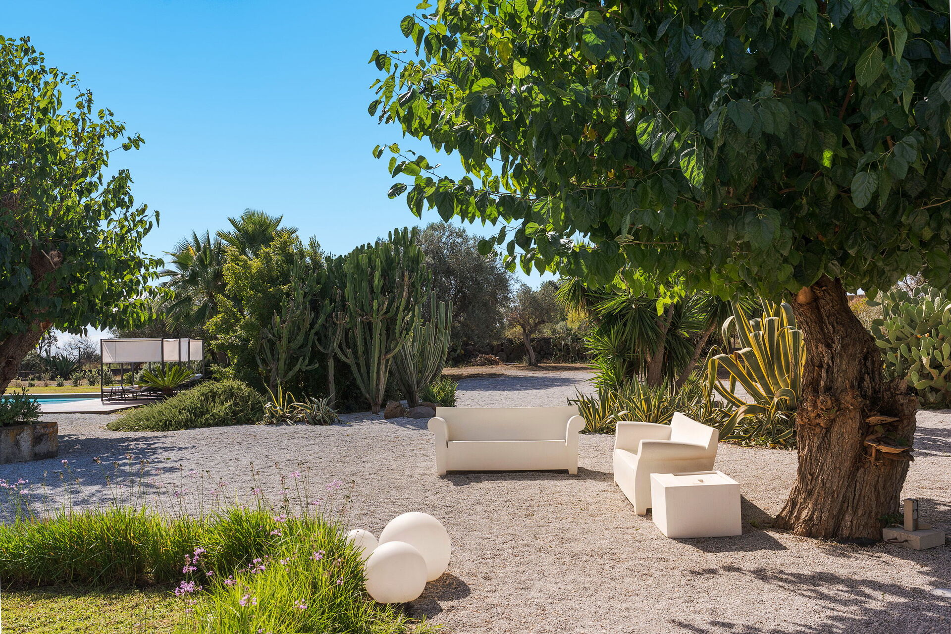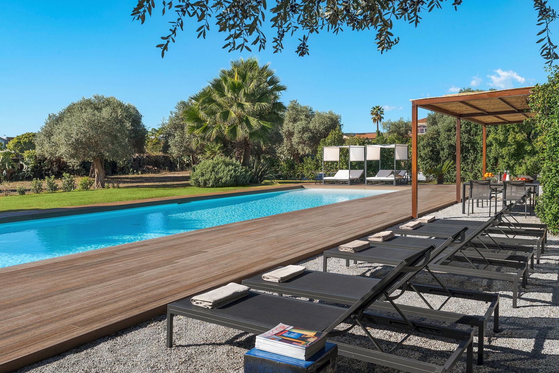 De buitenruimte is prachtig aangelegd: een mooie tuin met weelderige Siciliaanse planten omringt een groot en mooi privé zoutwaterzwembad. Bij het zwembad staan ligstoelen en parasols waar u heerlijk kunt ontspannen in de Siciliaanse zon.