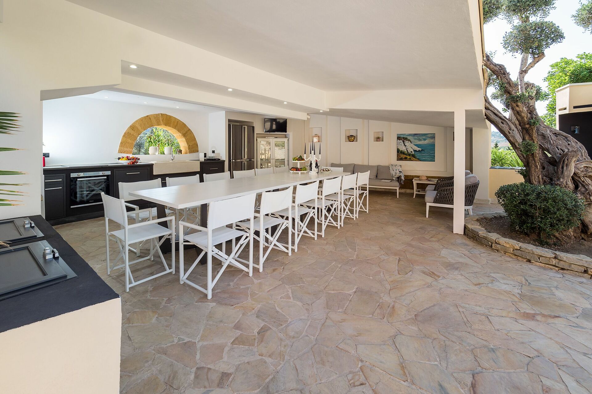 De tuin omvat ook een schaduwrijk gemeubileerd terras met een buitenkeuken (vaatwasser, magnetron en koelkast): de ideale plek waar gasten kunnen genieten van een diner in de buitenlucht.