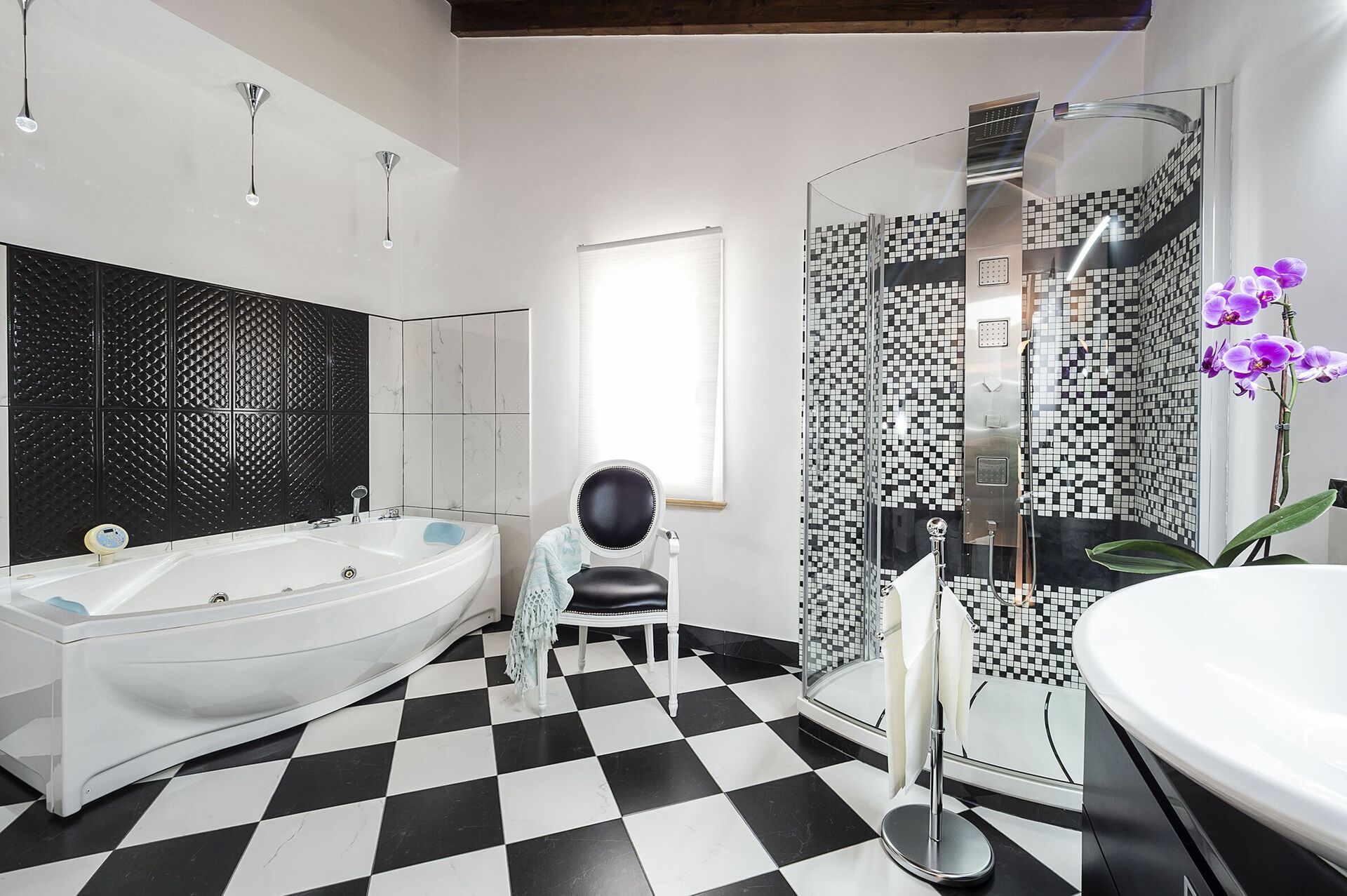 Eerste verdieping (bereikbaar via een open trap en een lift): hoofdslaapkamer met een luxe en-suite jacuzzi en whirlpooldouche en een tweede slaapkamer met een Frans bed en badkamer.