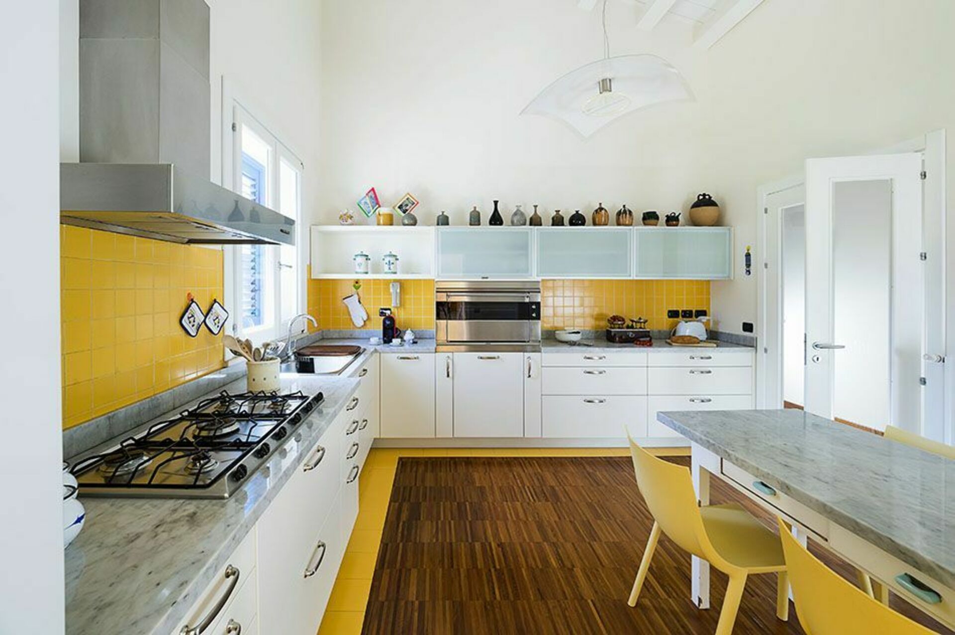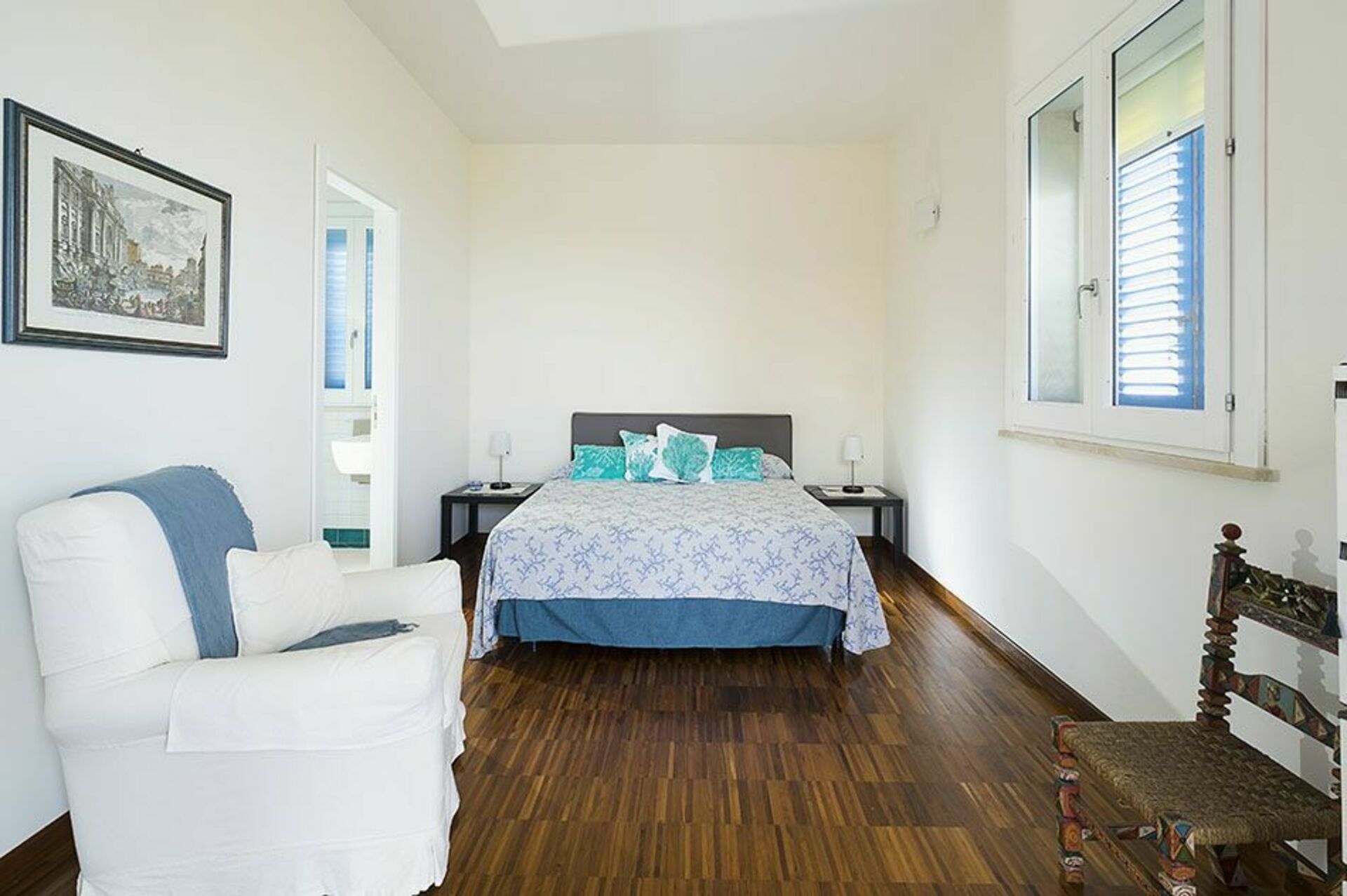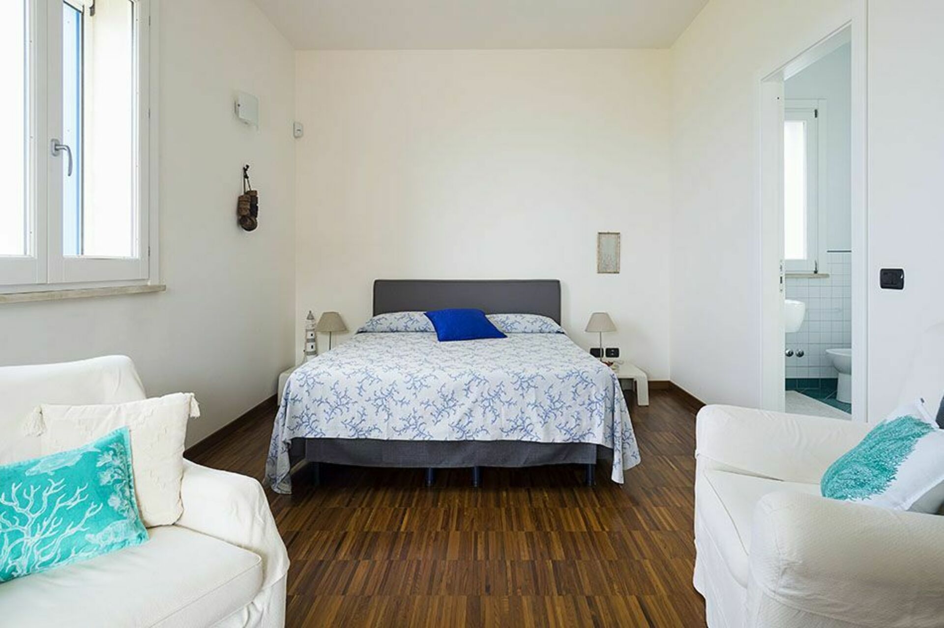Alles is gelegen op één niveau: de comfortabele, smaakvol ingerichte interieurs van de vakantievilla omvatten een lichte woon-/eetkamer, een studeerkamer, een keuken, vier slaapkamers met en-suite badkamer en een vijfde kleine badkamer.