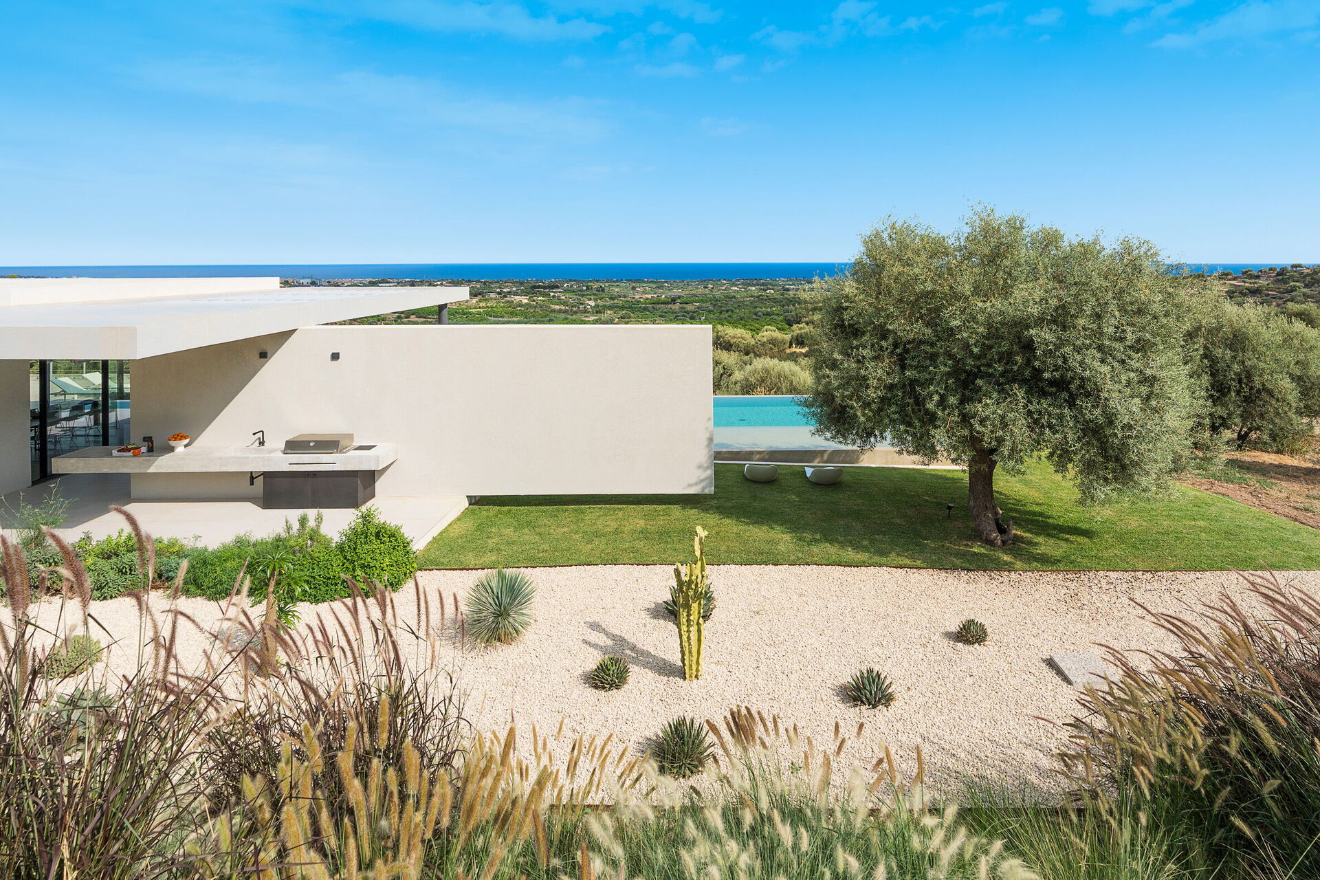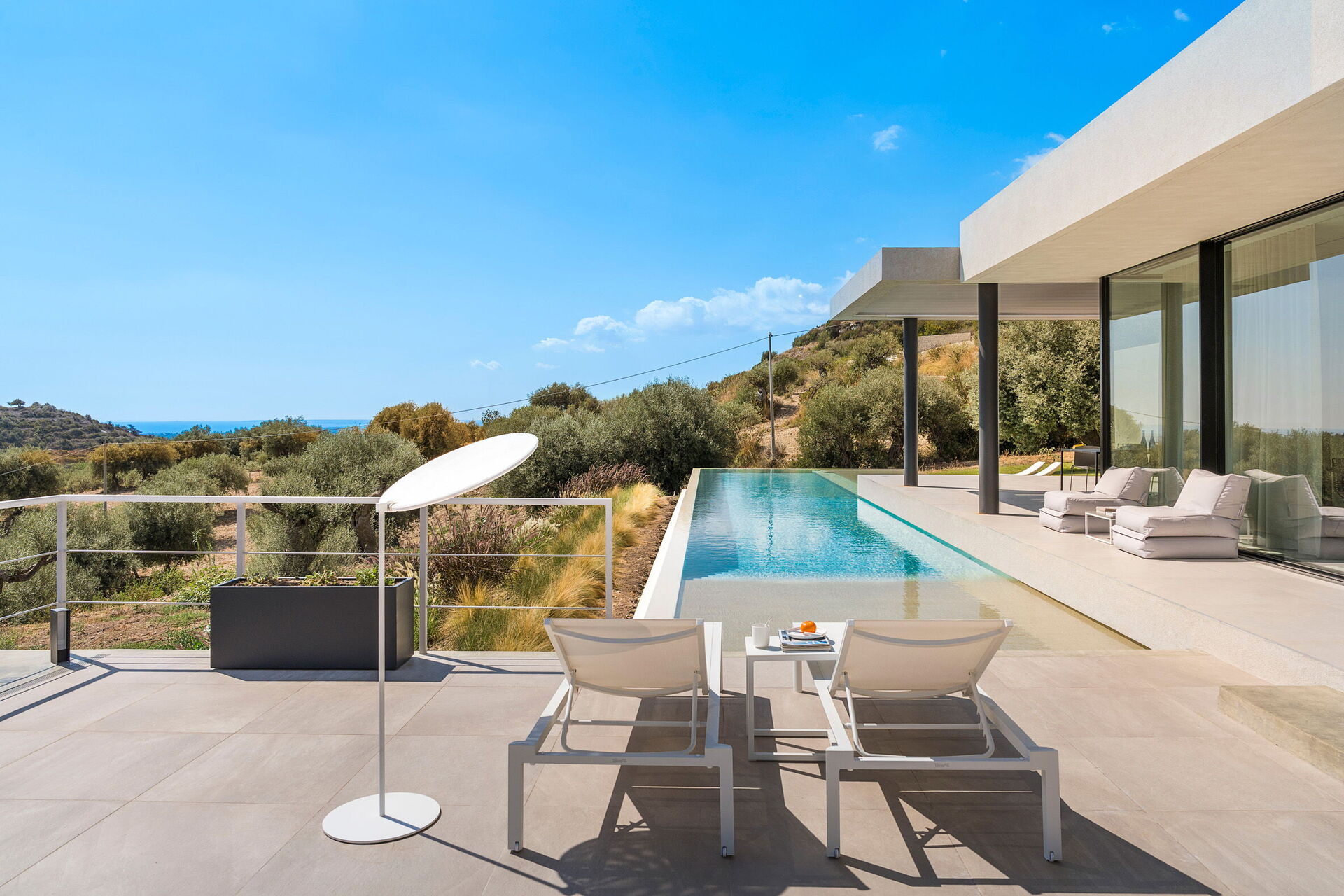 De villa is modern en exclusief, met een schilderachtige ligging. Vanaf het zwembad en de grote terrassen in de tuin geniet je van een spectaculair panoramisch uitzicht op zee.