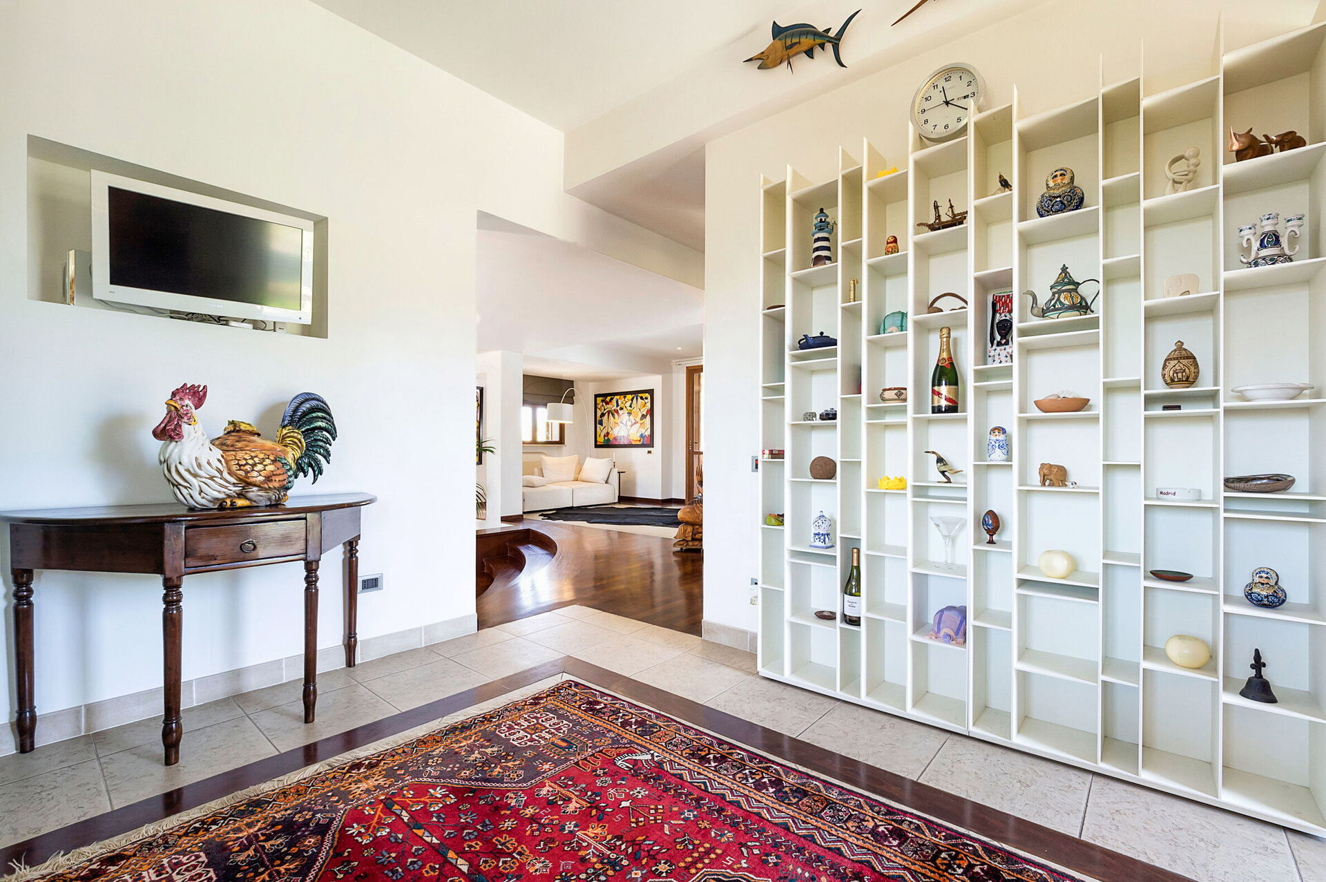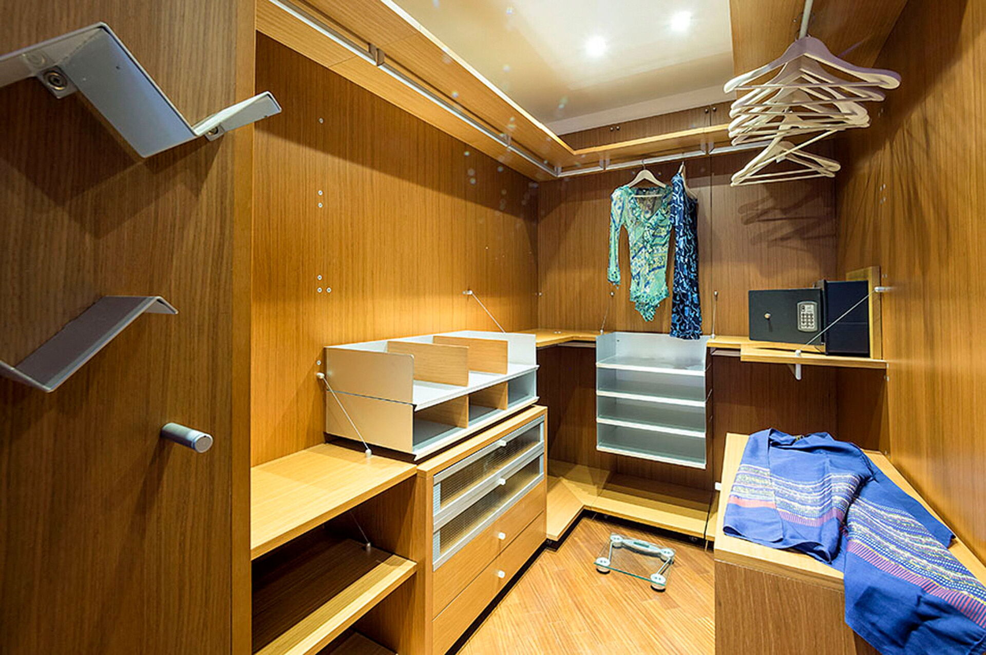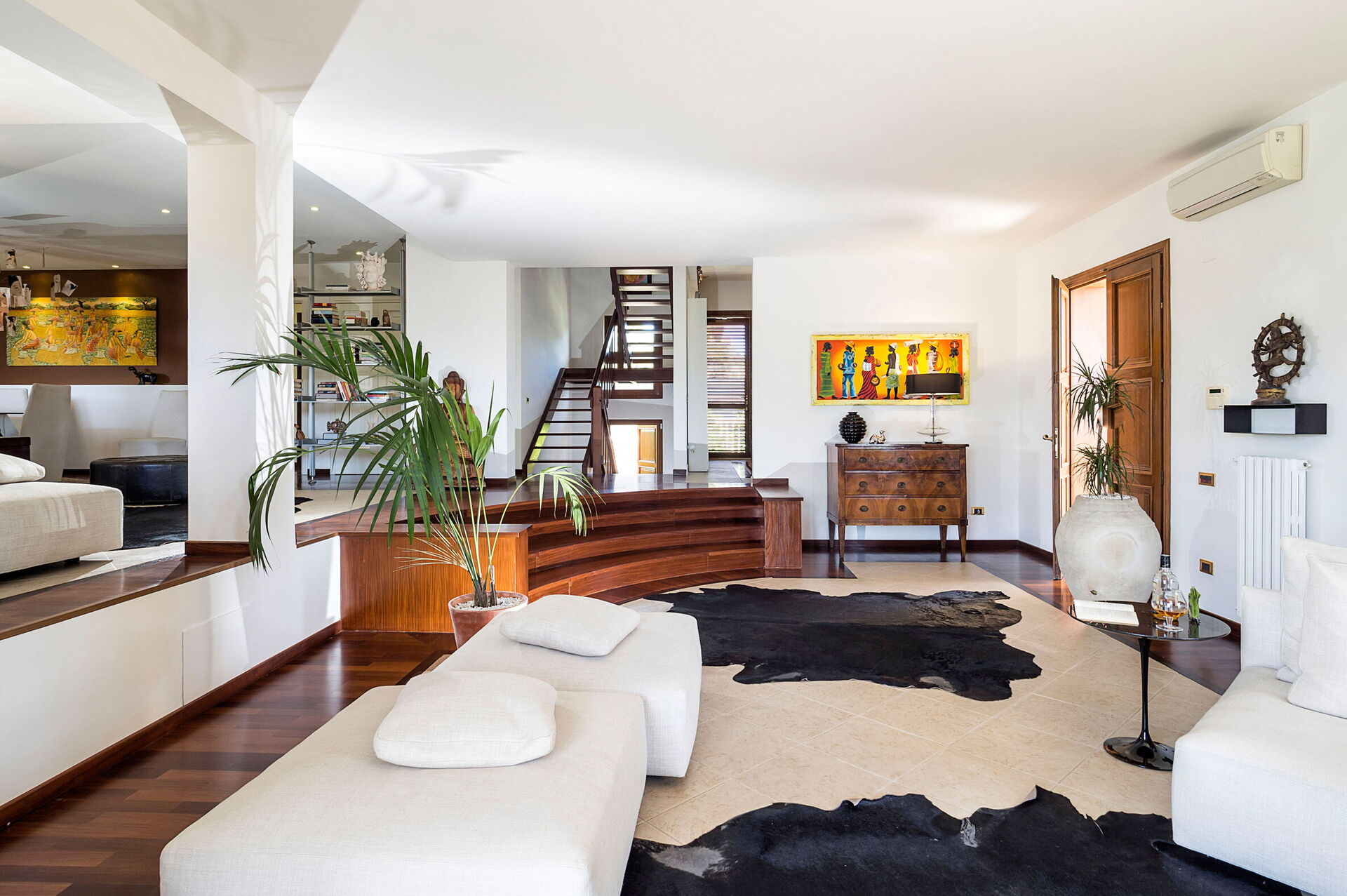 4 treden omhoog: woonkamer, keuken (oven, vriezer, koelkast, vaatwasser, kookplaat, magnetron, broodrooster, Amerikaanse koffiezetapparaat, espressomachine) met eethoek, tweepersoonsslaapkamer met inloopkast, badkamer met douche, badkamer met whirlpoolbad.
