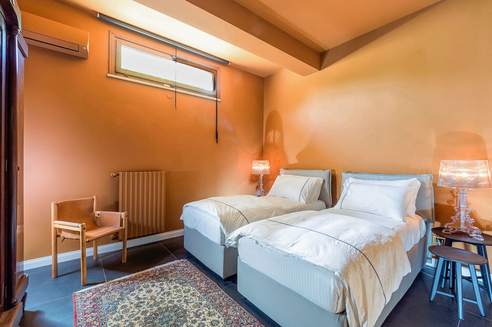Onderste eerste verdieping: tweepersoonsslaapkamer met privébadkamer met douche, slaapkamer met 2 eenpersoonsbedden, badkamer met douche, massageruimte, wasruimte.