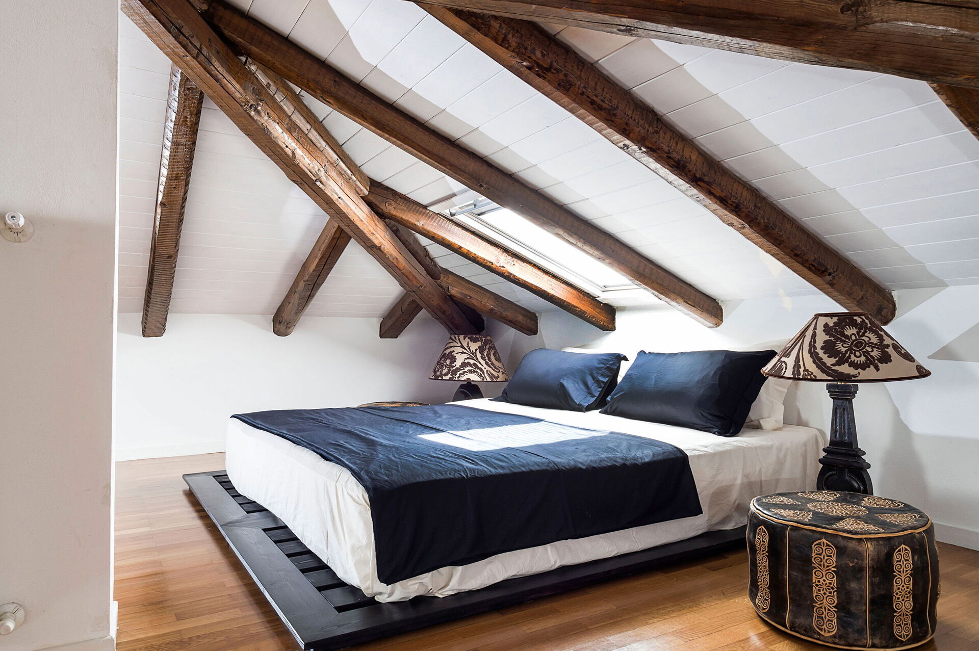 Eerste verdieping (zolder): tweepersoonsslaapkamer, badkamer met ligbad.