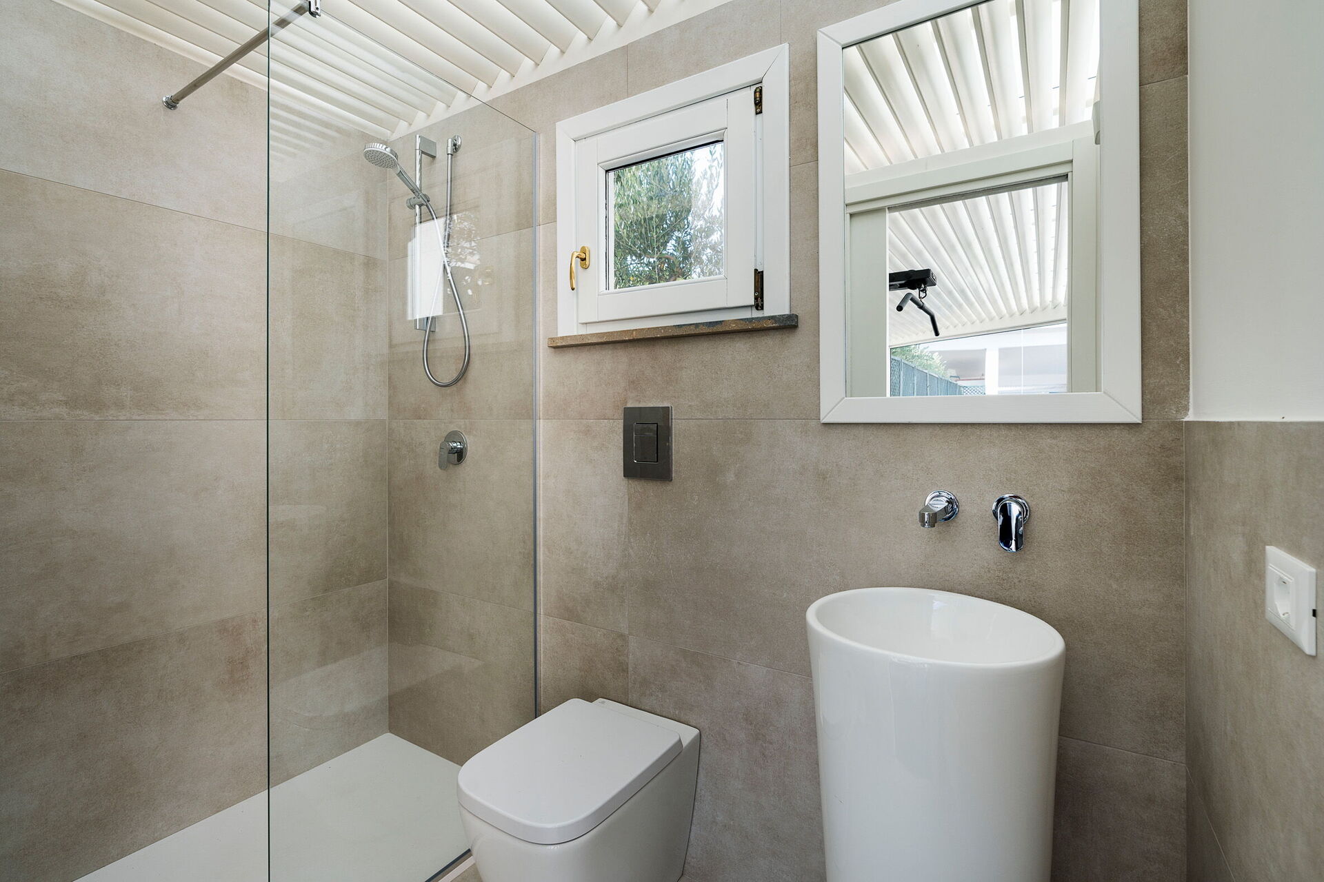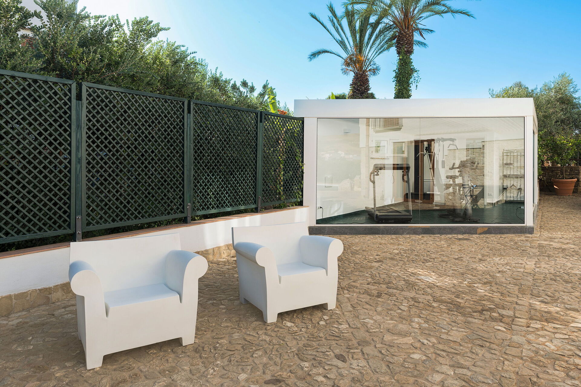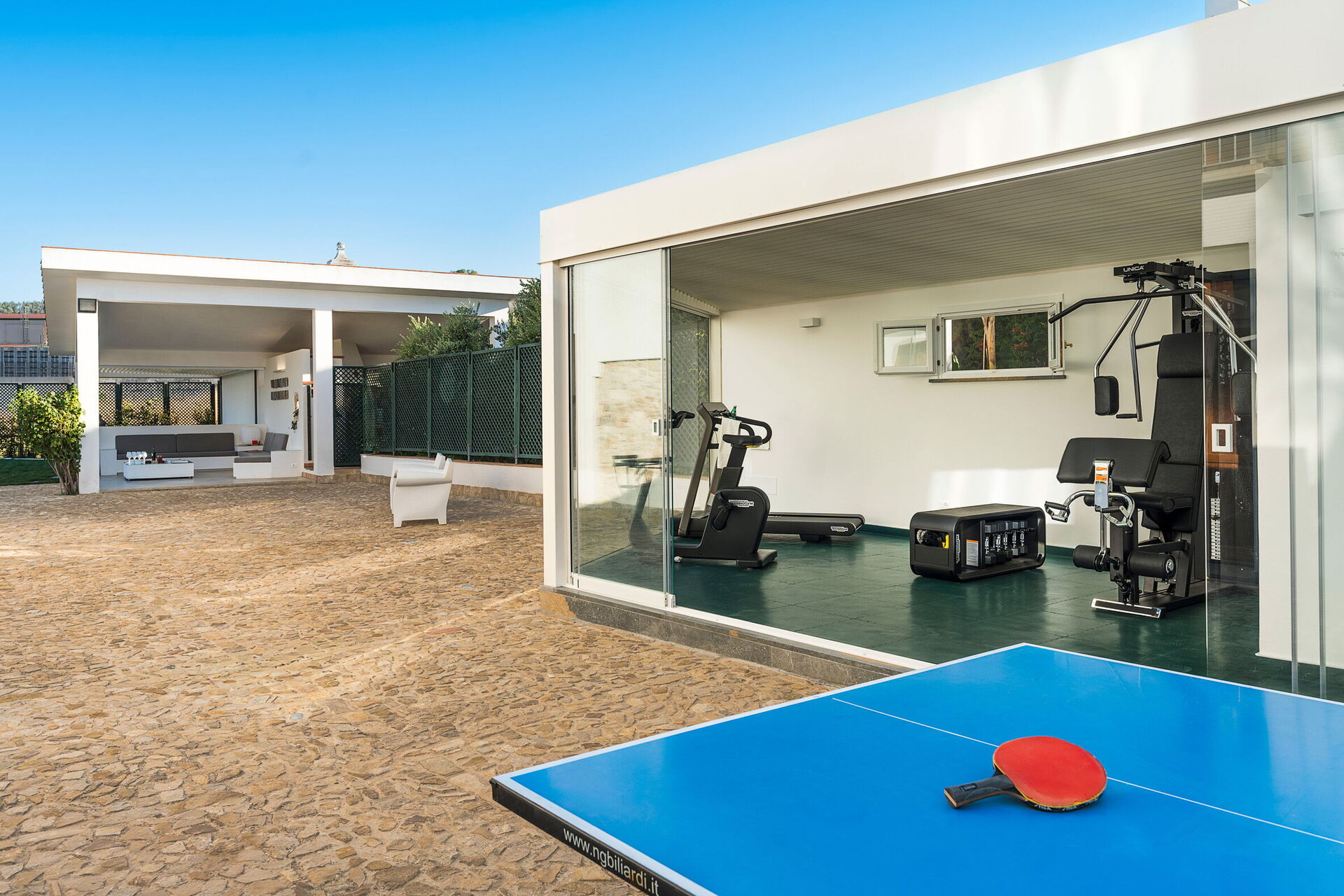 Exterieur: Loggia, eethoek, terrassen, tuin, zwembad, solarium, fitnessruimte met badkamer-douche.
