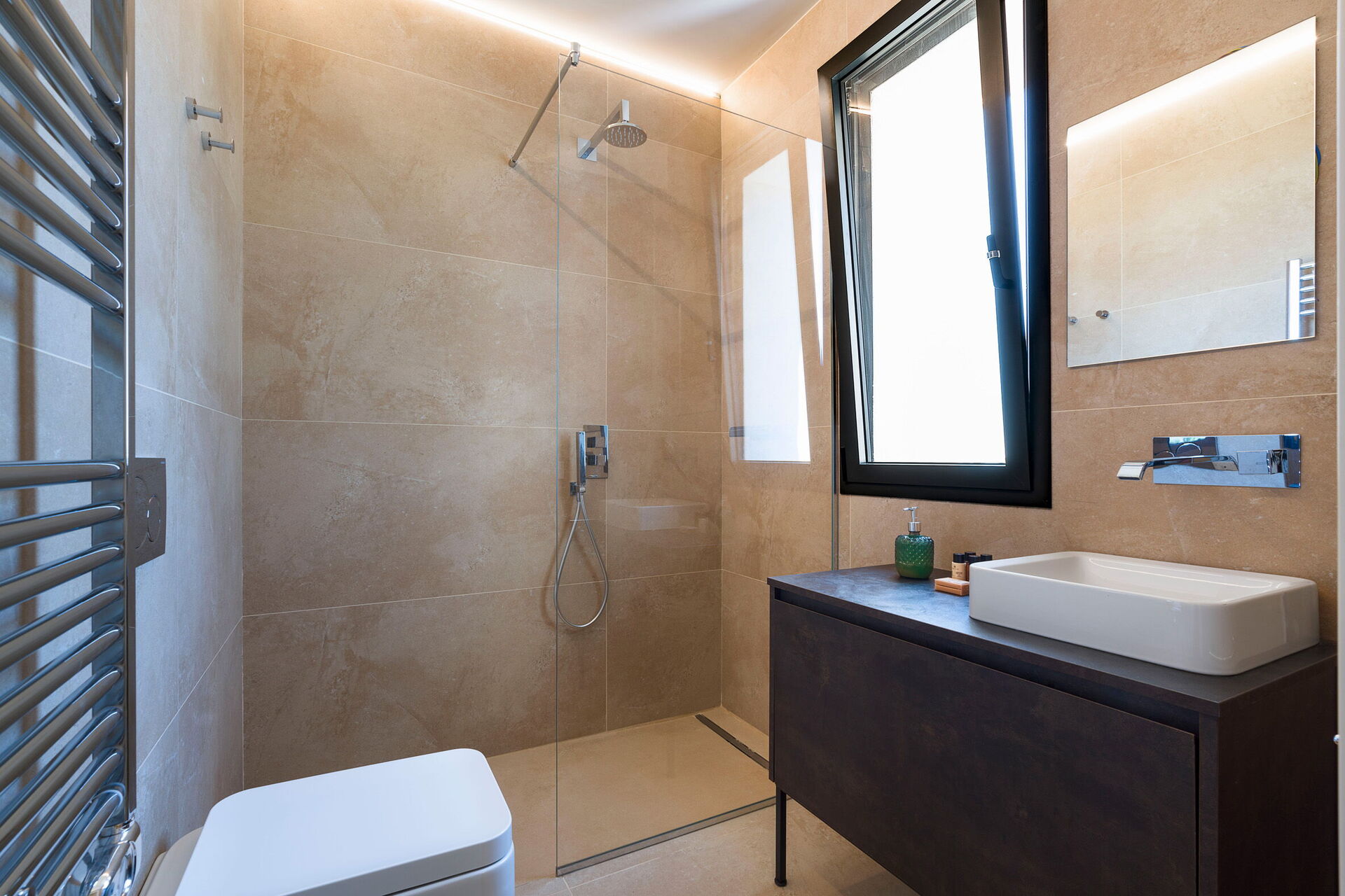 Begane grond: woonkamer met panoramisch uitzicht (TV) met eetkamer, keuken (kookplaat, oven, vriezer, koelkast, vaatwasser, koffiezetapparaat, broodrooster), slaapkamer met 2 eenpersoonsbedden (airconditioning), badkamer met douche, 2 tweepersoonsslaapkamers (airconditioning) met elk een eigen badkamer met douche.