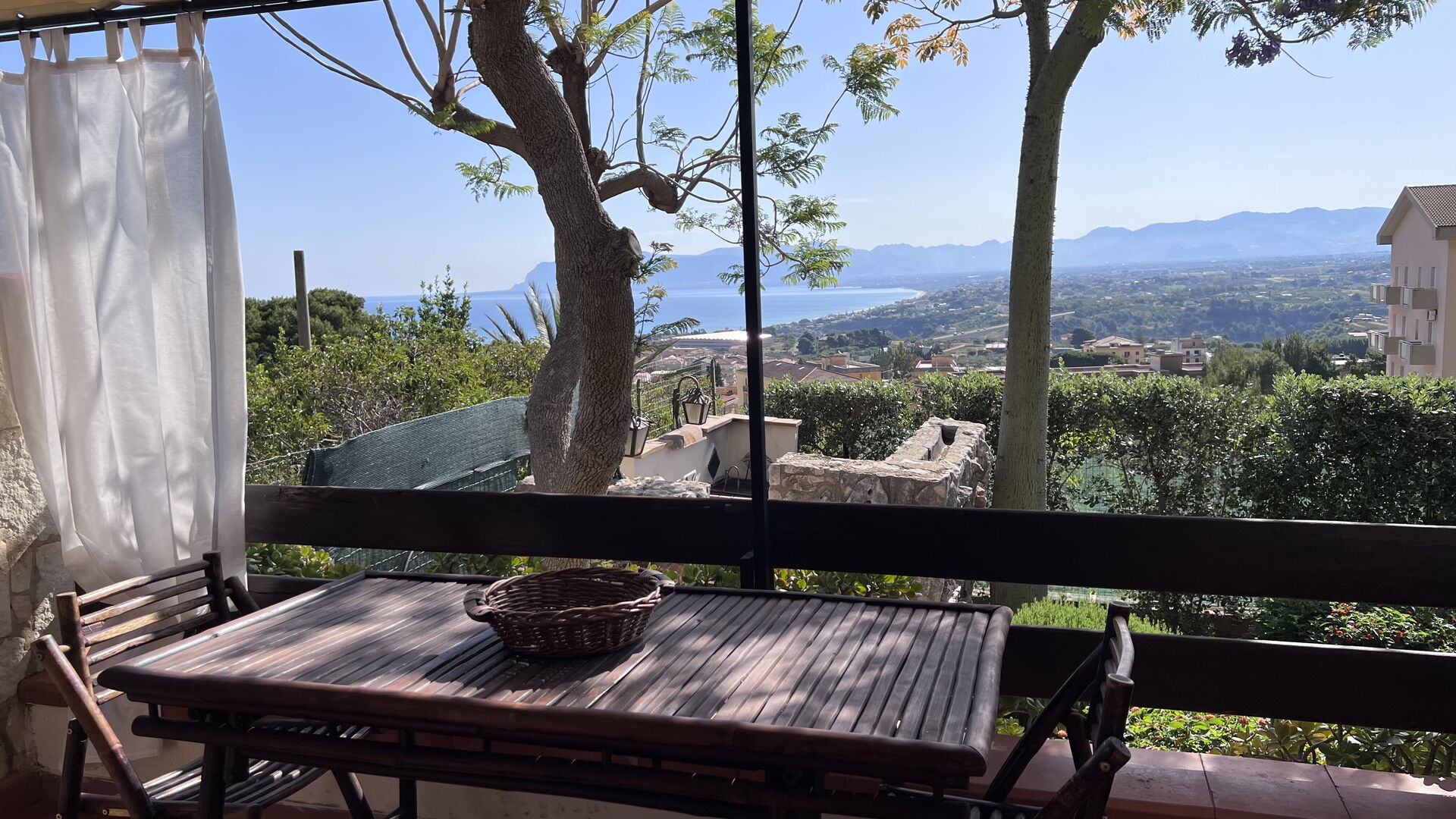 Zonnige veranda met panoramisch uitzicht over de kustlijn.