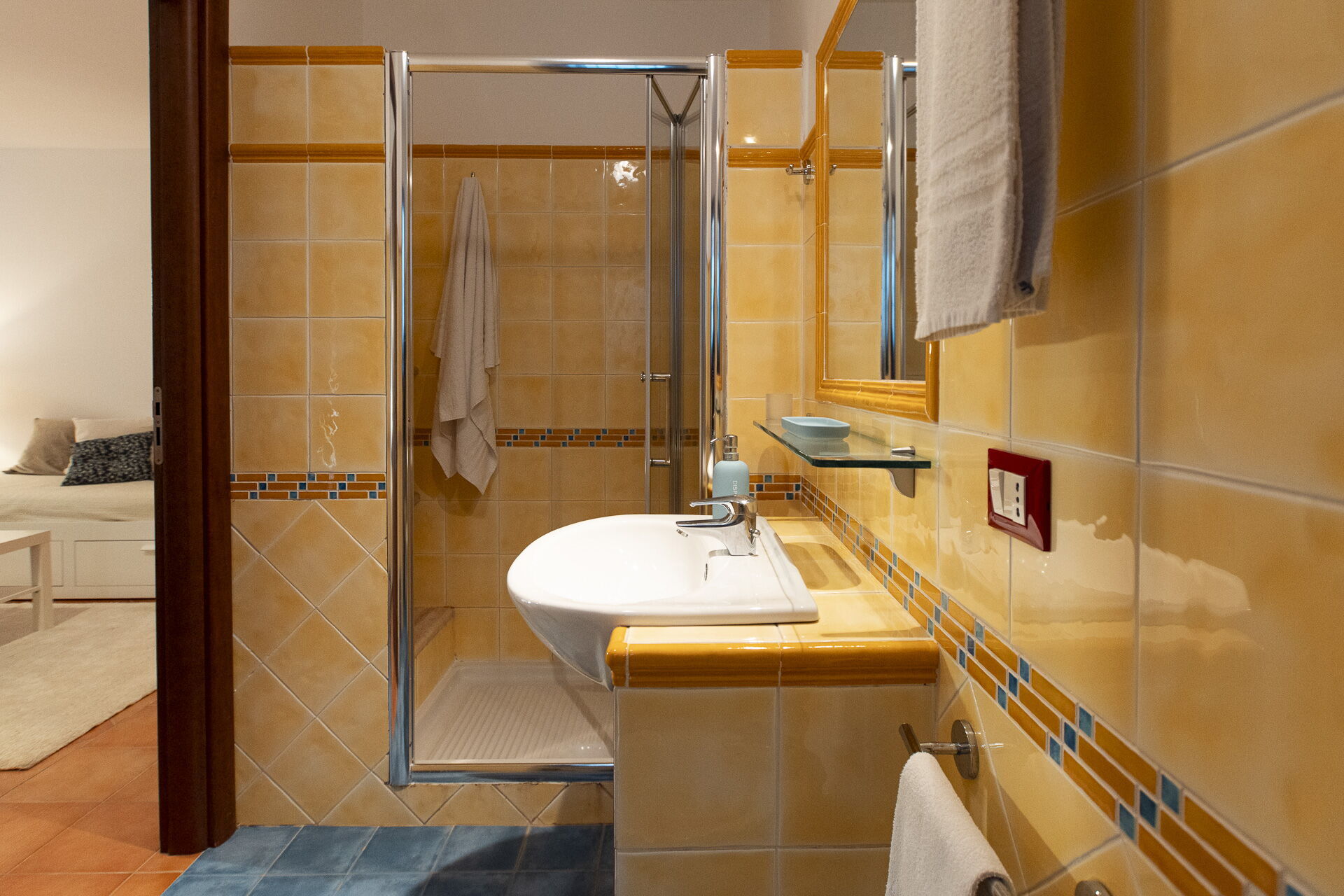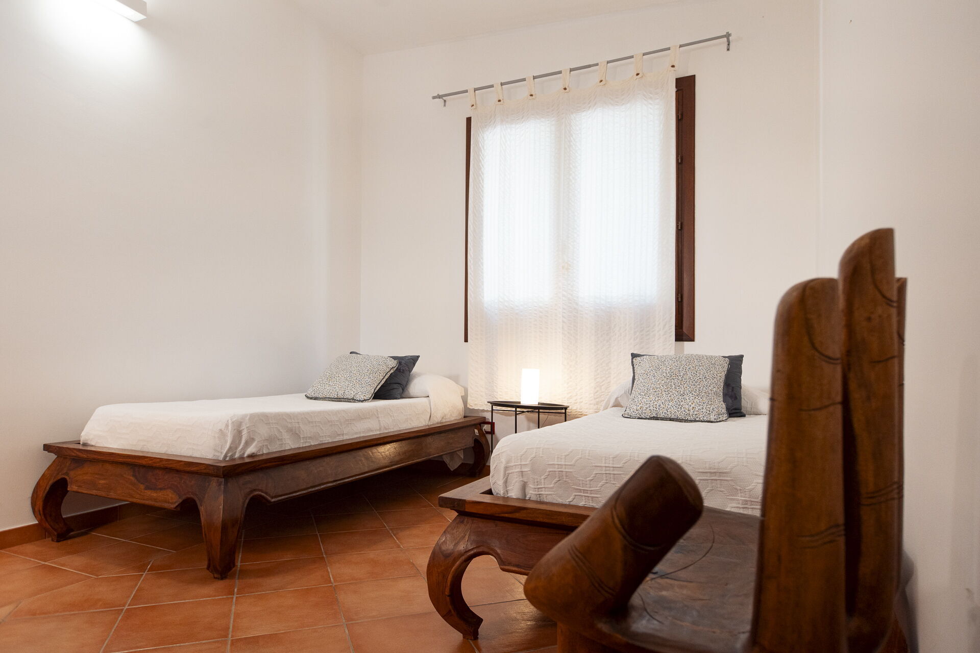 Benedenverdieping (van binnen bereikbaar via een wenteltrap, of van buitenaf: tweepersoonsslaapkamer (airconditioning) met tweepersoonsslaapbank en eigen badkamer met douche.