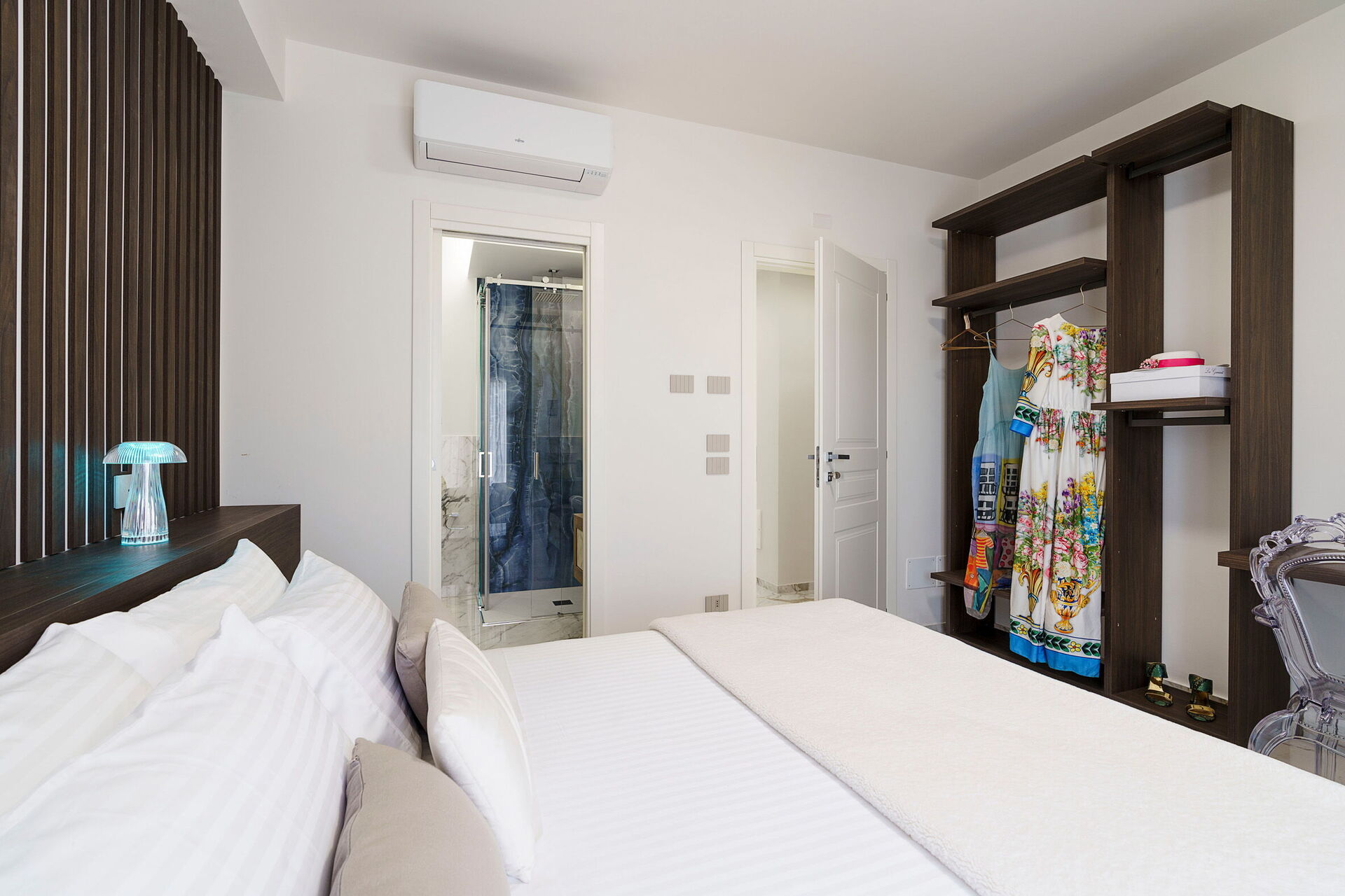 Eerste verdieping: woonkamer (airconditioning, smart TV) met eethoek, keuken (kookplaat, oven, koelkast, vriezer, vaatwasser, broodrooster, espressomachine, Amerikaans koffiezetapparaat), wc, wasruimte , slaapkamer met tweepersoonsbed (airconditioning, kingsize bed) met eigen badkamer met douche, slaapkamer met tweepersoonsbed (airconditioning) met eigen badkamer met douche.