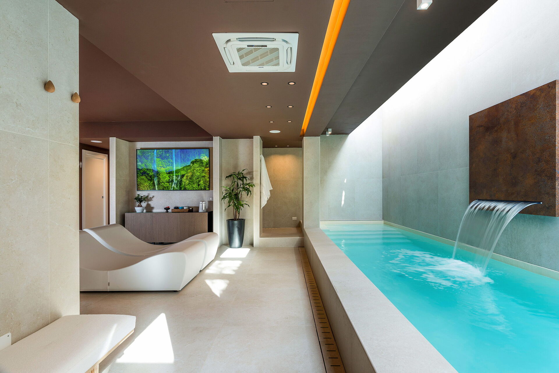 • privé binnenzwembad met waterval en whirlpoolhoek (9 x 2 meter; diepte: 1,2 meter) dat op aanvraag tot 28°C kan worden verwarmd (zonder extra kosten)