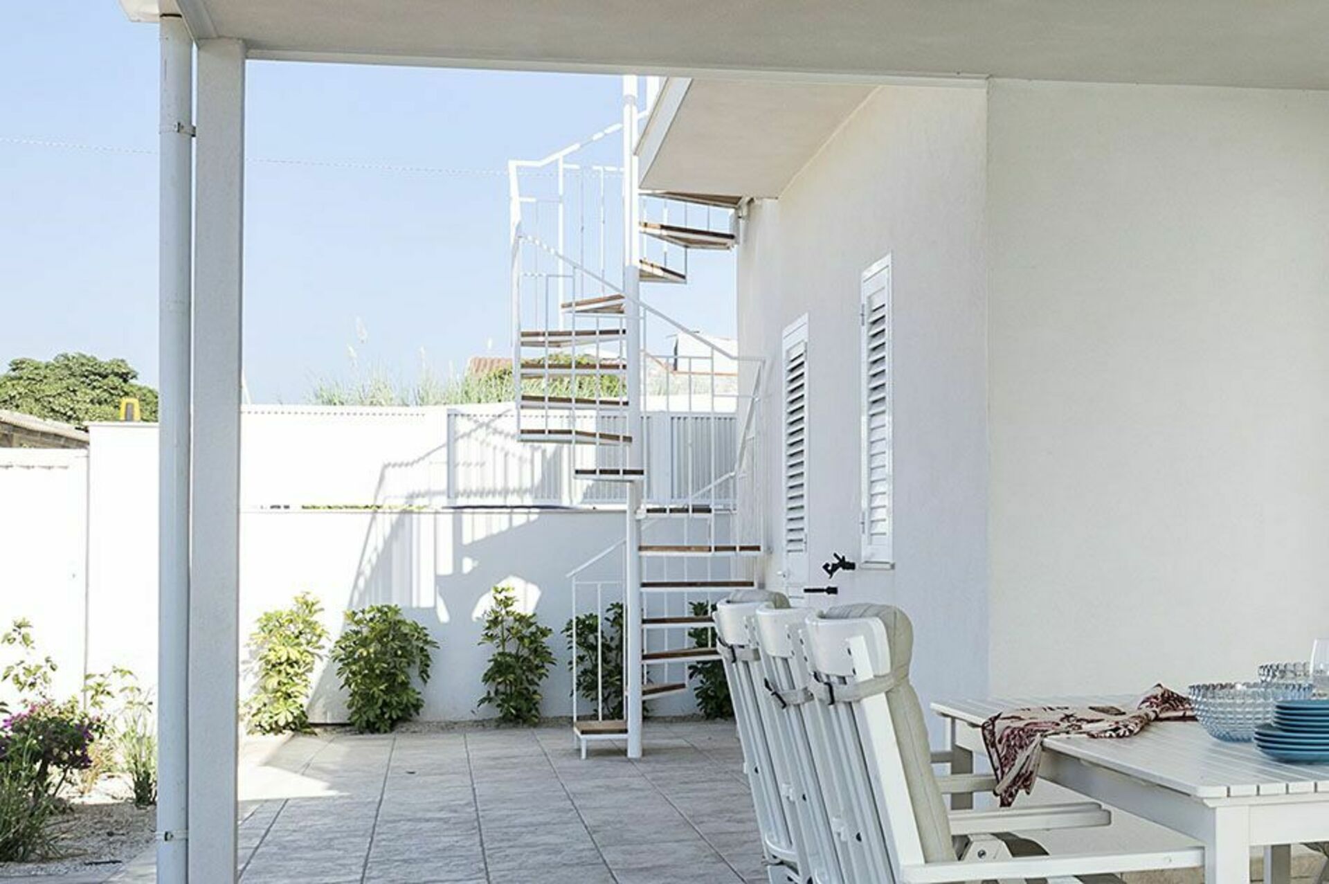 Eerste verdieping (bereikbaar via een buitentrap): keuken/woonkamer, 1 tweepersoonskamer, 1 éénpersoonskamer, 1 badkamer met douche. Panoramisch terras met uitzicht op zee.
